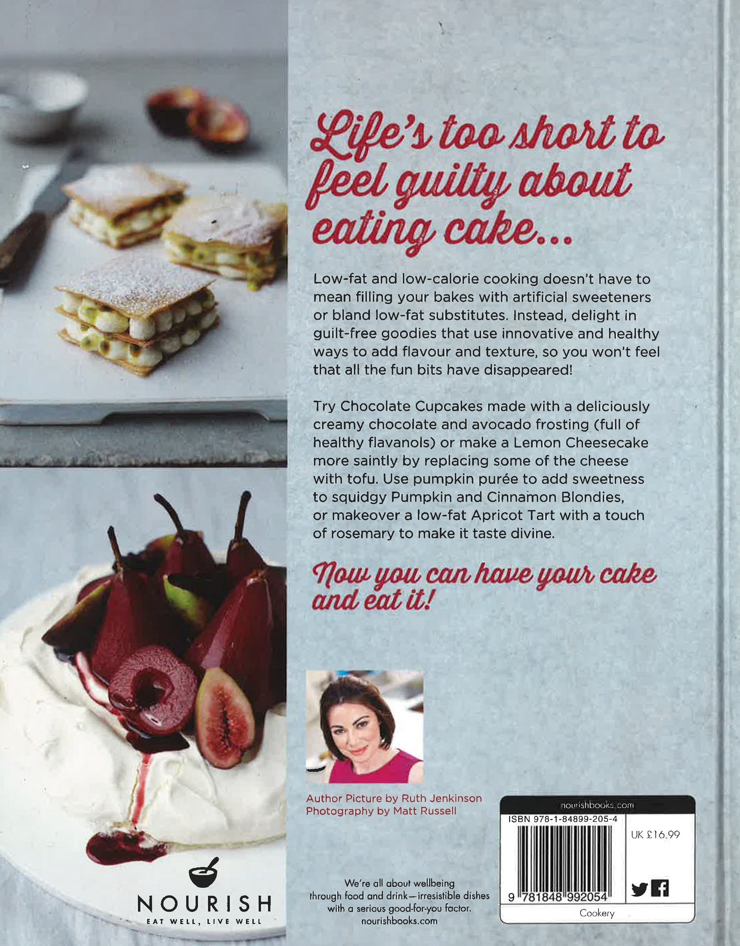Life's too short to feel guilty about eating cake Low-fat and low-calorie baking doesn't have to mean filling your cakes with artificial sweeteners or bland low-fat substitutes. Instead, delight in guilt-free goodies that use innovative and healthy ways to add flavour and texture, so you won't feel that all the fun bits have disappeared! Gee Charman is from the new school of low-fat baking. Focusing on using healthy ingredients with fantastic flavours, as well as good fats that actually help you to lose weight, she gives you cakes and cookies, tarts and tray bakes, and fondants and frostings that you can eat to your heart's content. Rather than filling her bakes with artificial sweeteners or bland low-fat substitutes, she finds ingenious ways to add flavour and texture to low-fat cakes. Try Chocolate Cupcakes, for example, made with a delicious melted dark chocolate and avocado frosting (full of healthy flavanols and essential fatty acids), use tofu to create a soft, creamy Raspberry Ripple Cheesecake, or add rosemary to a low-fat Plum & Almond Tart to make it taste divine. Whether you want to whip up a simple treat for a rainy day, create a show-stopping spread for a party, or enjoy a romantic, indulgent dessert, this book will show you how you can have your cake and eat it!