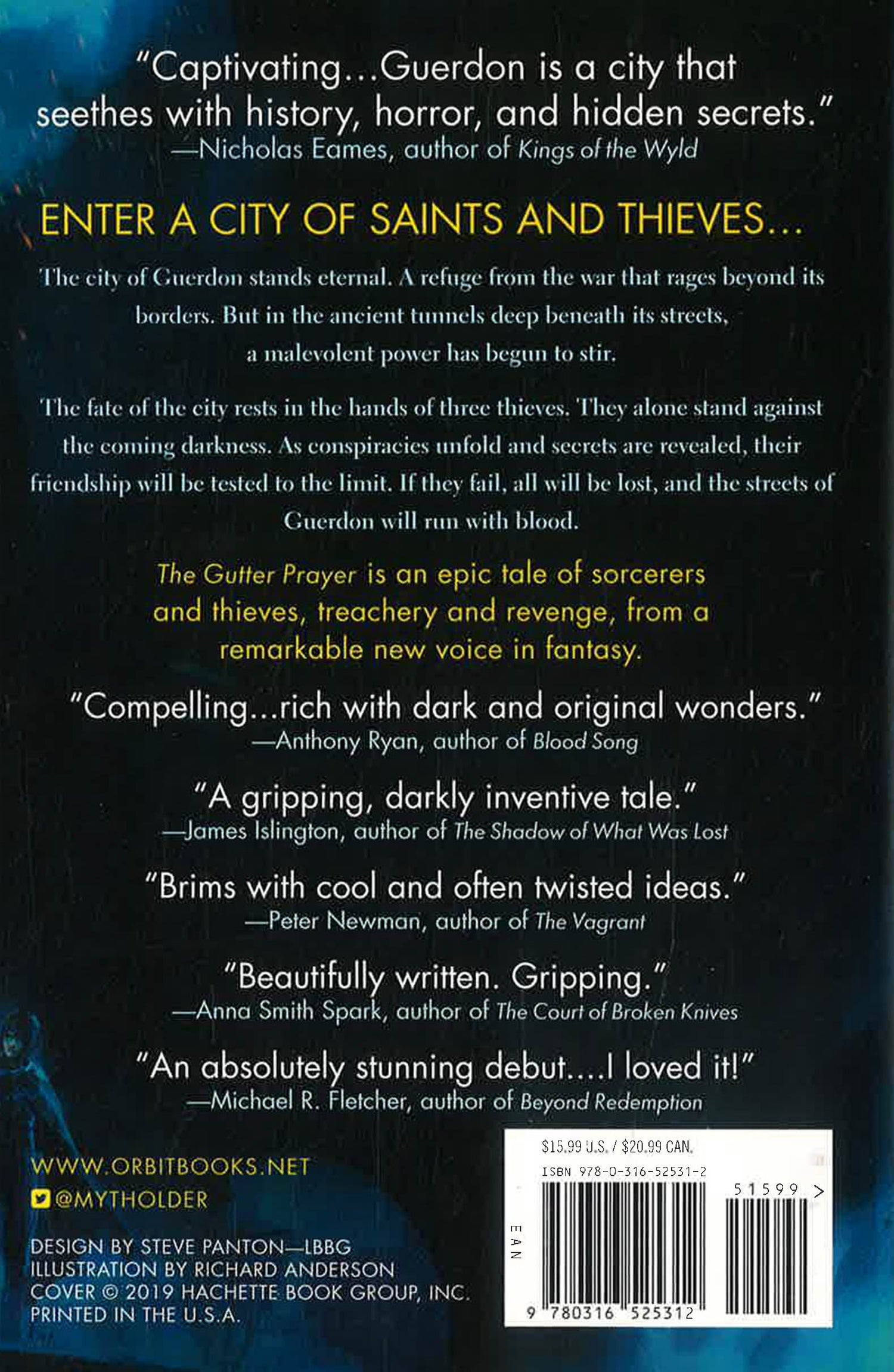 "The Gutter Prayer is captivating and complex. Guerdon is a city that seethes with history, horror, and hidden secrets" (Nicholas Eames).