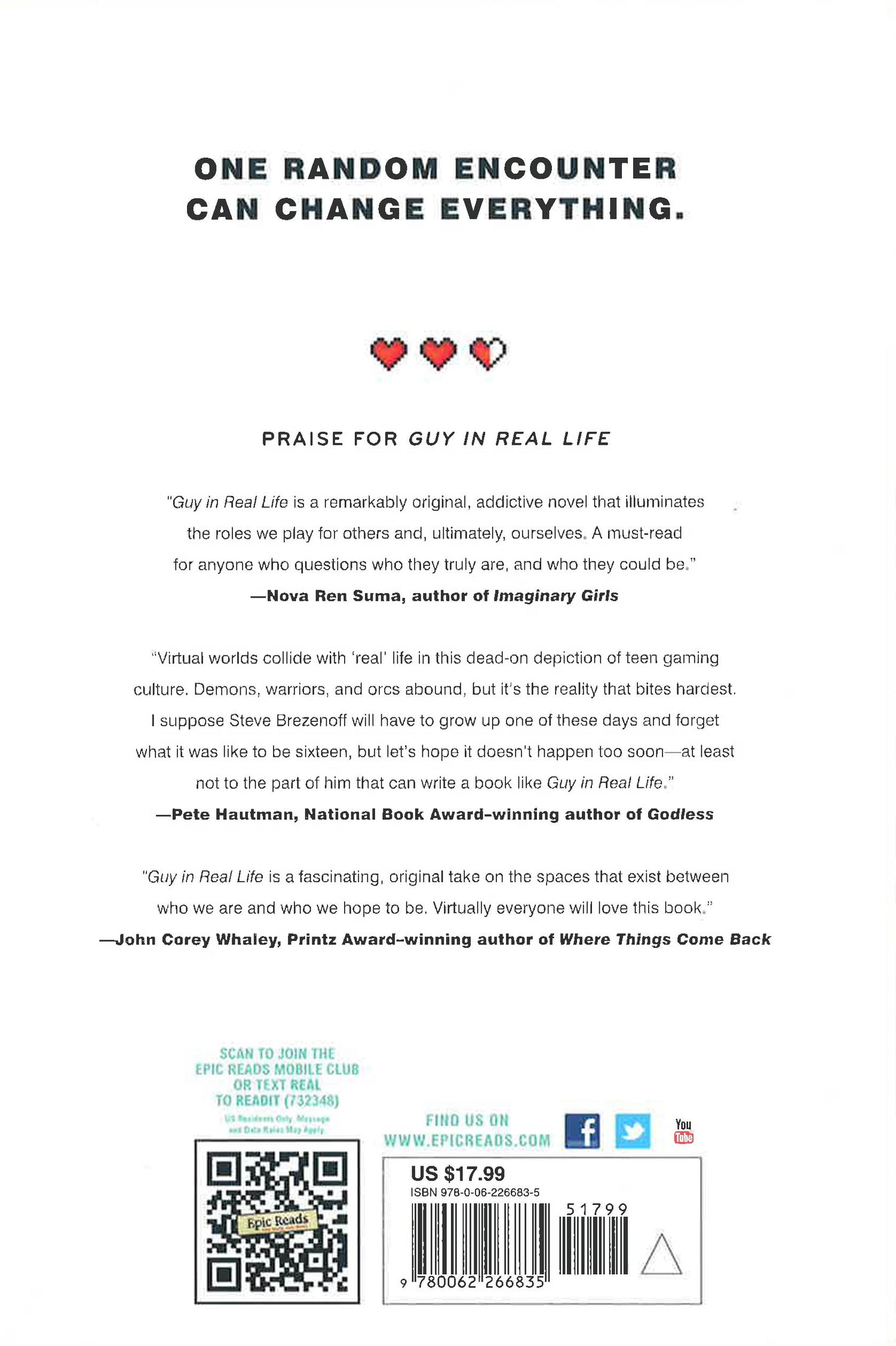From the acclaimed author of Brooklyn, Burning comes Guy in Real Life, an achingly real and profoundly moving love story about two teens that National Book Award-finalist Sara Zarr has called "wholly original and instantly classic." *This Book May Have Remainder Mark* It is Labor Day weekend in Saint Paul, Minnesota, and boy and girl collide on a dark street at two thirty in the morning: Lesh, who wears black, listens to metal, and plays MMOs; Svetlana, who embroiders her skirts, listens to Bjrk and Berlioz, and dungeon masters her own RPG. They should pick themselves up, continue on their way, and never talk to each other again. But they don't. This is a story of the roles we all play--at school, at home, online, and with our friends--and the one person who might be able to show us who we are underneath it all. show more