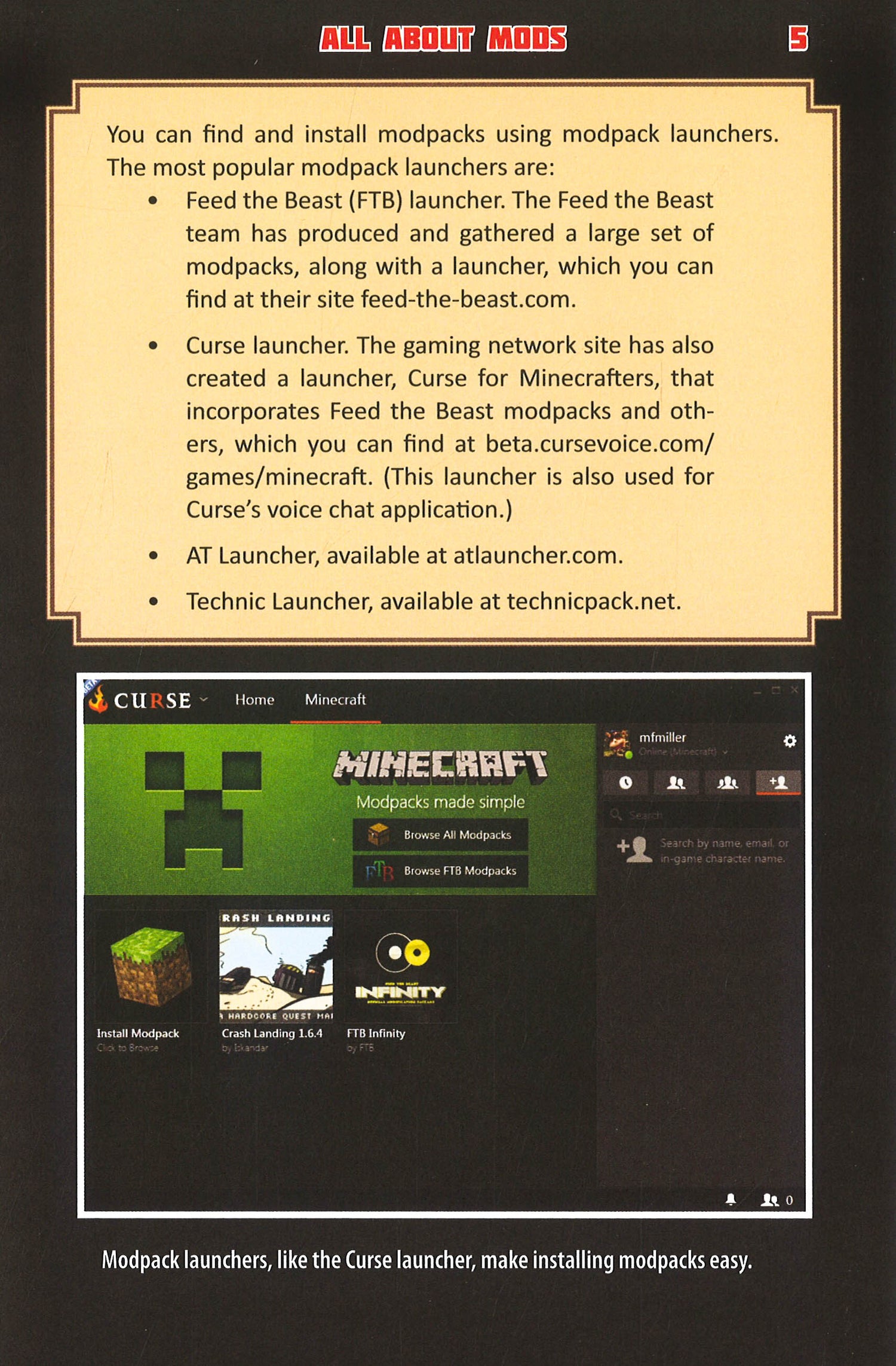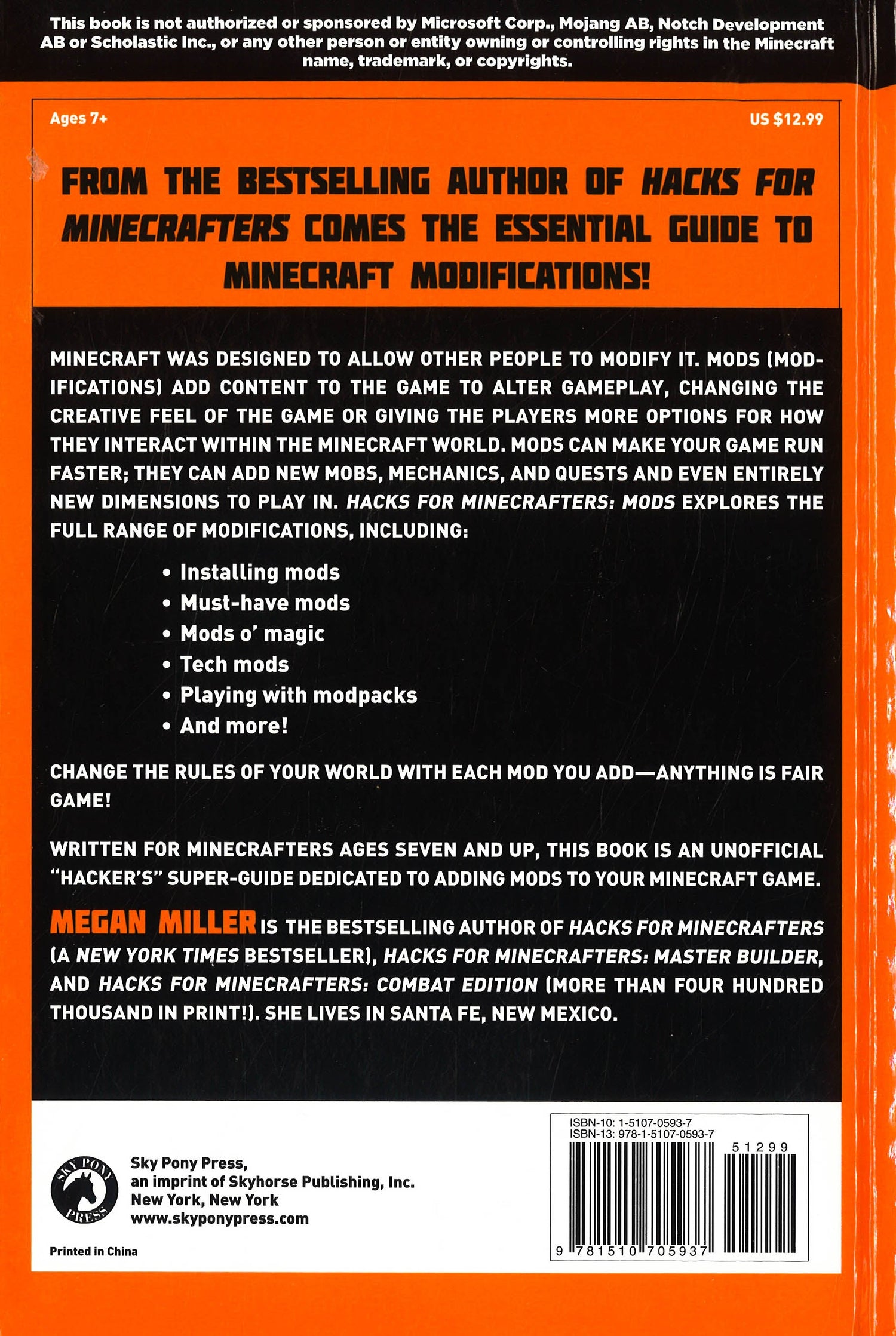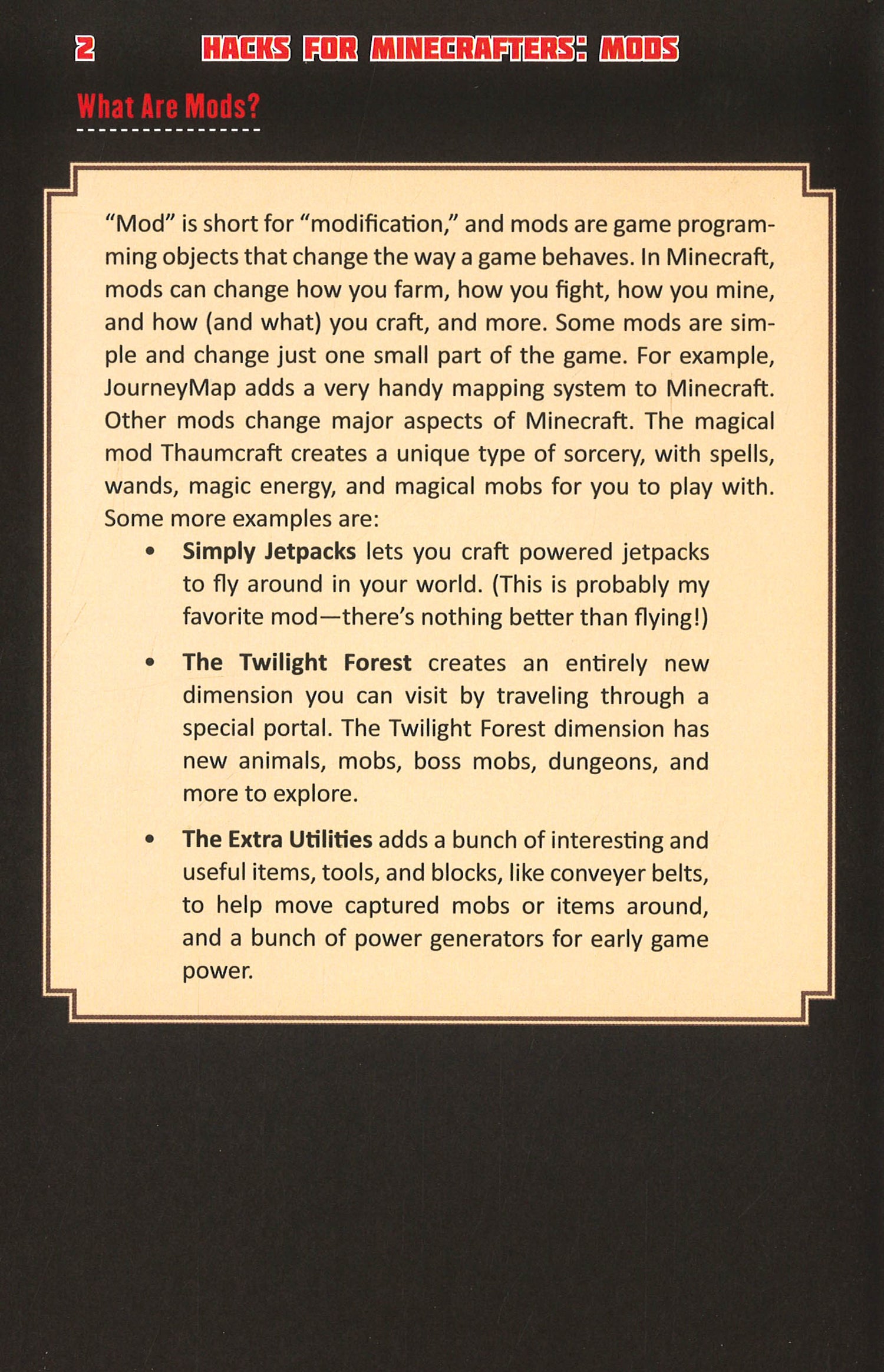 This adventure series is created especially for readers who love the fight of good vs. evil, magical academies like Hogwarts in the Harry Potter saga, and games like Minecraft, Terraria, and Pokemon GO. Minecraft was designed to allow other people to modify it. And while there are several successful game guides on the market already, this book is the first unofficial "hacker's" super-guide dedicated to adding mods (modifications) to your Minecraft game. Mods add content to the game to alter gameplay, changing the creative feel of the game or giving the players more options for how they interact within the Minecraft world. Mods can make your game run faster, they can add new mobs, mechanics, and quests, and even entirely new dimensions to play in. Change the rules of your world with each mod you add--anything is fair game! This book explores today's range of modded Minecraft play, from the must-haves to the fanciful--from utilities like Inventory Tweaks and JourneyMap, to full-fledged gameplay extensions and modpacks, like Thaumcraft, Twilight Forest, and Agrarian Skies. Written for seven- to twelve-year-old Minecrafters this is the ultimate guide on Minecraft mods--keep your game new and exciting with all these expert tips and tricks.