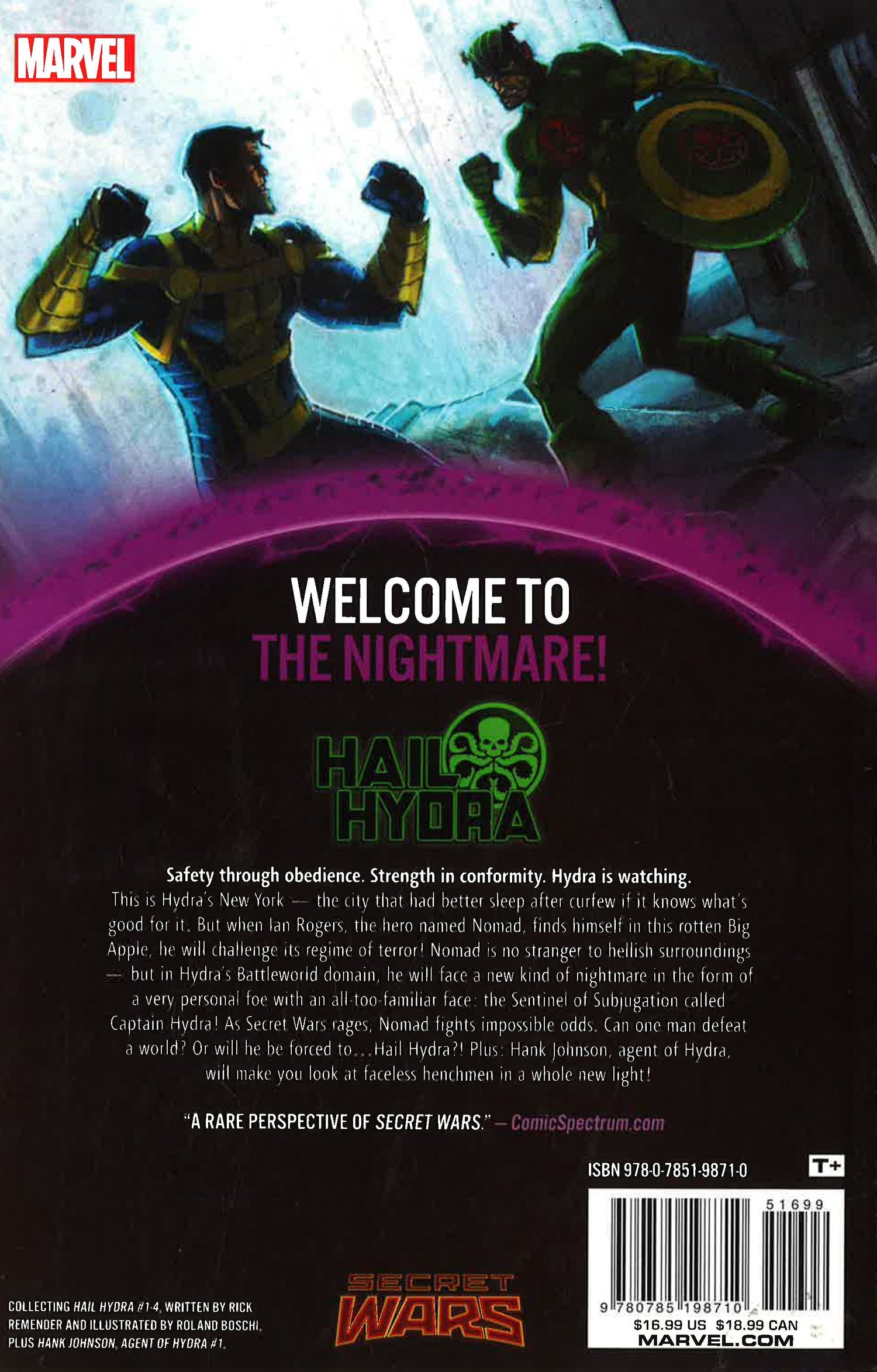 Safety through obedience. Strength in conformity. Hydra is watching. Welcome to a Domain ruled by Hydra, and its capital, New York. The city that had better sleep after curfew, if it knows what's good for it. But when the young hero named Nomad fi nds himself in this rotten Big Apple, he will challenge this regime of terror. Nomad is no stranger to hellish surroundings - he grew up in Dimension Z, where he was raised as Captain America's son. But in Hydra's zone of Battleworld, Nomad will face a new kind of nightmare. A very personal foe with an all-too-familiar face - the Sentinel of Subjugation known as Captain Hydra! * This book may have remainder mark*