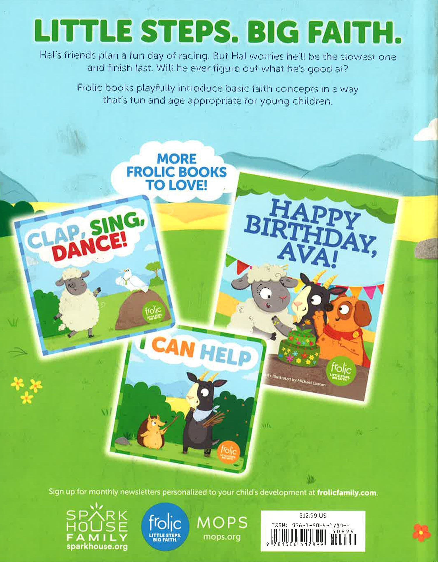 It's the day of the big race and Hal wants to win. But he's just not as big, as strong, or as fast as his friends. After a frustrating start, Hal discovers he has his own strengths, like perseverance, endurance, and problem-solving. Children learn to celebrate the differences in how we grow and how we all have our own pace of development. For ages three to five. Frolic picture books help young children solve common childhood challenges with biblical solutions, and won a 2016 Moonbeam Children's Book Award for Best Picture Book Series.