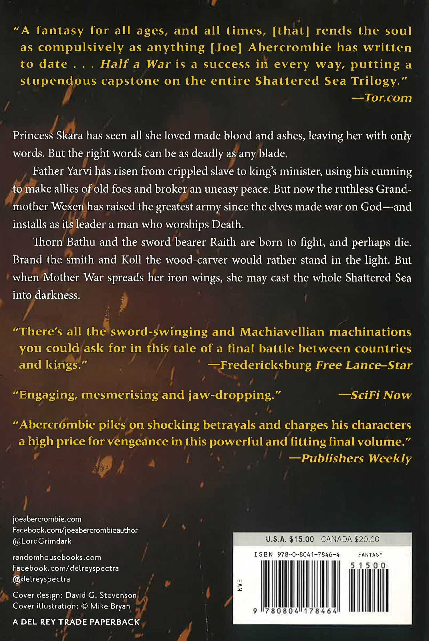 NAMED ONE OF THE BEST BOOKS OF THE YEAR BY BUZZFEED AND THE INDEPENDENT - New York Times bestselling author Joe Abercrombie delivers the stunning conclusion to the epic fantasy trilogy that began with Half a King, praised by George R. R. Martin as "a fast-paced tale of betrayal and revenge that grabbed me from page 1 and refused to let go." "The Shattered Seas trilogy has worked its way into a very exclusive group of my favorite fantasy novels of all time."--James Dashner, #1 New York Times bestselling author of The Maze Runner Words are weapons. Princess Skara has seen all she loved made blood and ashes. She is left with only words. But the right words can be as deadly as any blade. If she is to reclaim her birthright, she must conquer her fears and sharpen her wits to a lethal edge. Only half a war is fought with swords. The deeply cunning Father Yarvi has walked a long road from crippled slave to king's minister. He has made allies of old foes and stitched together an uneasy peace. But now the ruthless Grandmother Wexen has raised the greatest army since the elves made war on God, and put Bright Yilling at its head--a man who worships only Death. Sometimes one must fight evil with evil. Some--like Thorn Bathu and the sword-bearer Raith--are born to fight, perhaps to die. Others--like Brand the smith and Koll the wood-carver--would rather stand in the light. But when Mother War spreads her irons wings, she may cast the whole Shattered Sea into darkness. Praise for Half a War "Filled with swift battles, quick plot twists and witty dialogue."--New York Daily News "A fantasy for all ages, and all times [that] rends the soul as compulsively as anything Abercrombie has written to date . . . Half a War is a success in every way, putting a stupendous capstone on the entire Shattered Sea Trilogy."--Tordotcom "There's all the sword-swinging and Machiavellian machinations you could ask for in this tale of a final battle between countries and kings."--Fredericksburg Free Lance-Star "Engaging, mesmerising and jaw-dropping."--SciFi Now "Abercrombie piles on shocking betrayals and charges his characters a high price for vengeance in this powerful and fitting final volume."--Publishers Weekly
