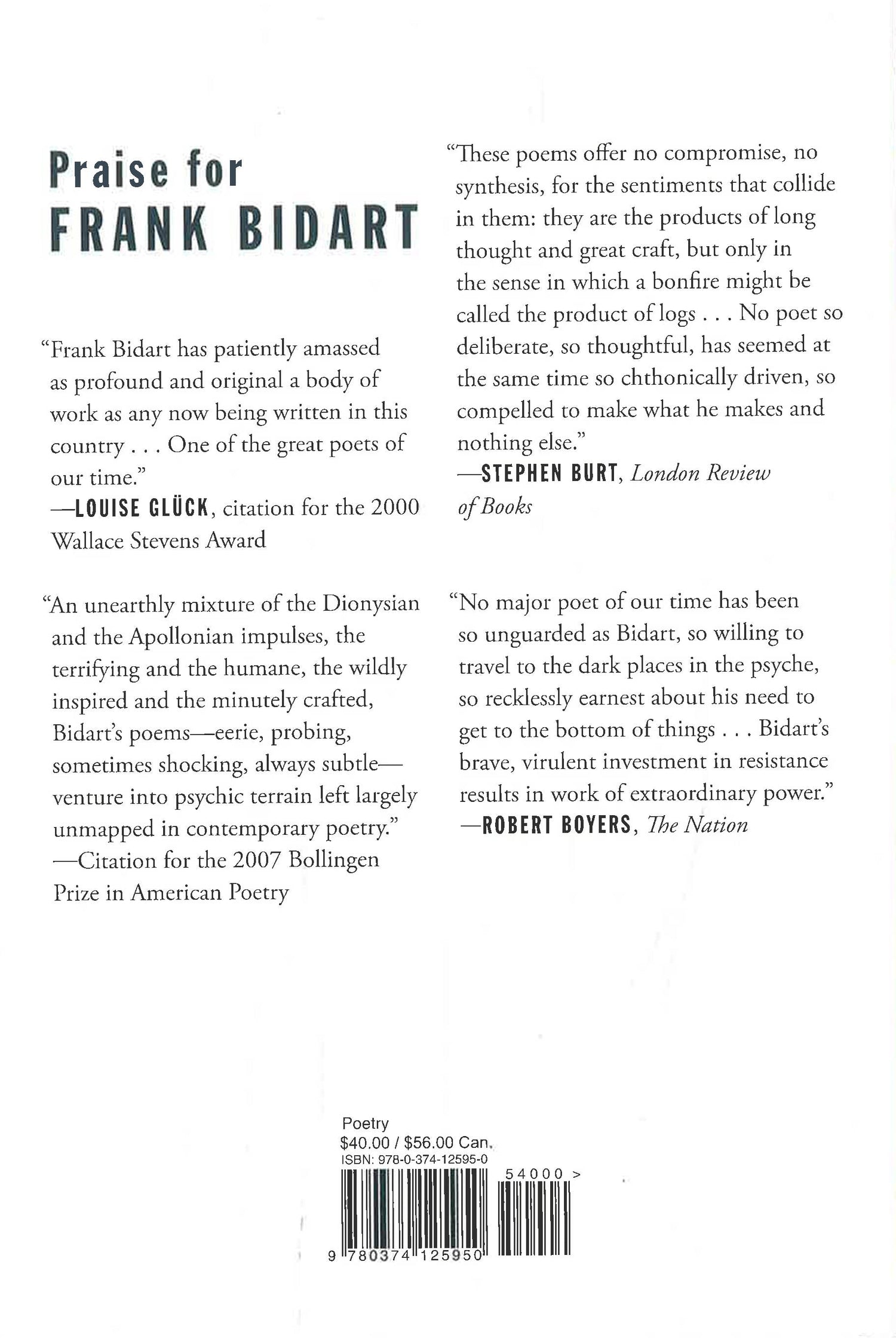 Gathered together, the poems of Frank Bidart perform one of the most remarkable transmutations of the body into language in contemporary literature. His pages represent the human voice in all its extreme registers, whether it’s that of the child-murderer Herbert White, the obsessive anorexic Ellen West, the tormented genius Vaslav Nijinsky, or the poet’s own. And in that embodiment is a transgressive empathy, one that recognizes our wild appetites, the monsters, the misfits, the misunderstood among us and inside us. Few writers have so willingly ventured to the dark places of the human psyche and allowed themselves to be stripped bare on the page with such candor and vulnerability. Over the past half century, Bidart has done nothing less than invent a poetics commensurate with the chaos and appetites of our experience.