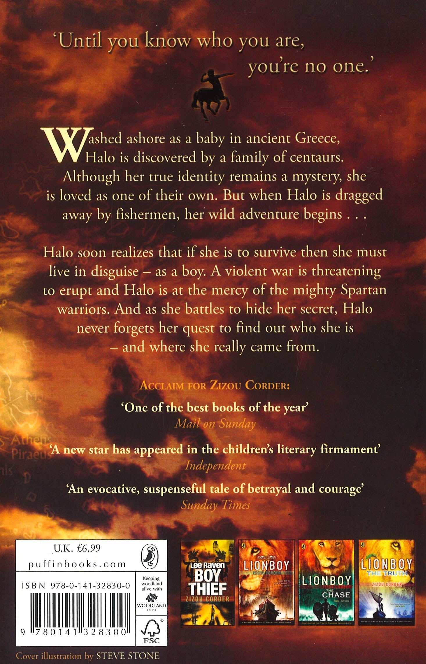 Washed ashore as a baby in ancient Greece, Halo is discovered by a family of centaurs. Although her true identity remains a mystery, she is loved as one of their own. But when Halo is dragged away by fishermen, her wild adventure begins... Halo soon realizes that if she is to survive then she must live in disguise - as a boy.Washed ashore as a baby in ancient Greece, Halo is discovered by a family of centaurs. Although her true identity remains a mystery, she is loved as one of their own. But when Halo is dragged away by fishermen, her wild adventure begins . . .Halo soon realizes that if she is to survive then she must live in disguise - as a boy. A violent war is threatening to erupt and Halo is at the mercy of the mighty Spartan warriors. And as she battles to hide her secret, Halo never forgets her quest to find out who she is - and where she really came from.