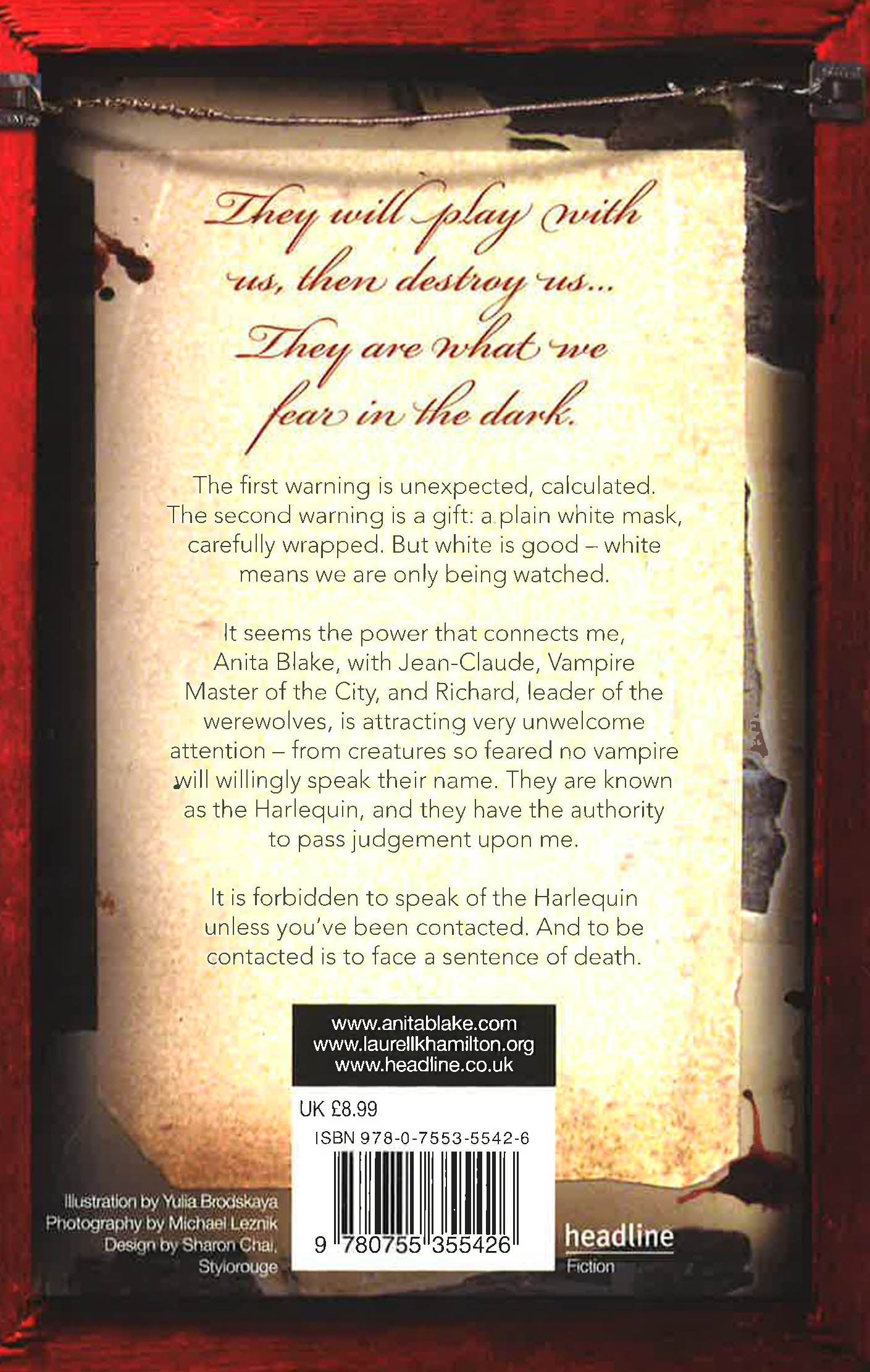 It seems the power that connects me, Anita Blake, with Jean-Claude Vampire Master of the City and Richard, leader of the werewolves, is attracting very unwelcome attention - from creatures so feared no vampire will willingly speak their name. They are known as the Harlequin, and they have the authority to pass judgement upon me. It is forbidden to speak of the Harlequin unless you've been contacted. And to be contacted is to face a sentence of death.