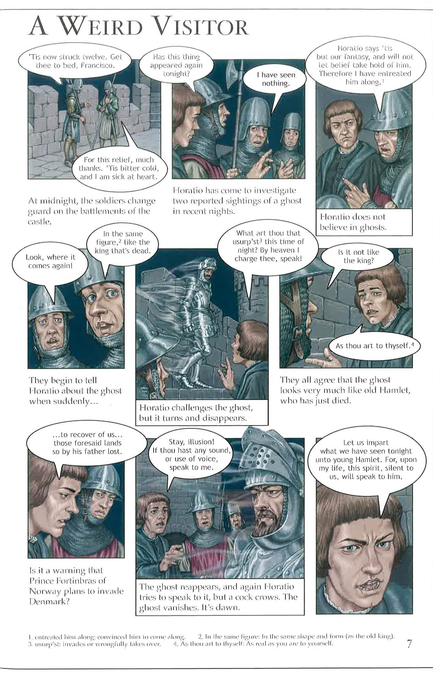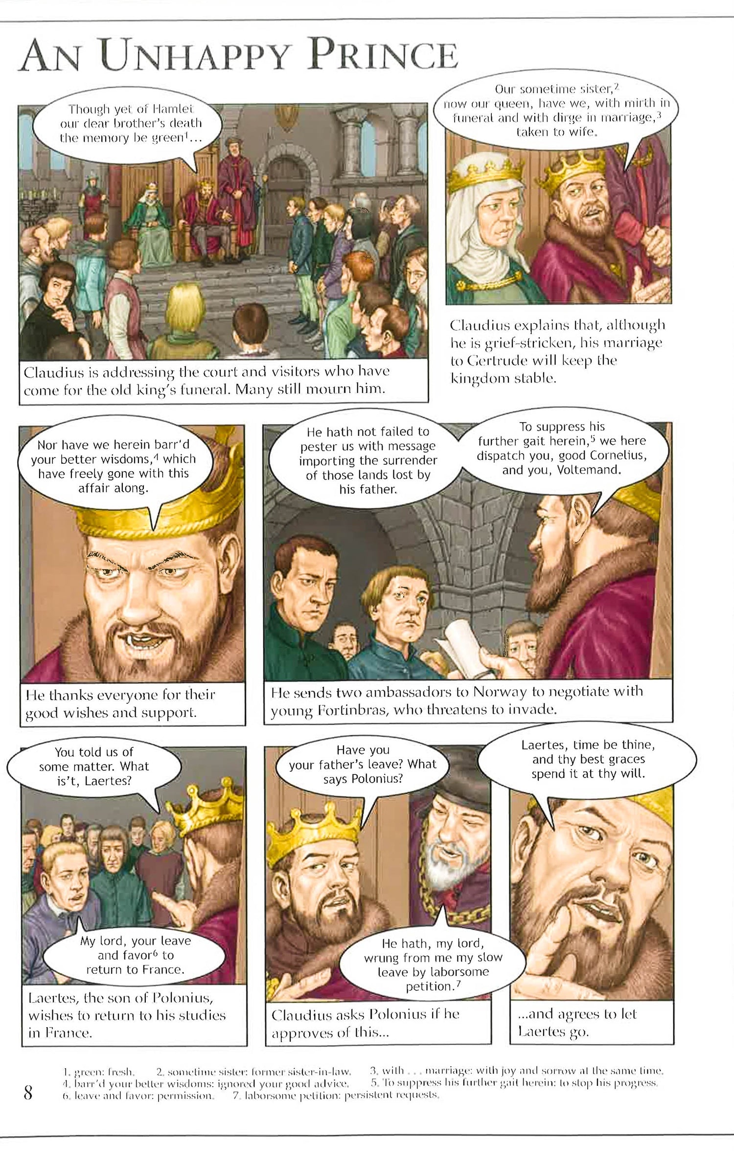 Retells in graphic novel format an adaptation of Shakespeare's story of the Danish prince whose father's ghost appeals to him to avenge his death.