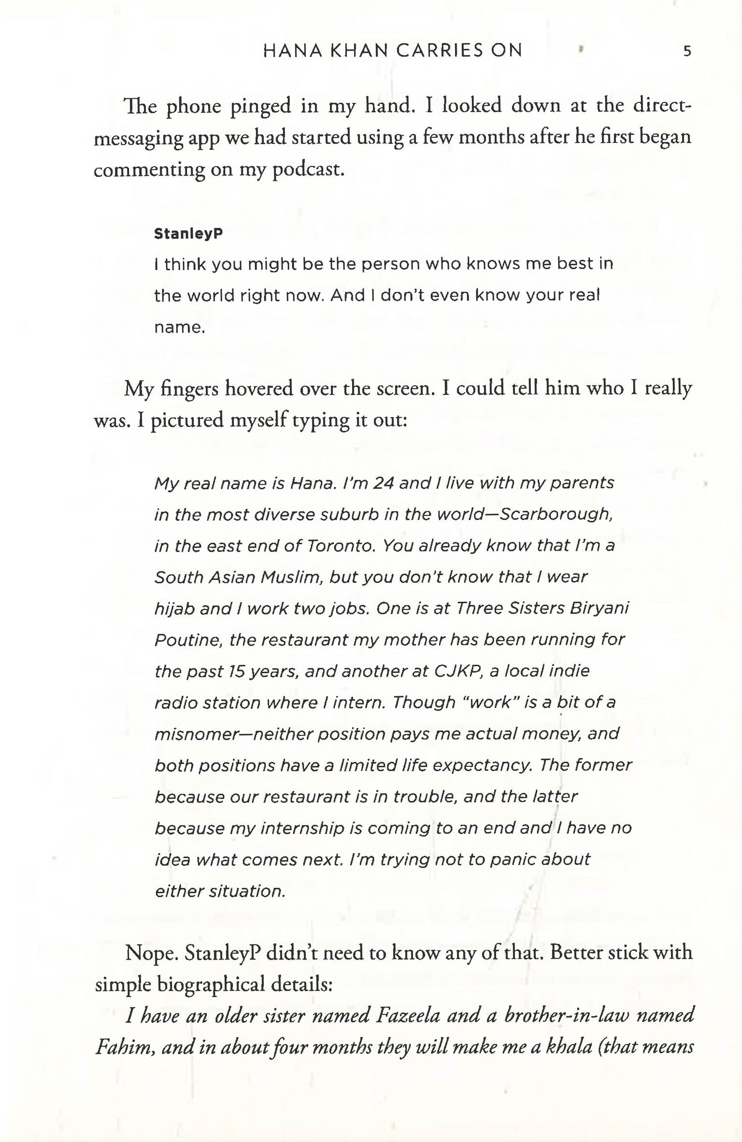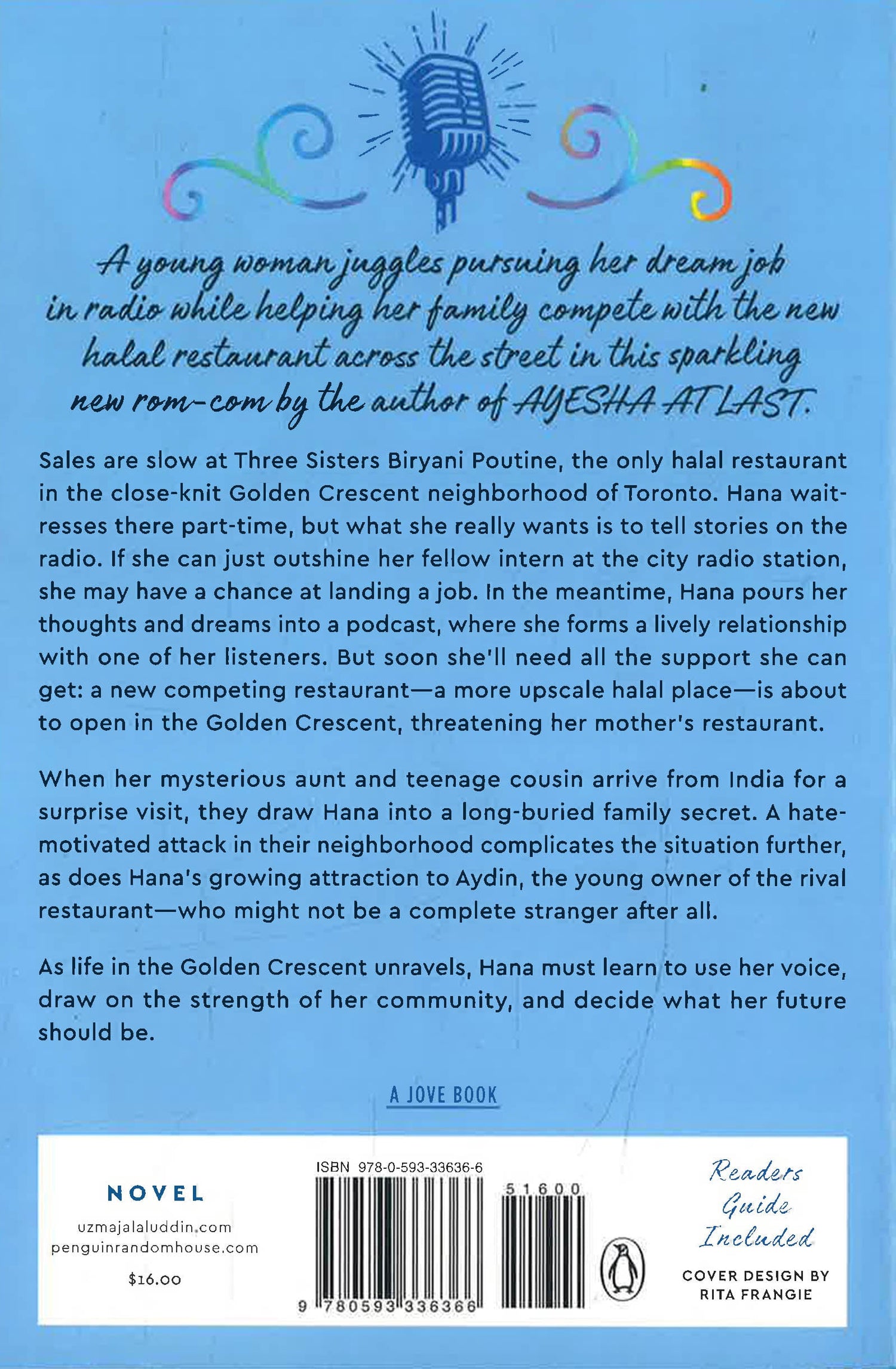 Sales are slow at Three Sisters Biryani Poutine, the only halal restaurant in the close-knit Golden Crescent neighborhood of Toronto. Hana waitresses there part time, but what she really wants is to tell stories on the radio. If she can just outshine her fellow intern at the city radio station, she may have a chance at landing a job. In the meantime, Hana pours her thoughts and dreams into a podcast, where she forms a lively relationship with one of her listeners. But soon she'll need all the support she can get: a new competing restaurant, a more upscale halal place, is about to open in the Golden Crescent, threatening her mother’s restaurant.