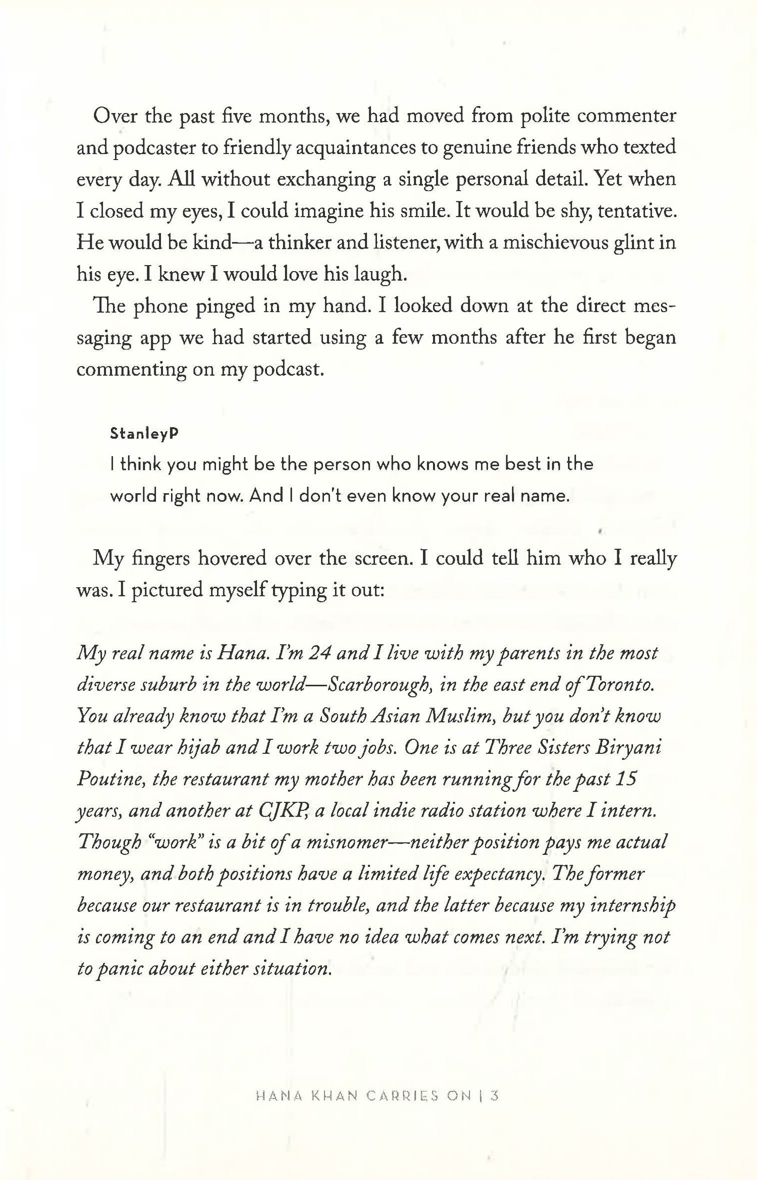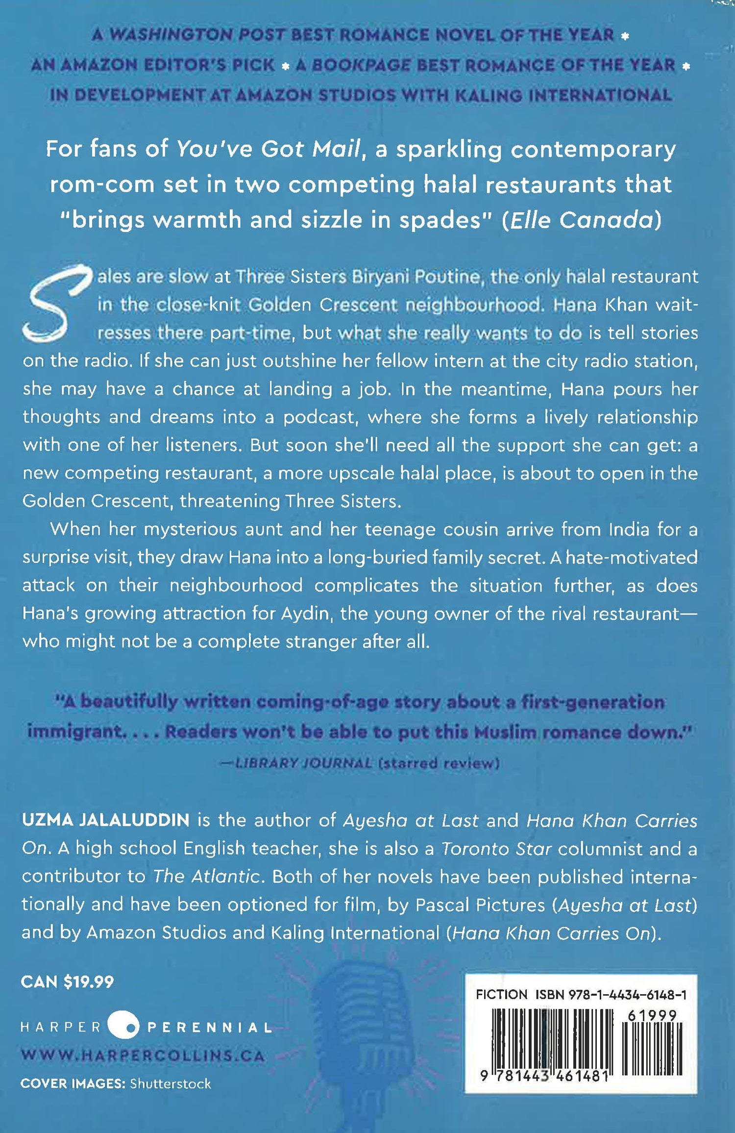 Sales are slow at Three Sisters Biryani Poutine, the only halal restaurant in the close-knit Golden Crescent neighbourhood. Hana waitresses there part-time, but what she really wants is to tell stories on the radio. If she can just outshine her fellow intern at the city radio station, she may have a chance at landing a job. In the meantime, Hana pours her thoughts and dreams into a podcast, where she forms a lively relationship with one of her listeners. But soon she’ll need all the support she can get: a new competing restaurant, a more upscale halal place, is about to open in the Golden Crescent, threatening Three Sisters.