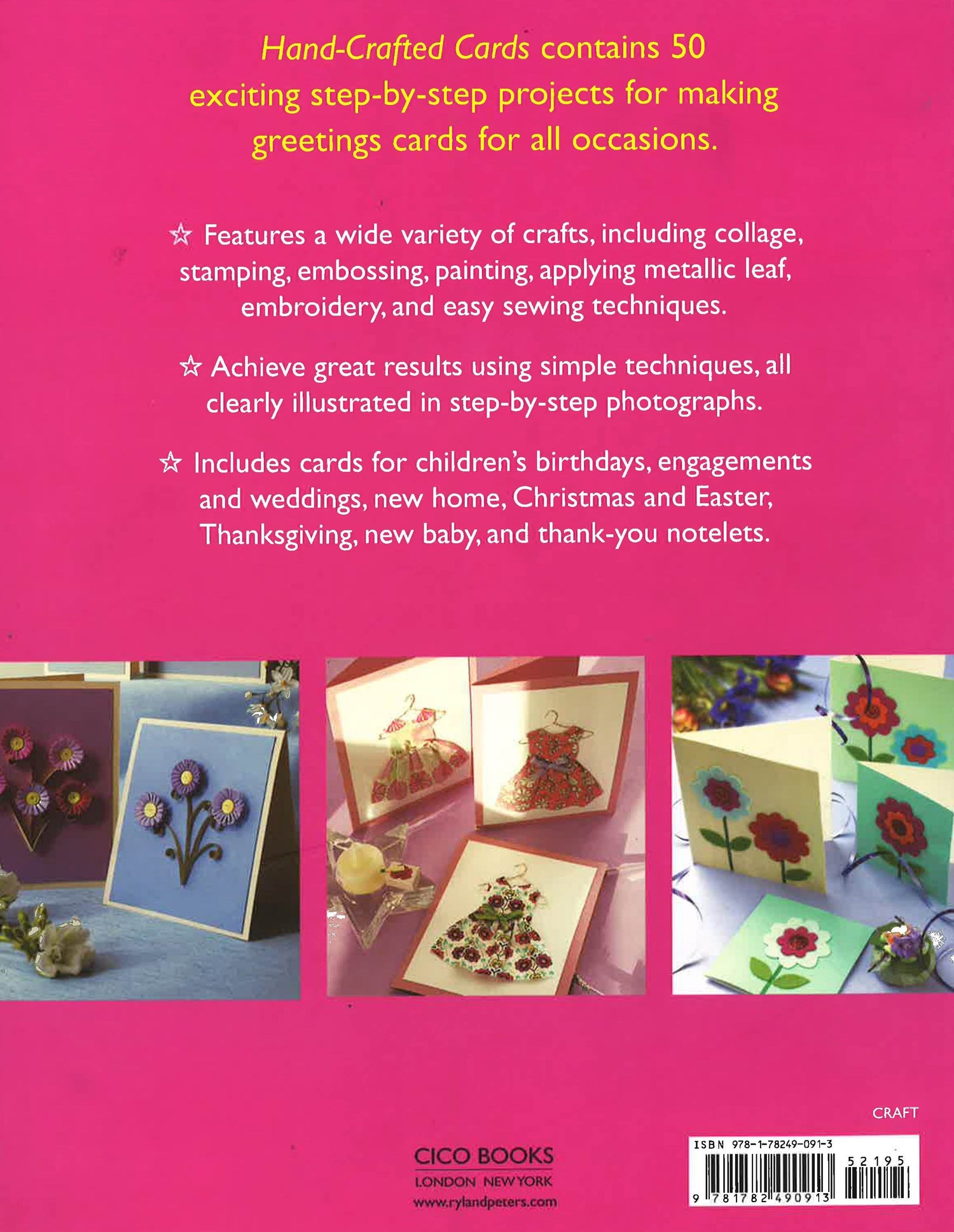 Hand-Crafted Cards contains 50 exciting step-by-step projects for making greetings cards for all occasions. Here are 50 fast, fun cards featuring a wide variety of techniques, including collage, stamping, embossing, painting, applying metallic leaf and embroidery, all with simple instructions and clear step-bystep photographs. Choose from scented lavender heart cards for Mother's Day, colourful felt finger puppet cards that are perfect for children's birthdays, pop-up cards in the style of a fairytale gingerbread house, and a monochrome card which doubles up as a photo frame. There are cards for every celebration, including weddings, Easter, new baby and birthdays, as well as thank-you notelets and more general, but still gorgeous cards that you can give for any occasion. There are also designs you can make in large quantities for Christmas and other festivities, and most of the ideas can be made with inexpensive materials and basic tools, so you can get started straight away.
