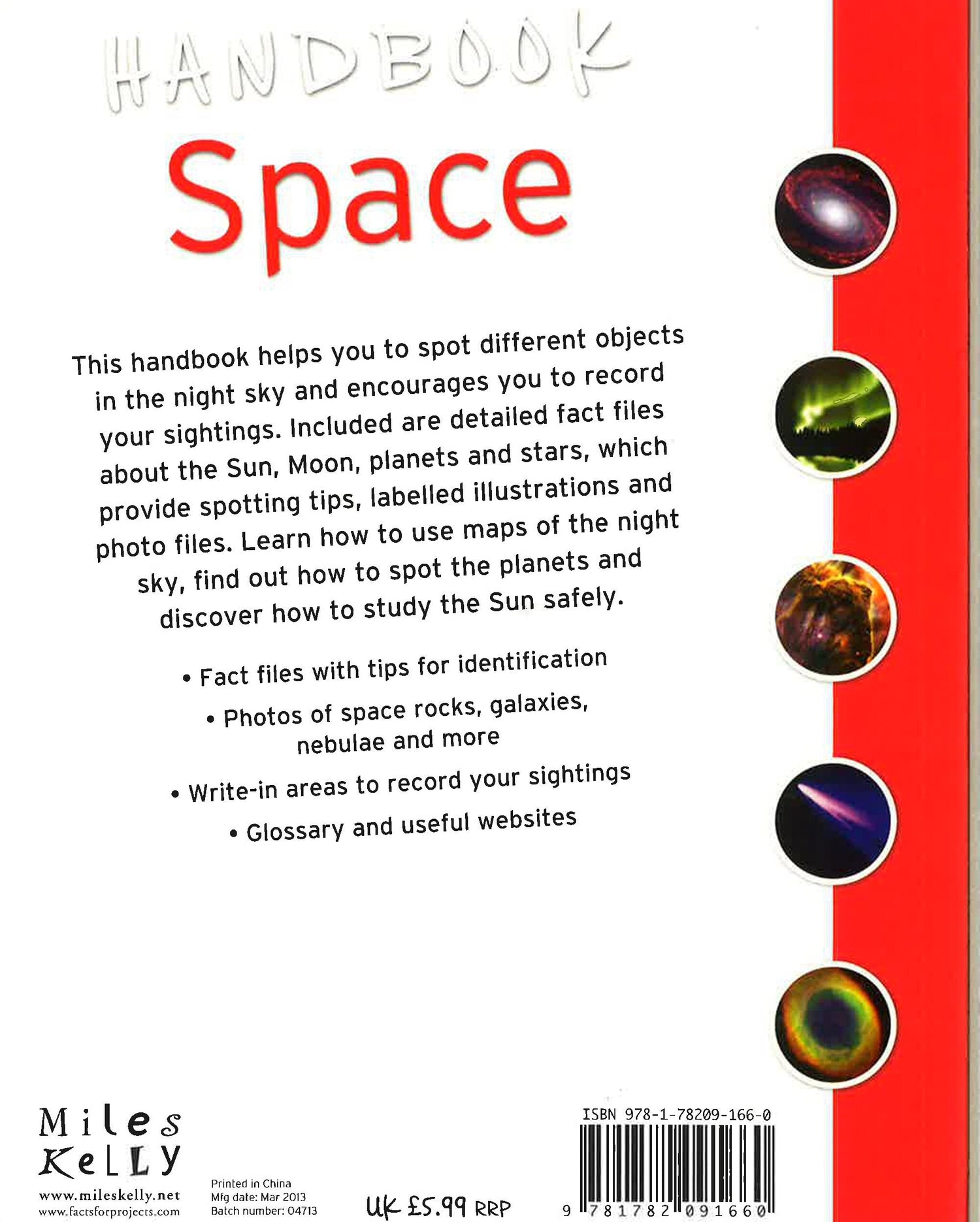 This handbook helps you spot different objects in the night sky and encourages you to record your sightings. Included are detailed fact files about the Sun, Moon, planets and stars, which provide spotting tips, labelled illustrations and photo files.