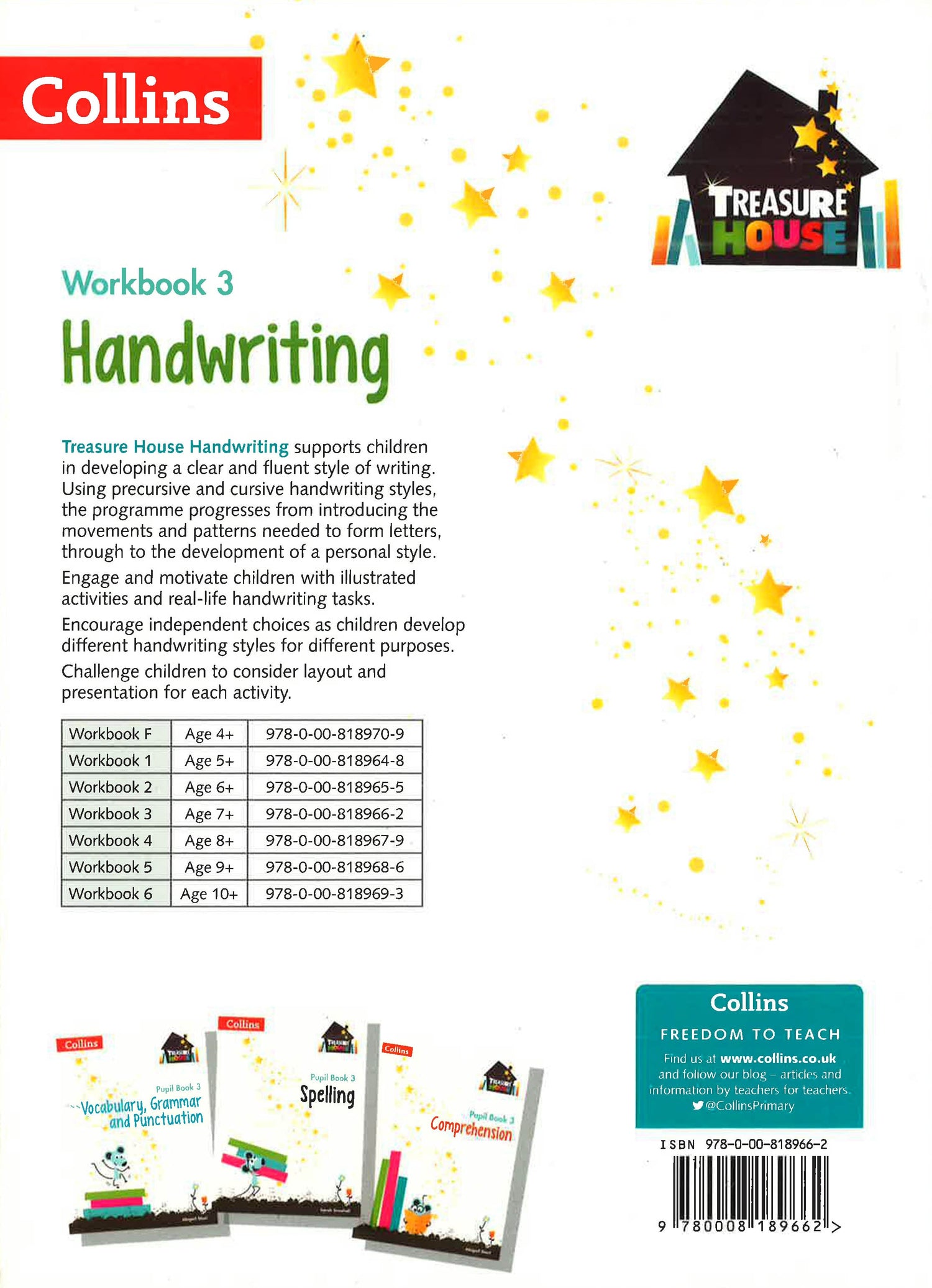 Treasure House Handwriting is a whole-school programme designed to support children in developing a clear and fluent style of writing. Using precursive and cursive handwriting styles, the programme progresses from introducing the movements and patterns needed to form letters, through to the development of a personal style.
