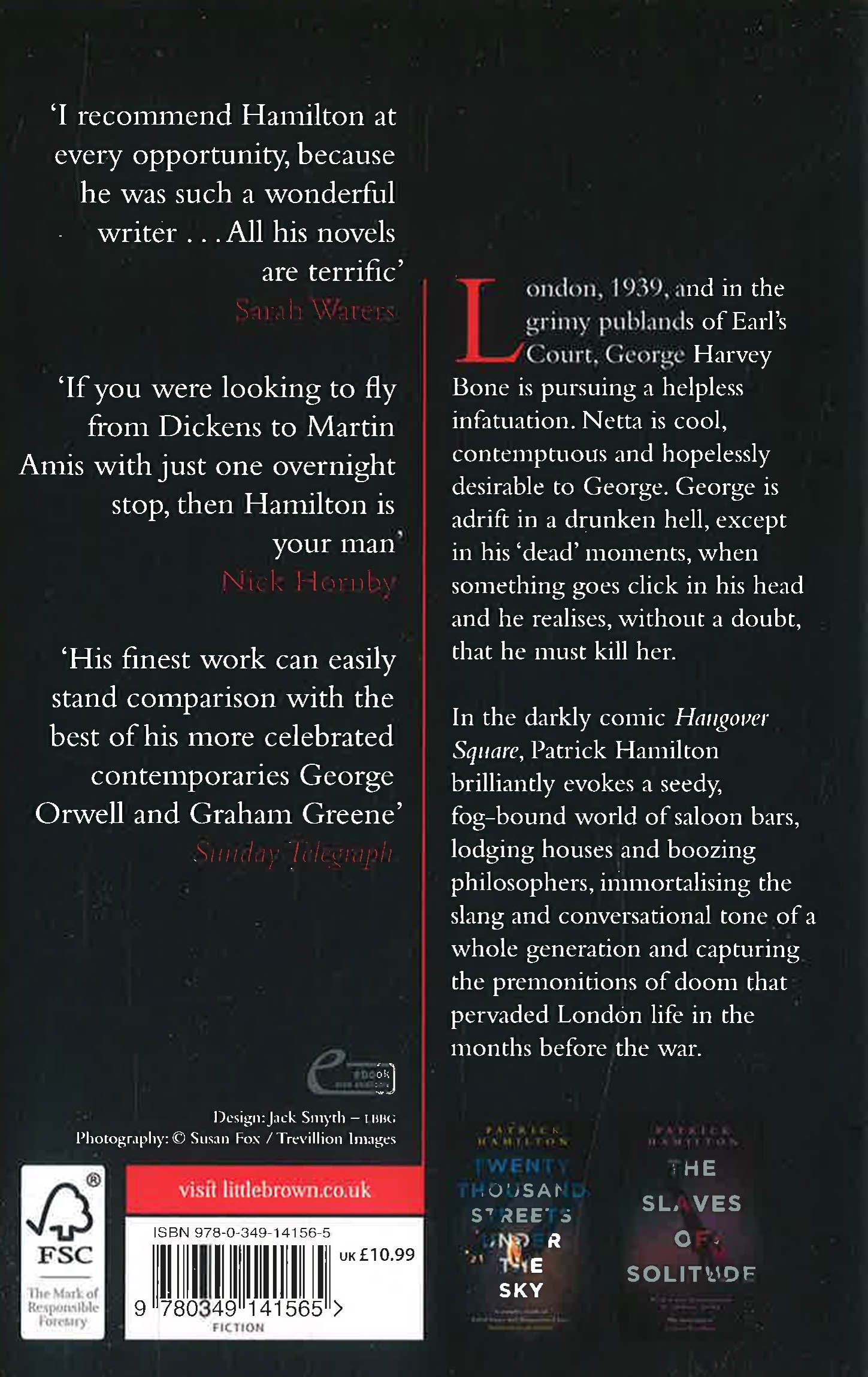 London, 1939, and in the grimy publands of Earls Court, George Harvey Bone is pursuing a helpless infatuation. Netta is cool, contemptuous and hopelessly desirable to George. George is adrift in a drunken hell, except in his 'dead' moments, when something goes click in his head and he realises, without a doubt, that he must kill her. In the darkly comic Hangover Square Patrick Hamilton brilliantly evokes a seedy, fog-bound world of saloon bars, lodging houses and boozing philosophers, immortalising the slang and conversational tone of a whole generation and capturing the premonitions of doom that pervaded London life in the months before the war.