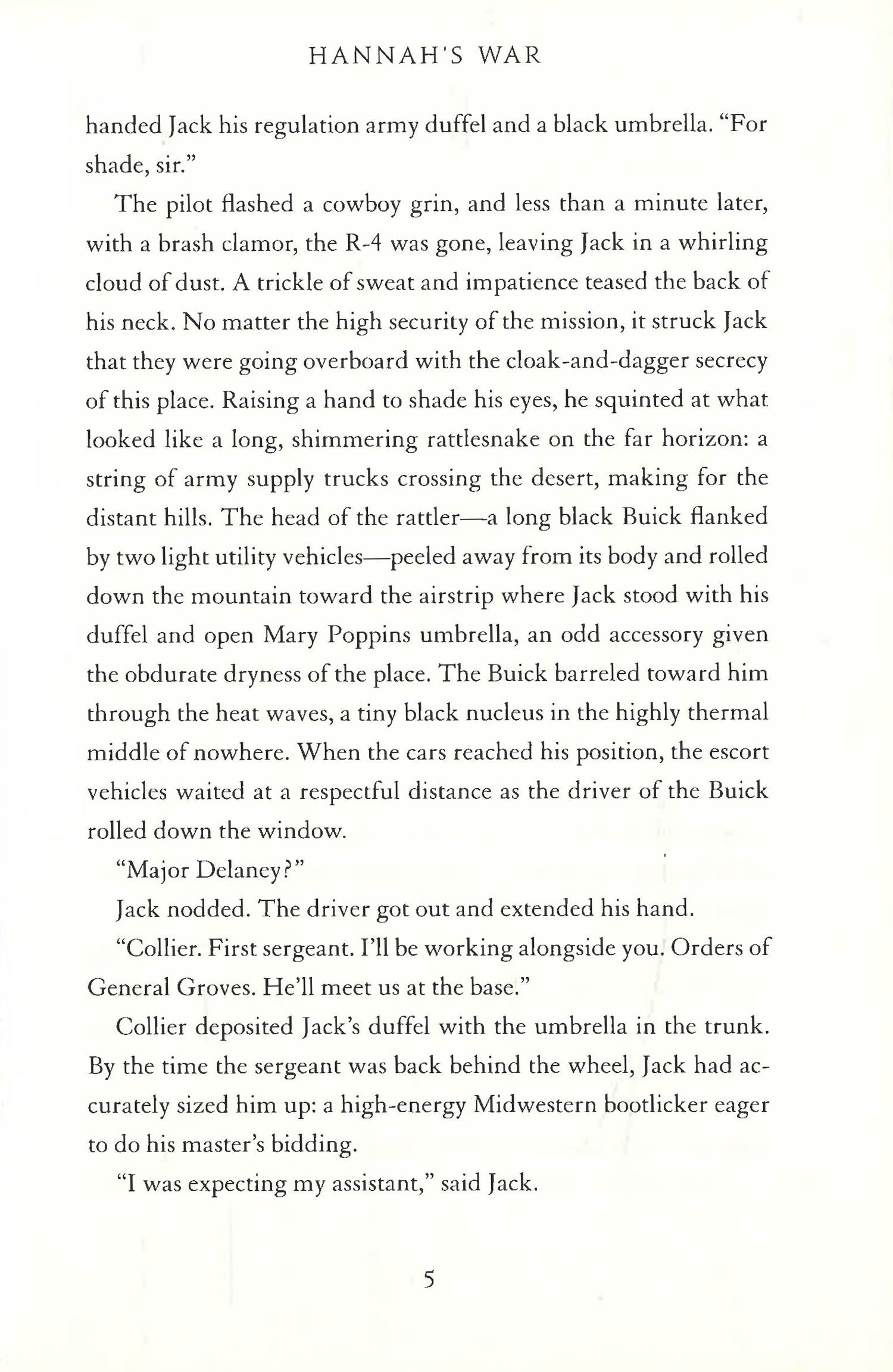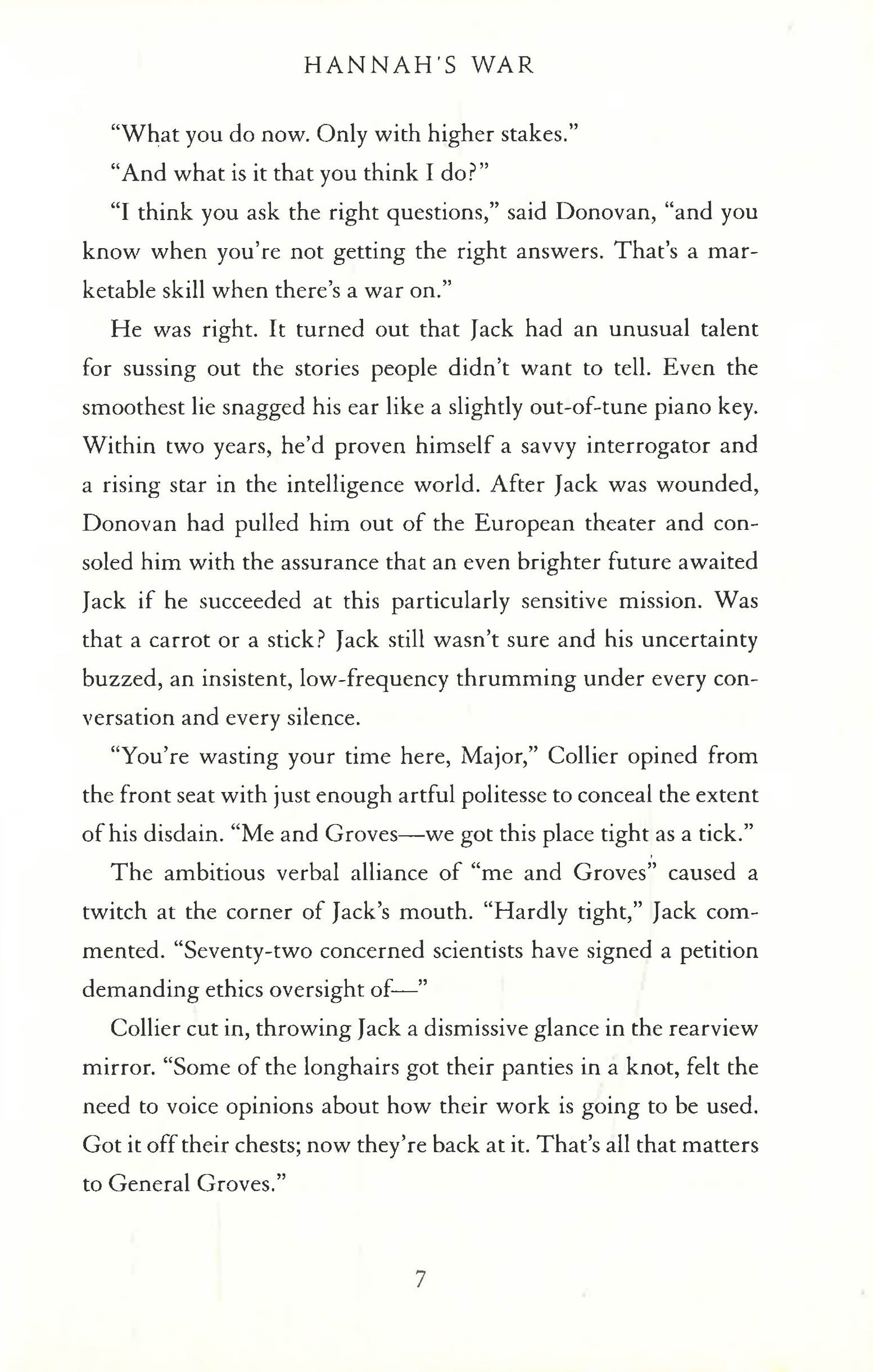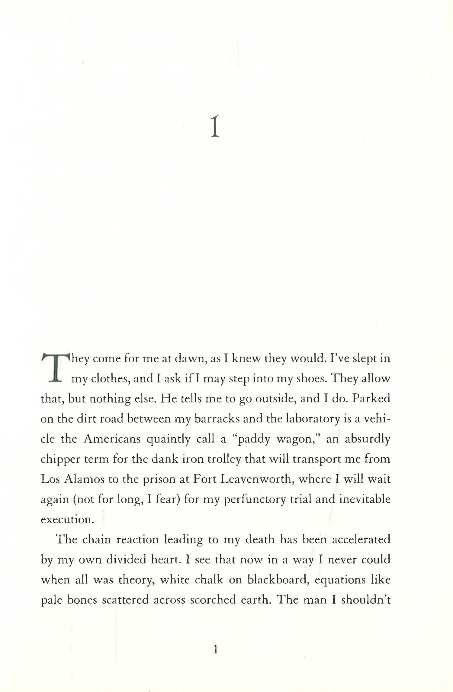 New Mexico, 1945. Returning wounded and battered from the liberation of Paris, Major Jack Delaney arrives in the New Mexican desert with a mission: to catch a spy. Someone in the top-secret nuclear lab at Los Alamos has been leaking encoded equations to Hitler's scientists. Chief among Jack's suspects is the brilliant and mysterious Hannah Weiss, an exiled physicist lending her talent to J. Robert Oppenheimer's mission. All signs point to Hannah as the traitor, but over three days of interrogation that separate her lies from the truth, Jack will realize they have more in common than either one bargained for.