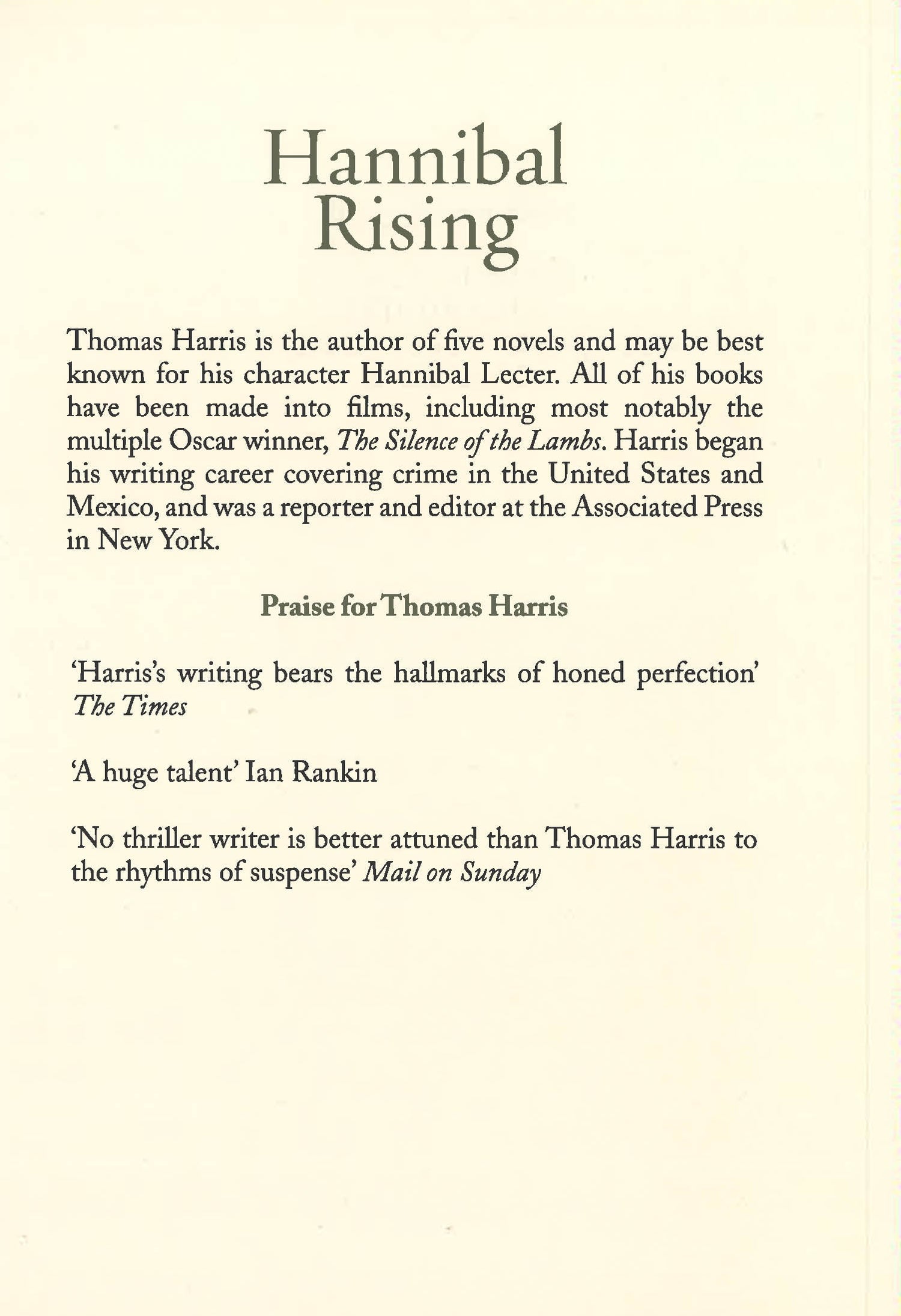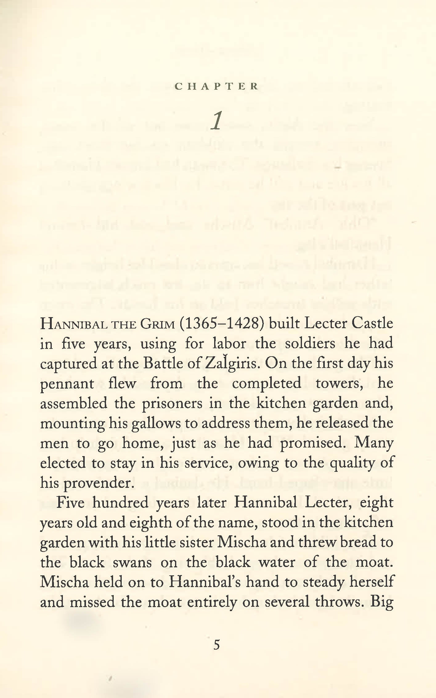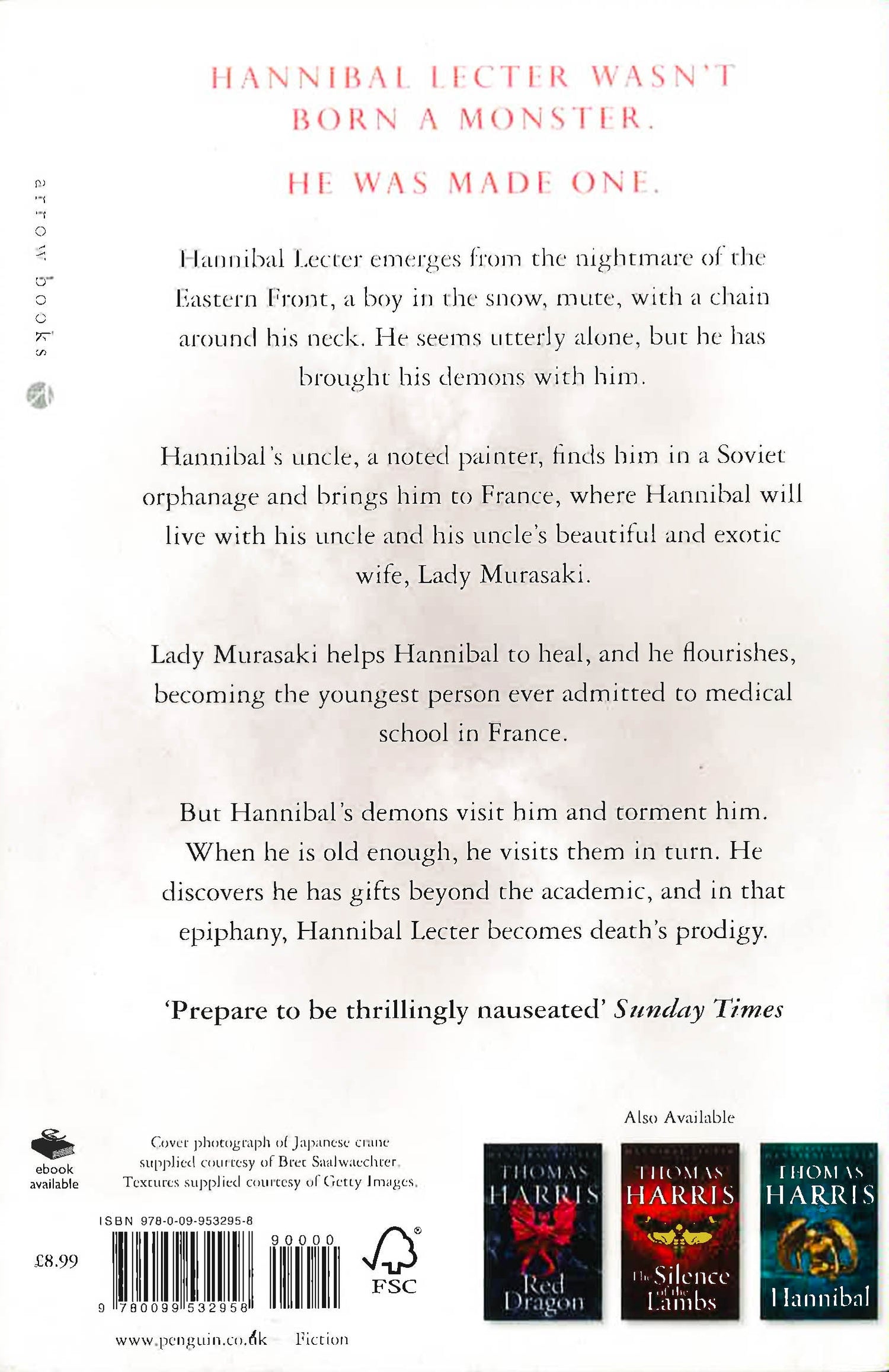 Hannibal Lecter emerges from the nightmare of the Eastern Front of World War II, a boy in the snow, mute, with a chain around his neck. He will not speak of what happened to him and his family. He seems utterly alone, but he has brought his demons with him.