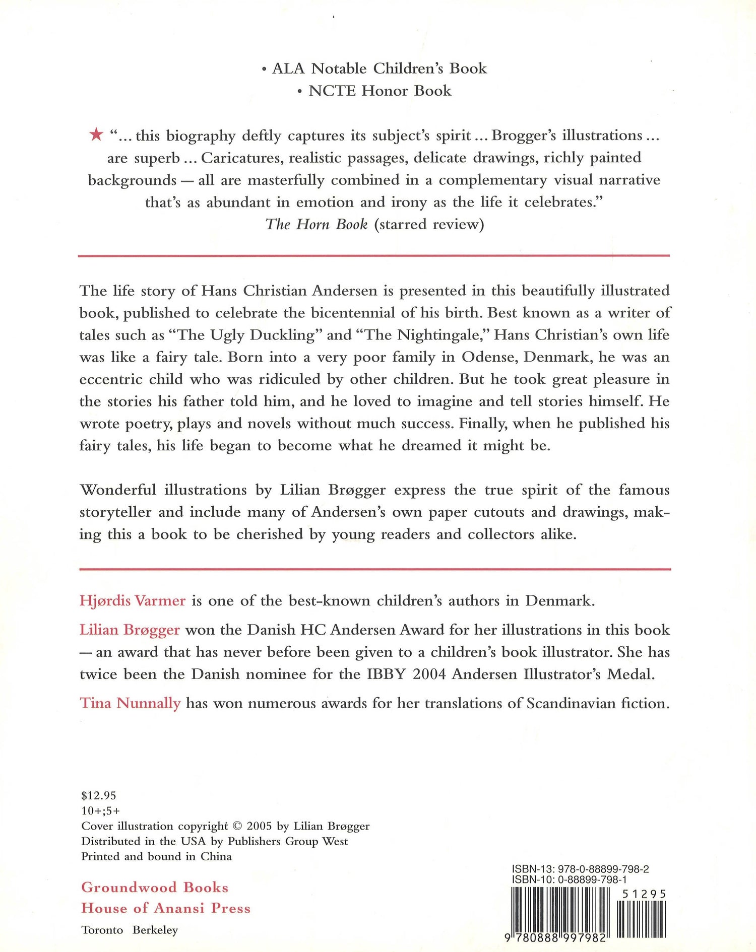 This beautifully illustrated biography commemorates the bicentennial of Hans Christian Andersen's birth. Written by one of Denmark's best-known children's authors, Hjxrdis Varmer, the book chronicles the fairy-tale like story of Andersen's life, describing how the eccentric Andersen came from a poor family, was ridiculed by other children, and struggled for many years before finally finding world-wide fame writing fairy tales such as The Ugly Duckling, Thumbelina, and The Nightingale.Award-winning illustrator Lilian Brxgger's highly original illustrations bring out the true spirit of the famous storyteller and incorporate many of Andersen's own paper cuttings and drawings, making this children's book one to be cherished.