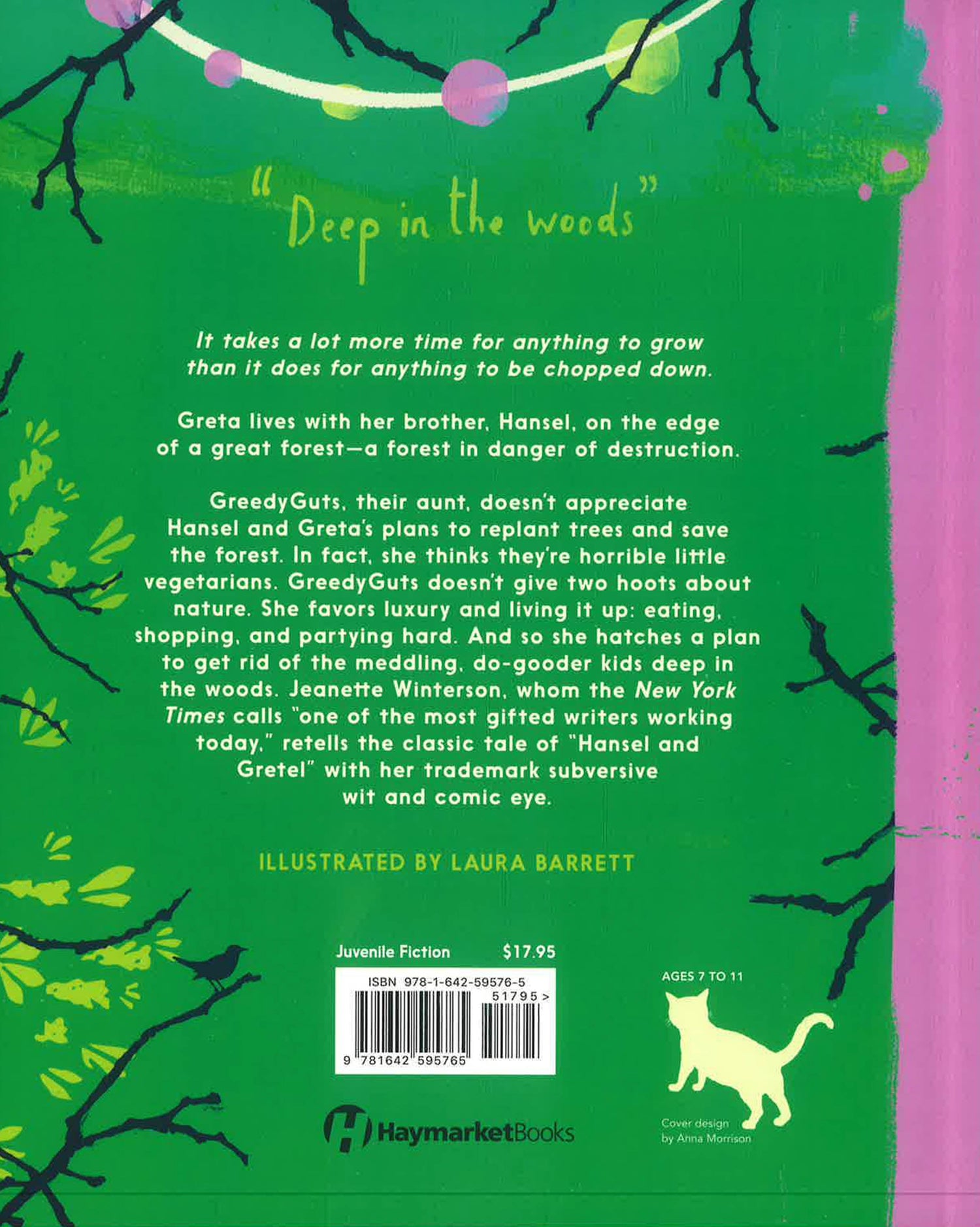 Greta lives with her brother Hansel on the edge of a great forest - a forest in danger of destruction. GreedyGuts, their aunt, doesn't appreciate Hansel and Greta's plans to replant trees and save the forest. In fact, she thinks they're horrible little vegetarians. GreedyGuts doesn't give two hoots about nature. She favors luxury and living it up: eating, shopping and partying hard and so she hatches a plan to get rid of the meddling, do-gooder kids deep in the woods. With her trademark subversive and comic eye, Jeanette Winterson retells the classic tale of Hansel and Gretel.