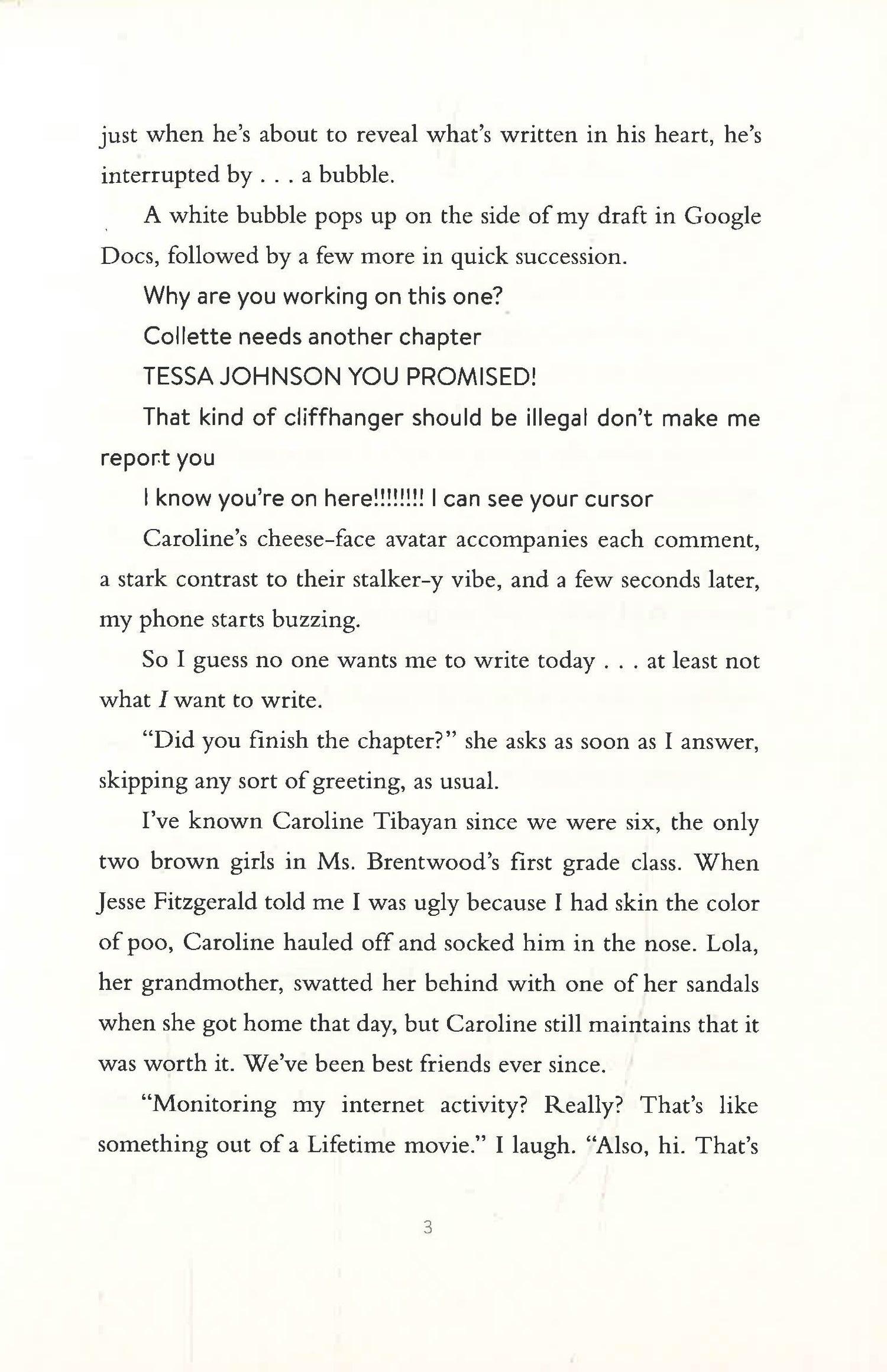 Sixteen-year-old Tessa Johnson has never felt like the protagonist in her own life. She’s rarely seen herself reflected in the pages of the romance novels she loves. The only place she’s a true leading lady is in her own writing—in the swoony love stories she shares only with Caroline, her best friend and #1 devoted reader.