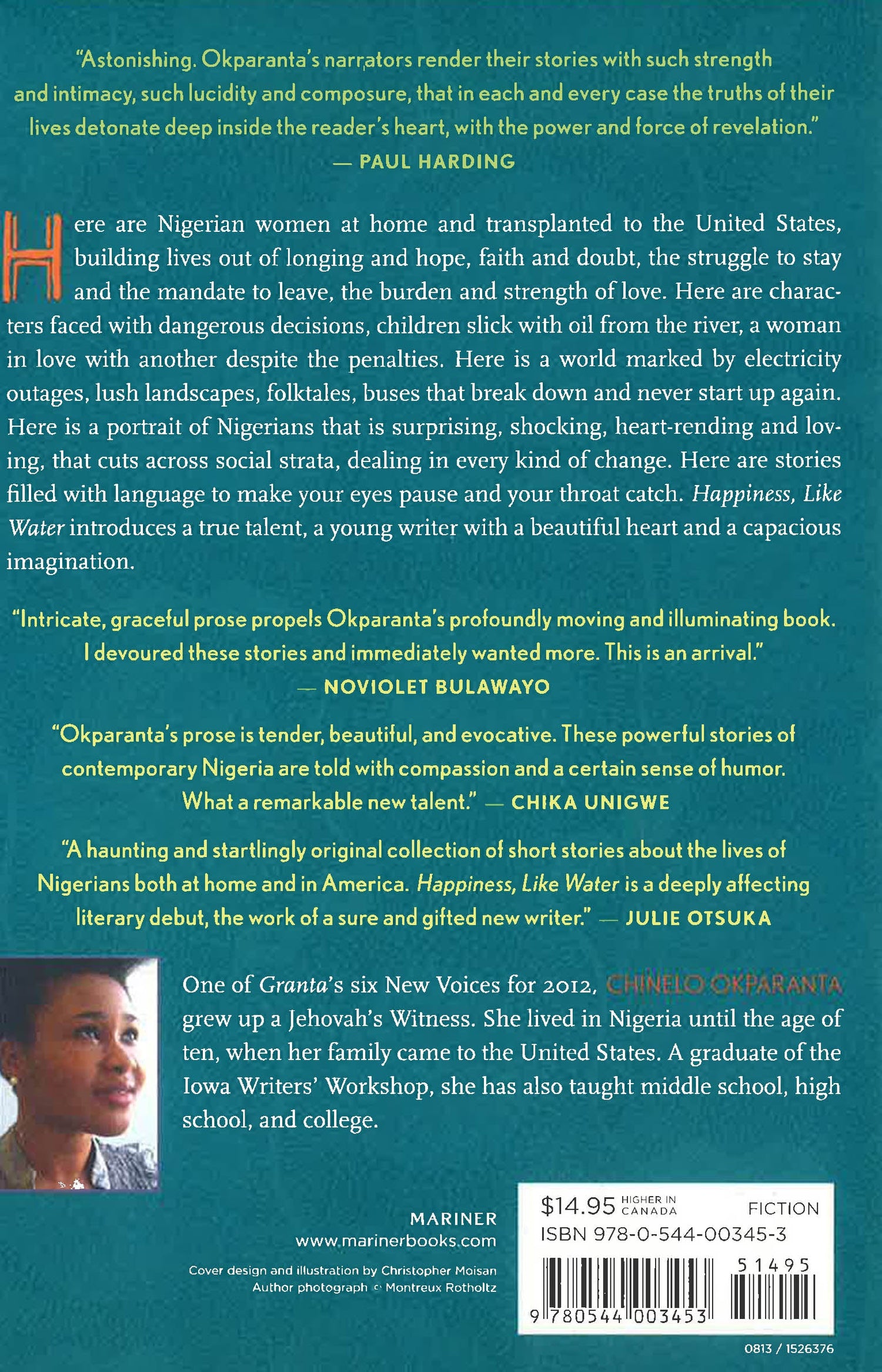 Astonishing. Okparanta s narrators render their stories with such strength and intimacy, such lucidity and composure, that in each and every case the truths of their lives detonate deep inside the reader s heart, with the power and force of revelation." Paul Harding Here are Nigerian women at home and transplanted to the United States, building lives out of longing and hope, faith and doubt, the struggle to stay and the mandate to leave, the burden and strength of love. Here are characters faced with dangerous decisions, children slick with oil from the river, a woman in love with another despite the penalties. Here is a world marked by electricity outages, lush landscapes, folktales, buses that break down and never start up again. Here is a portrait of Nigerians that is surprising, shocking, heartrending, loving, and across social strata, dealing in every kind of change. Here are stories filled with language to make your eyes pause and your throat catch. "Happiness, Like Water "introduces a true talent, a young writer with a beautiful heart and a capacious imagination. "Intricate, graceful prose propels Okparanta s profoundly moving and illuminating book. I devoured these stories and immediately wanted more. This is an arrival." NoViolet Bulawayo "Okparanta's prose is tender, beautiful and evocative. These powerful stories of contemporary Nigeria are told with compassion and a certain sense of humor. What a remarkable new talent." Chika Unigwe "A haunting and startlingly original collection of short stories about the lives of Nigerians both at home and in America. "Happiness, Like Water" is a deeply affecting literary debut, the work of a sure and gifted new writer." Julie Otsuka