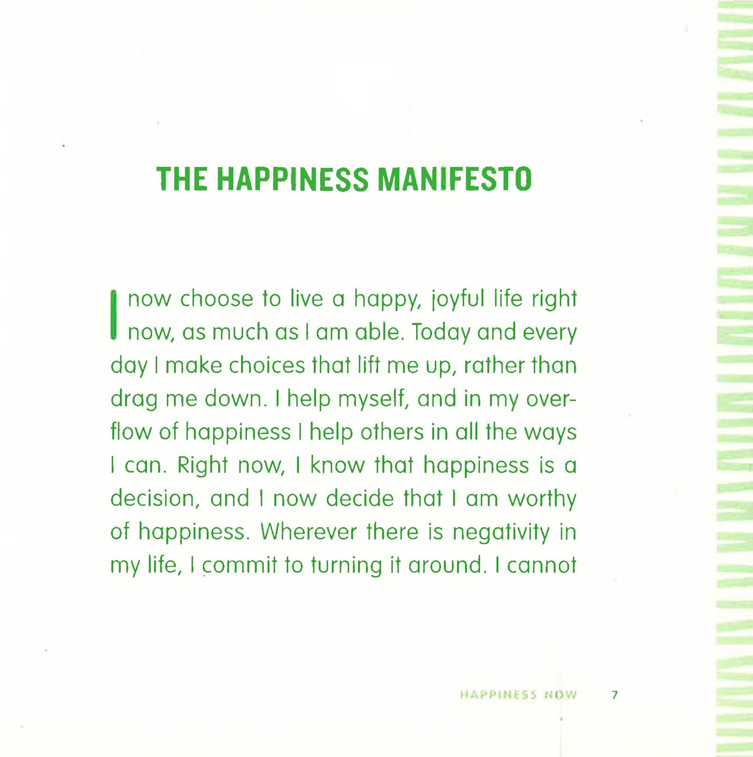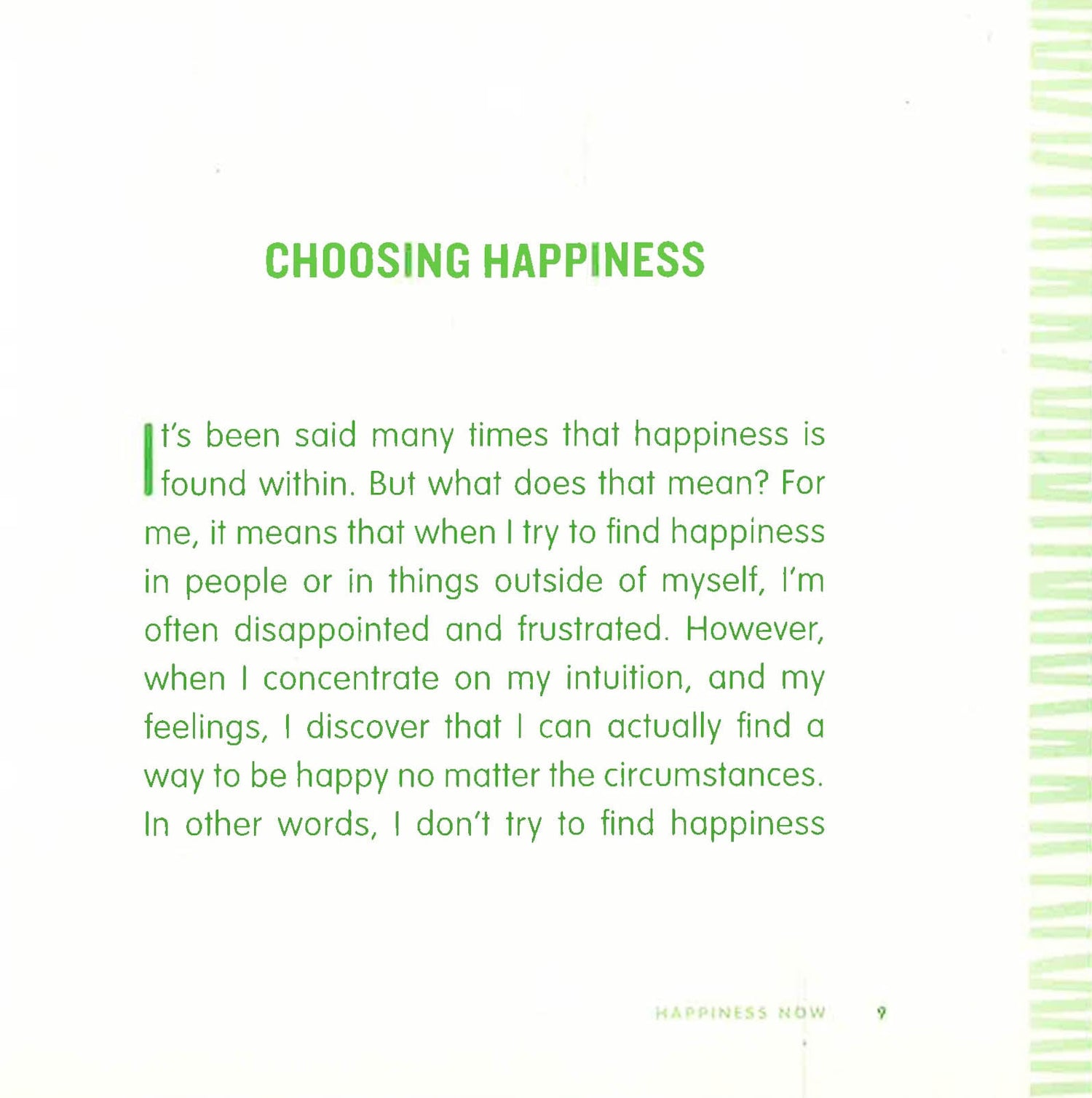 Everyone is looking for happiness. But happiness isn't about getting a raise or finding a spouse or losing ten pounds - it's a choice that you can make every day regardless of your situation. Happiness Now includes 50 simple actions you can take - any day and any time - to choose happiness in your life. Quick and accessible, Happiness Now is designed to give you the steps you need to stop your negative thinking, shift you attitude, and make the tiny choices that lead to a happier life.