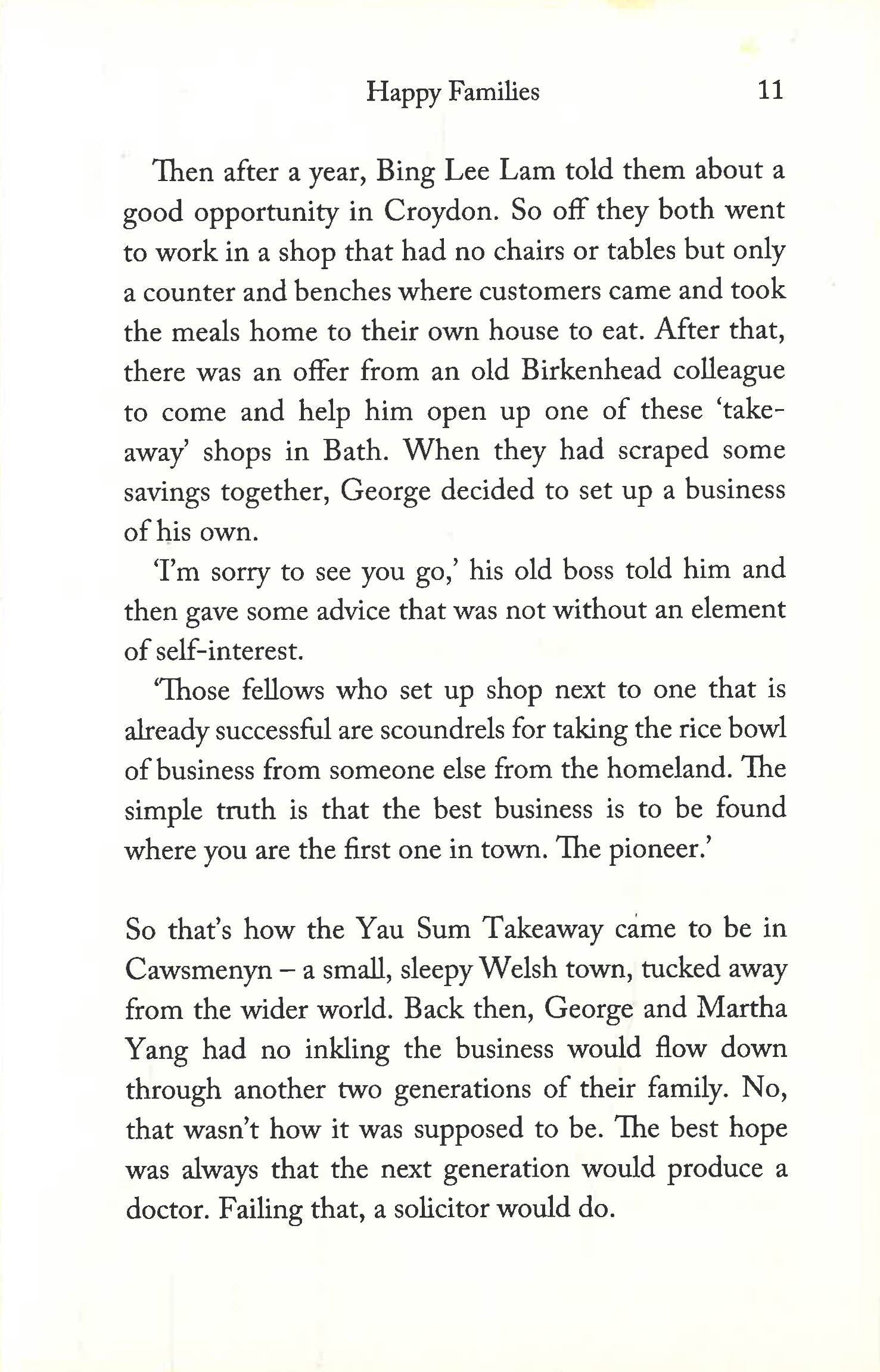 Amy is thirty-four and has just given up her glittering career in the big (Welsh) city to move back in with her grandfather, returning to work in the small-town Chinese takeaway where she spent her bookish and boring childhood. Why? That's a secret she won't tell.
