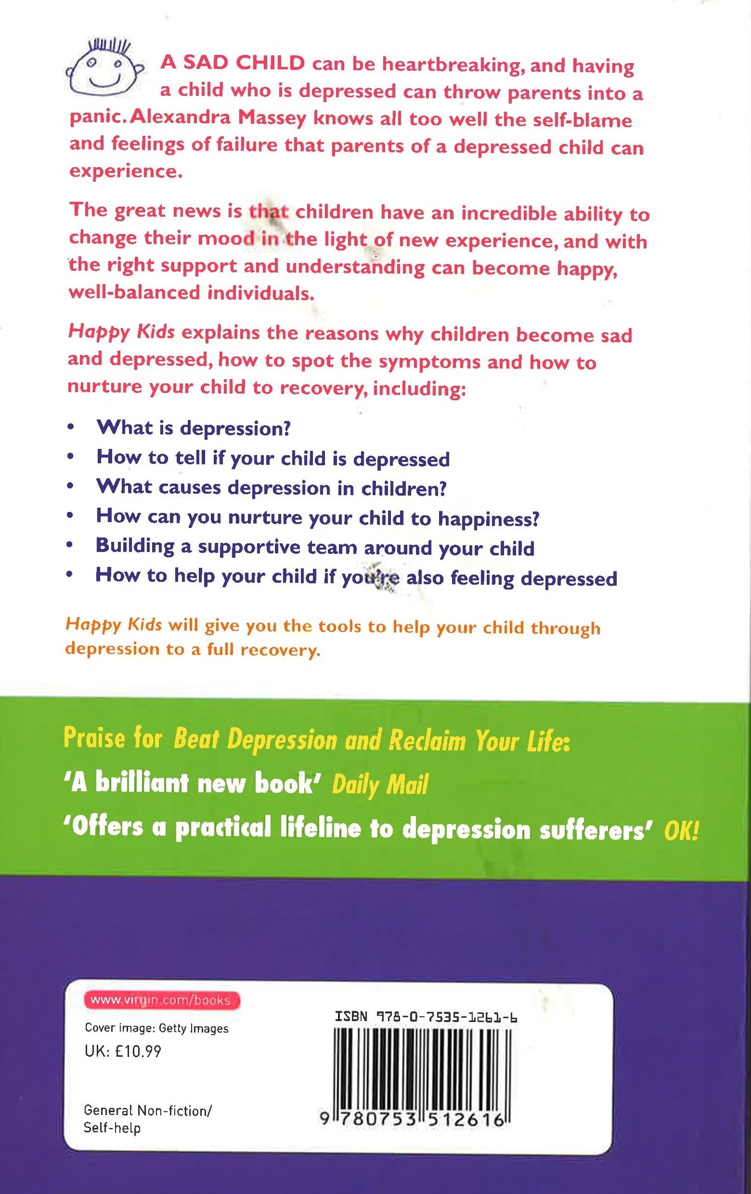 Depression in children is growing at such a rate that it is now recognised as a major health problem, both in the UK and internationally. This book, by the bestselling author of Beat Depression and Reclaim Your Life, will help deal with this problem in a friendly and practical way.With clear explanations of what depression is and how kids get depressed, along with practical advice on managing the symptoms and nurturing the child, this book will offer hope to all parents whose children are struggling with this increasingly common condition. The book includes chapters on:What is depression?Managing the symptoms Nurturing the childBuilding a team around the childThe importance of FamilyAlexandra Massey uses her expert knowledge and her own experience of childhood depression (both her own and that of her child) to offer positive help and support to parents.
