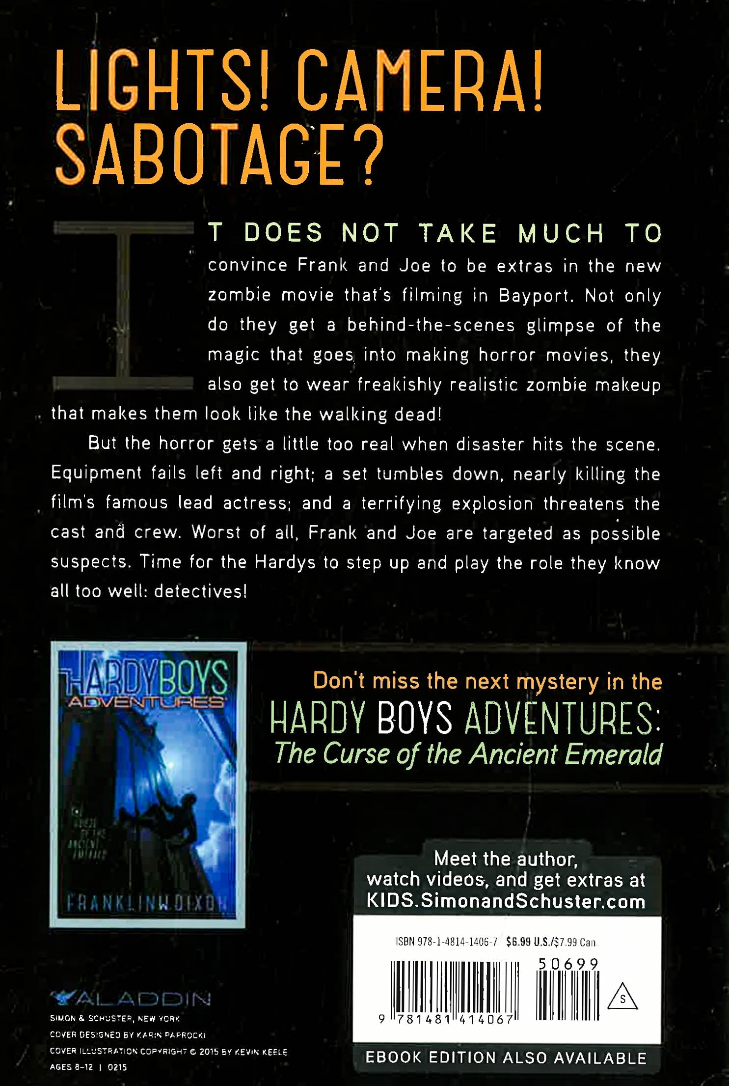 It's lights, camera, disaster for a film crew unless Frank and Joe can track down a saboteur in this cinematic Hardy Boys adventure--a fresh approach to a classic series. Joe and Frank Hardy are excited to be cast as extras in the zombie movie that's filming in their hometown. Not only is film production way more exciting than what usually goes on in Bayport, it also doesn't hurt that the lead actress is pretty cute. At first it seems like for once Frank and Joe might not have a mystery to solve. But when a stunt goes horribly wrong, the Hardy boys know someone is trying to sabotage the film--and putting lives in jeopardy. Can the brothers find the culprit before it's too late?