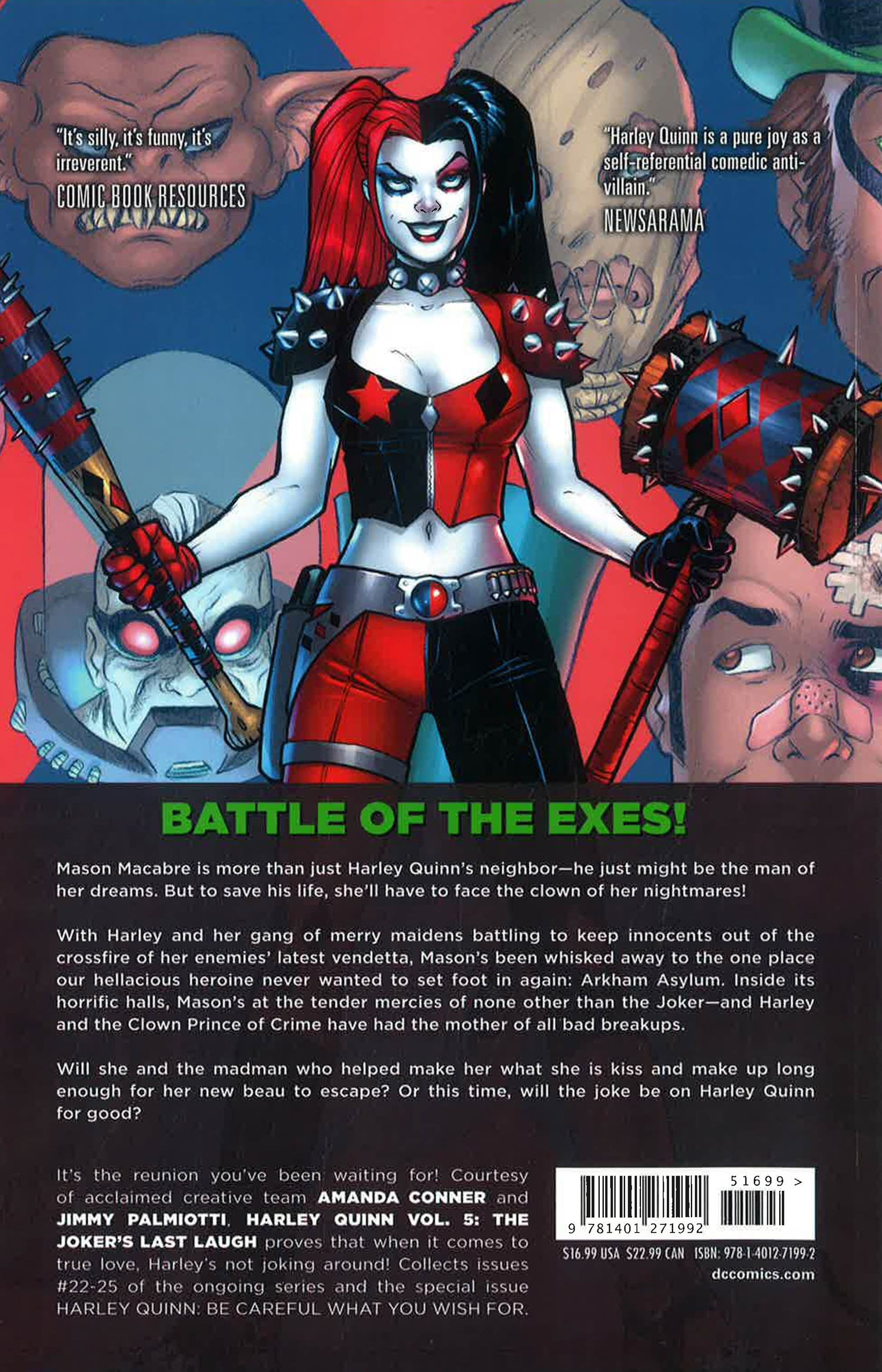 It’s the reunion you’ve been waiting for! Courtesy of acclaimed creative team Amanda Conner and Jimmy Palmiotti, HARLEY QUINN VOL. 5: THE JOKER’S LAST LAUGH proves that when it comes to true love, Harley’s not joking around! Collects issue #22-25 of the ongoing series and the special issue, HARLEY QUINN: BE CAREFUL WHAT YOU WISH FOR.