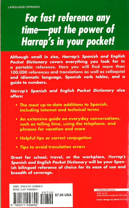The ideal portable reference for beginners or intermediate learners of Spanish "Harrap's Spanish and English Pocket Dictionary "is the most comprehensive portable dictionary available today. Fully revised and up-to-date, this authoritative reference features more than 57,000 references, 90,000 translations, and thorough coverage of Latin American Spanish. Concise and exceptionally easy to use, it's the perfect dictionary for use at home or in school. In addition, this highly accessible guide: Covers hundreds of new words and expressions, including slang, colloquial usage, technical language, and Internet terms Provides numerous usage notes to help users avoid translation pitfalls Includes a handy guide to Spanish verbs Uses Harrap's extensive language databases and large-scale reading programs to guarantee thorough coverage of all areas of vocabulary and monitor new words