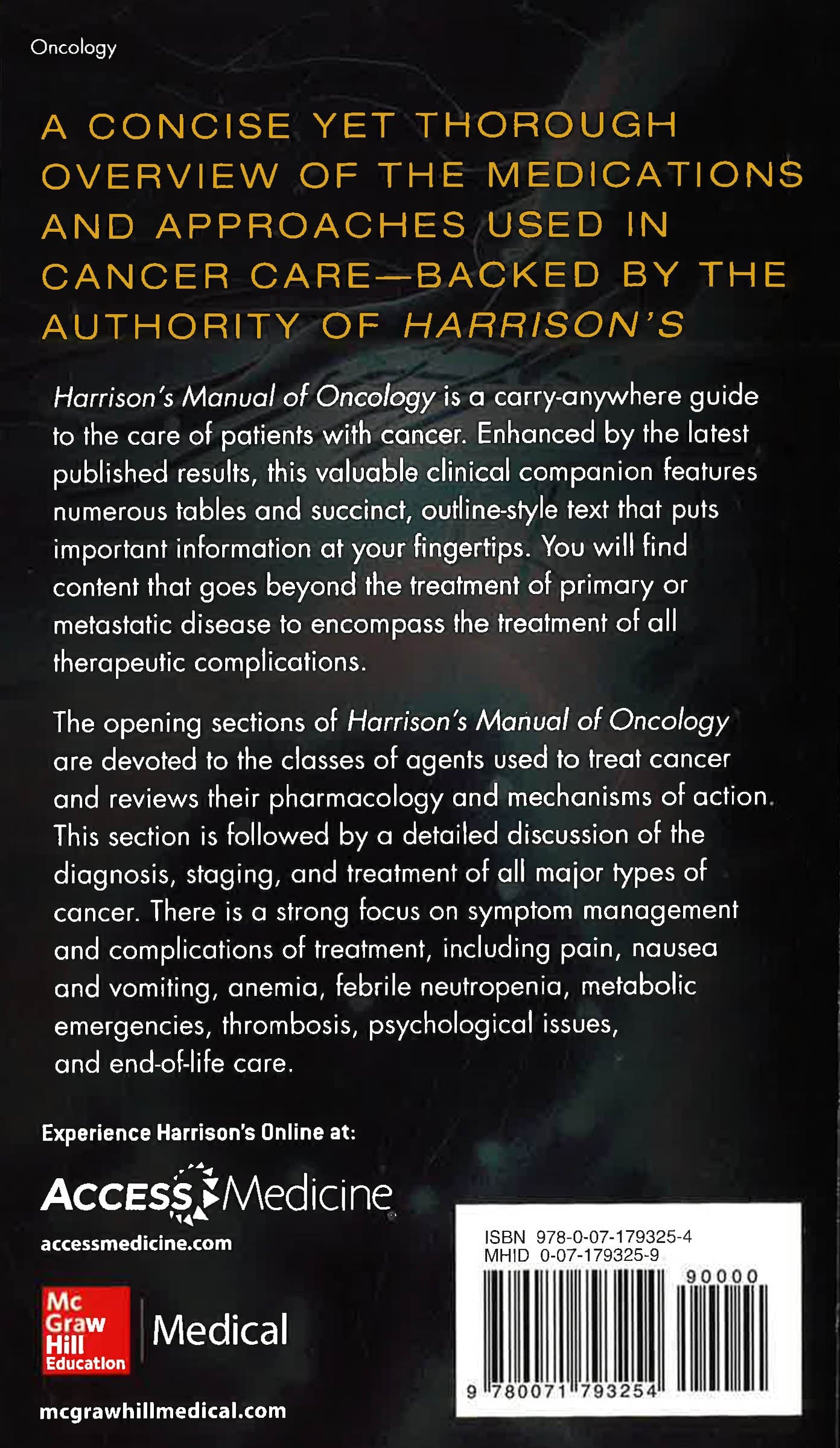 Publisher's Note: Products purchased from Third Party sellers are not guaranteed by the publisher for quality, authenticity, or access to any online entitlements included with the product. A CONCISE YET THOROUGH OVERVIEW OF THE MEDICATIONS AND APPROACHES USED IN CANCER CARE--BACKED BY THE AUTHORITY OF HARRISON'SHarrison's Manual of Oncology is a carry-anywhere guide to the care of patients with cancer. Enhanced by the latest published results, this valuable clinical companion features numerous tables and succinct, outline-style text that puts important information at your fingertips. You will find content that goes beyond the treatment of primary or metastatic disease to encompass the treatment of all therapeutic complications. The opening sections of Harrison's Manual of Oncology are devoted to the classes of agents used to treat cancer and reviews their pharmacology and mechanisms of action. This section is followed by a detailed discussion of the diagnosis, staging, and treatment of all major types of cancer. There is a strong focus on symptom management and complications of treatment, including pain, nausea and vomiting, anemia, febrile neutropenia, metabolicemergencies, thrombosis, psychological issues, and end-of-life care.