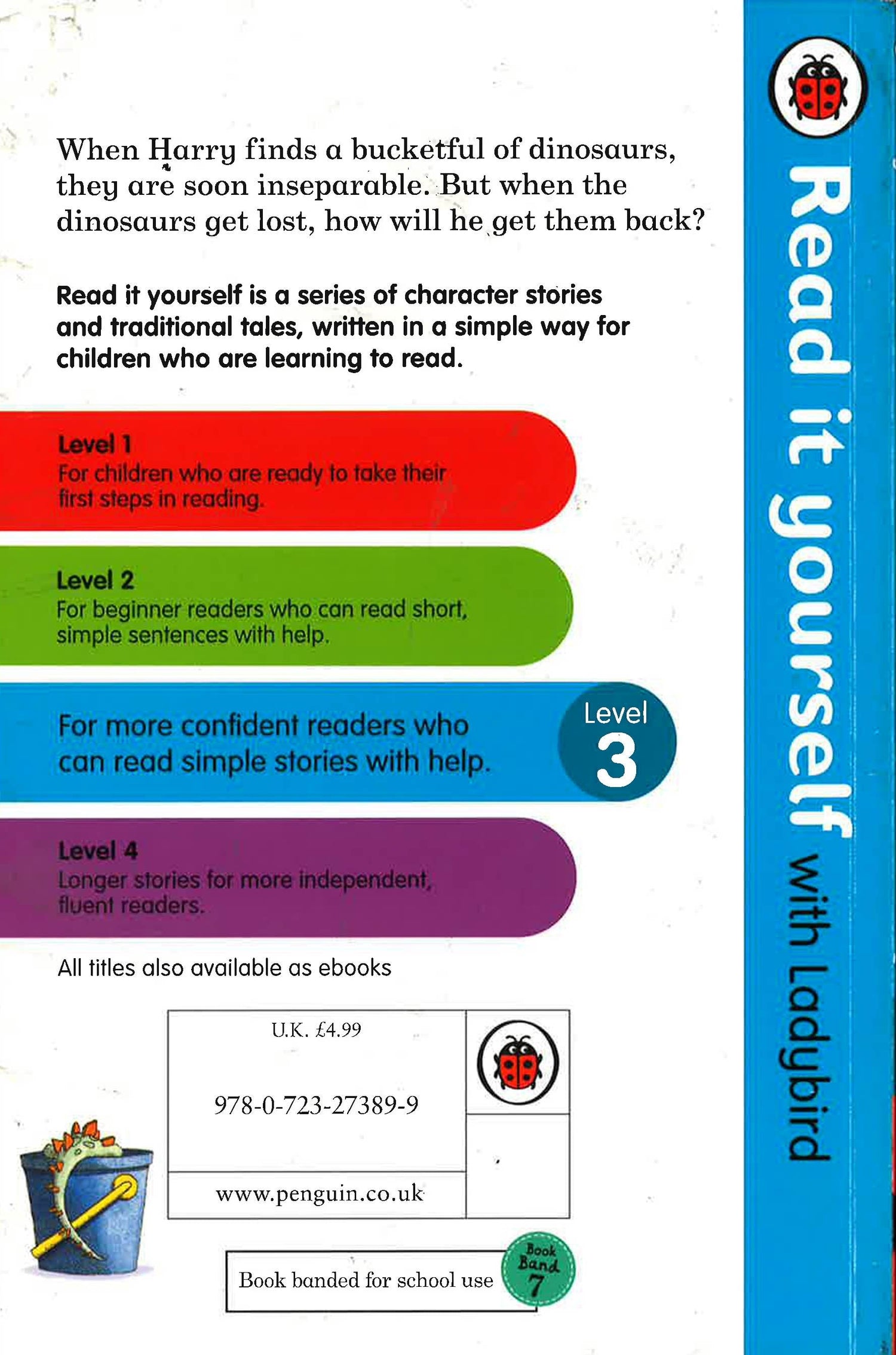 When Harry finds a bucketful of dinosaurs in the attic, they soon become inseparable. But when the dinosaurs get lost, how will Harry get them back? Read it yourself with Ladybird is one of Ladybird's best-selling series. For over thirty-five years it has helped young children who are learning to read develop and improve their reading skills. Each Read it yourself book is very carefully written to include many key, high-frequency words that are vital for learning to read, as well as a limited number of story words that are introduced and practised throughout. Simple sentences and frequently repeated words help to build the confidence of beginner readers and the four different levels of books support children all the way from very first reading practice through to independent, fluent reading. Each book has been carefully checked by educational consultants and can be read independently at home or used in a guided reading session at school. Further content includes comprehension puzzles, helpful notes for parents, carers and teachers, and book band information for use in schools.