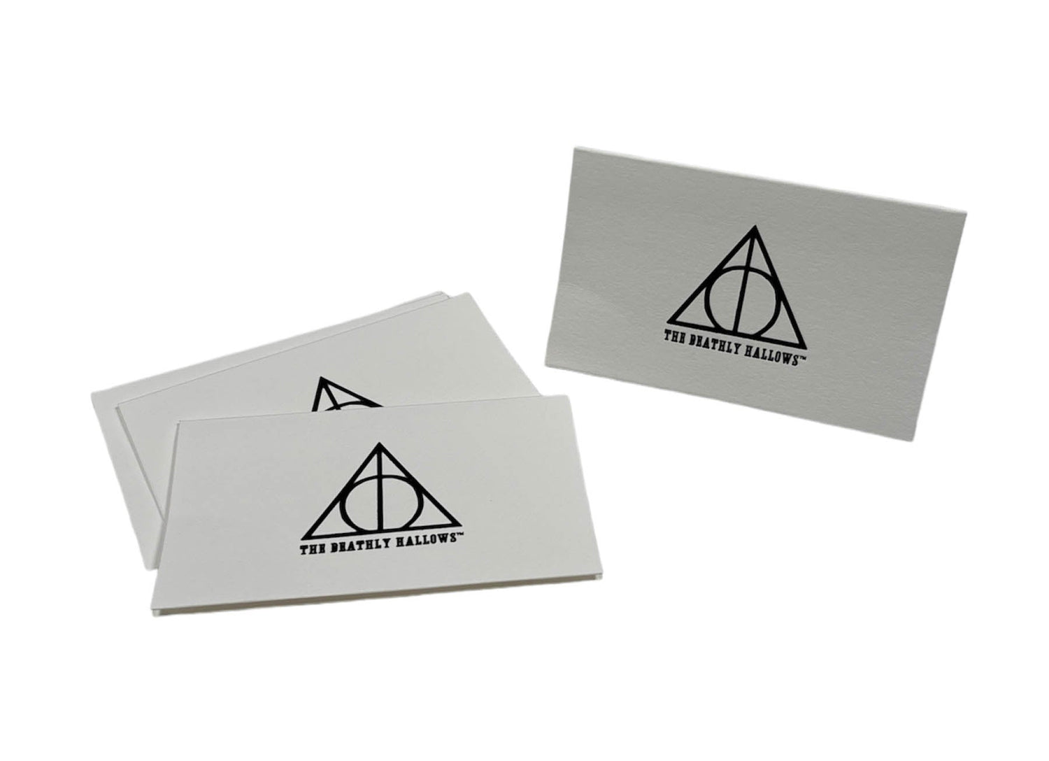The Elder Wand, the Resurrection Stone, and the Cloak of Invisibility—together these make up the Deathly Hallows. According to the legend featured in the films, they were bestowed upon three brothers who cheated Death, as both prize and punishment. These blank gift enclosure cards honor the Deathly Hallows by showcasing their classic symbol in a clean, minimal design. A perfect accessory to the beloved Harry Potter films, the Deathly Hallows Foil Gift Enclosure Cards invite fans to show their love for the magical series.