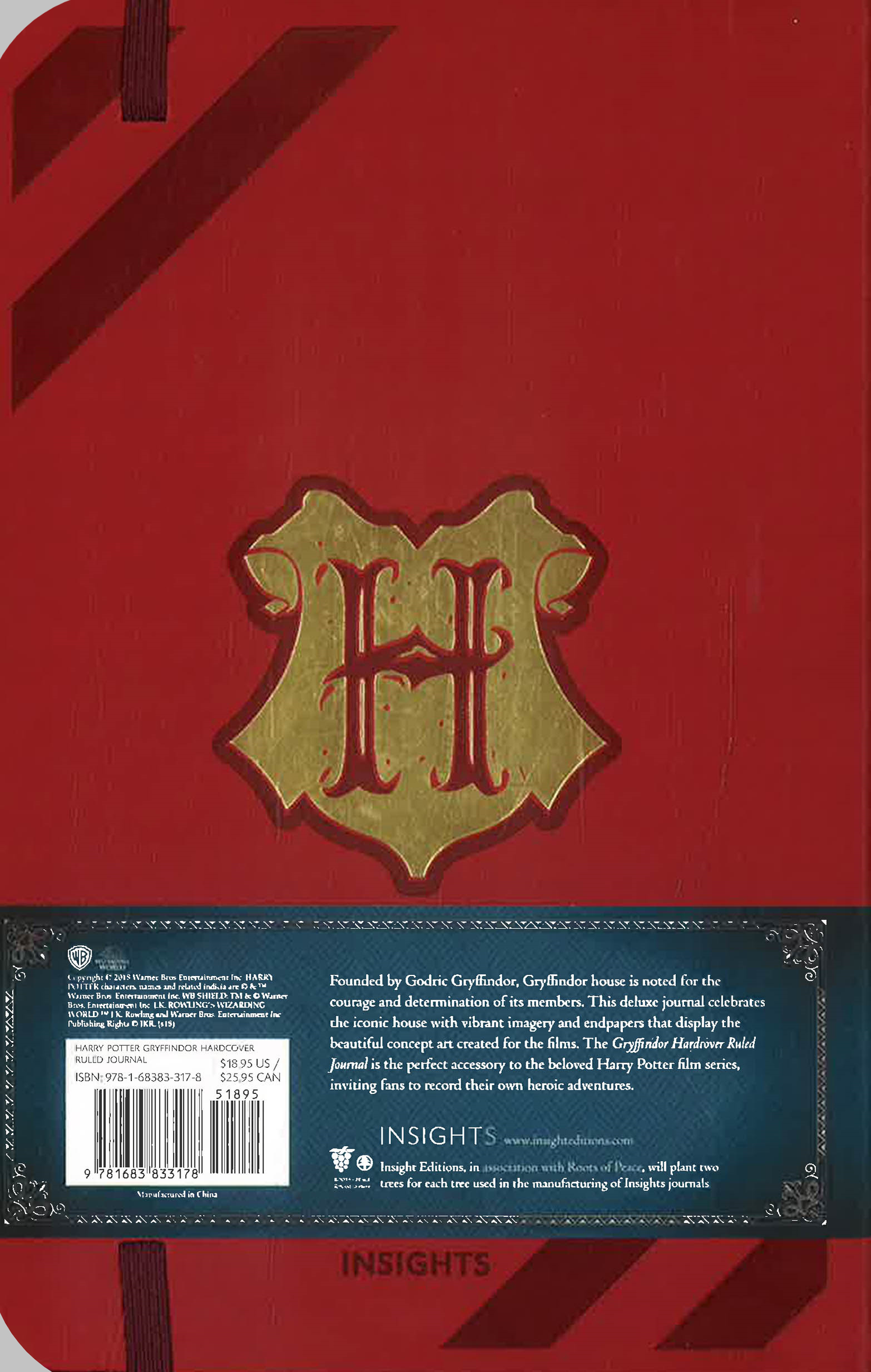 With sturdy construction and a sewn binding, this journal lies flat, and the 192 lined, acid-free pages of high-quality, heavy stock paper take both pen and pencil nicely to encourage inspiration. The journal also features a ribbon placeholder, elastic closure, and 7.5 x 4.5-inch back pocket, ideal for holding photographs and mementos. A new take on Insight's classic Harry Potter Gryffindor Hardcover Ruled Journal, this journal invites fans to chronicle their magical adventures.