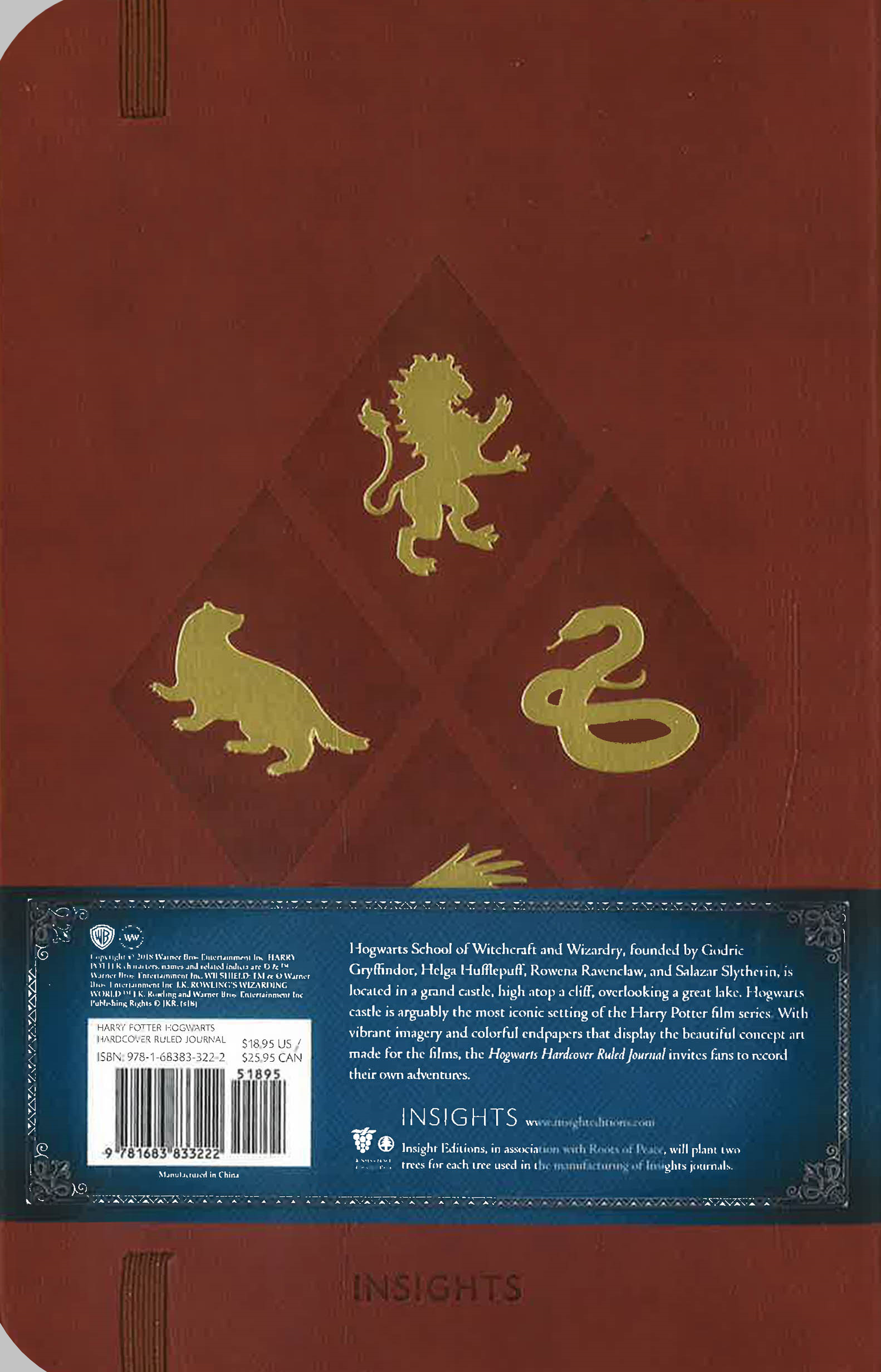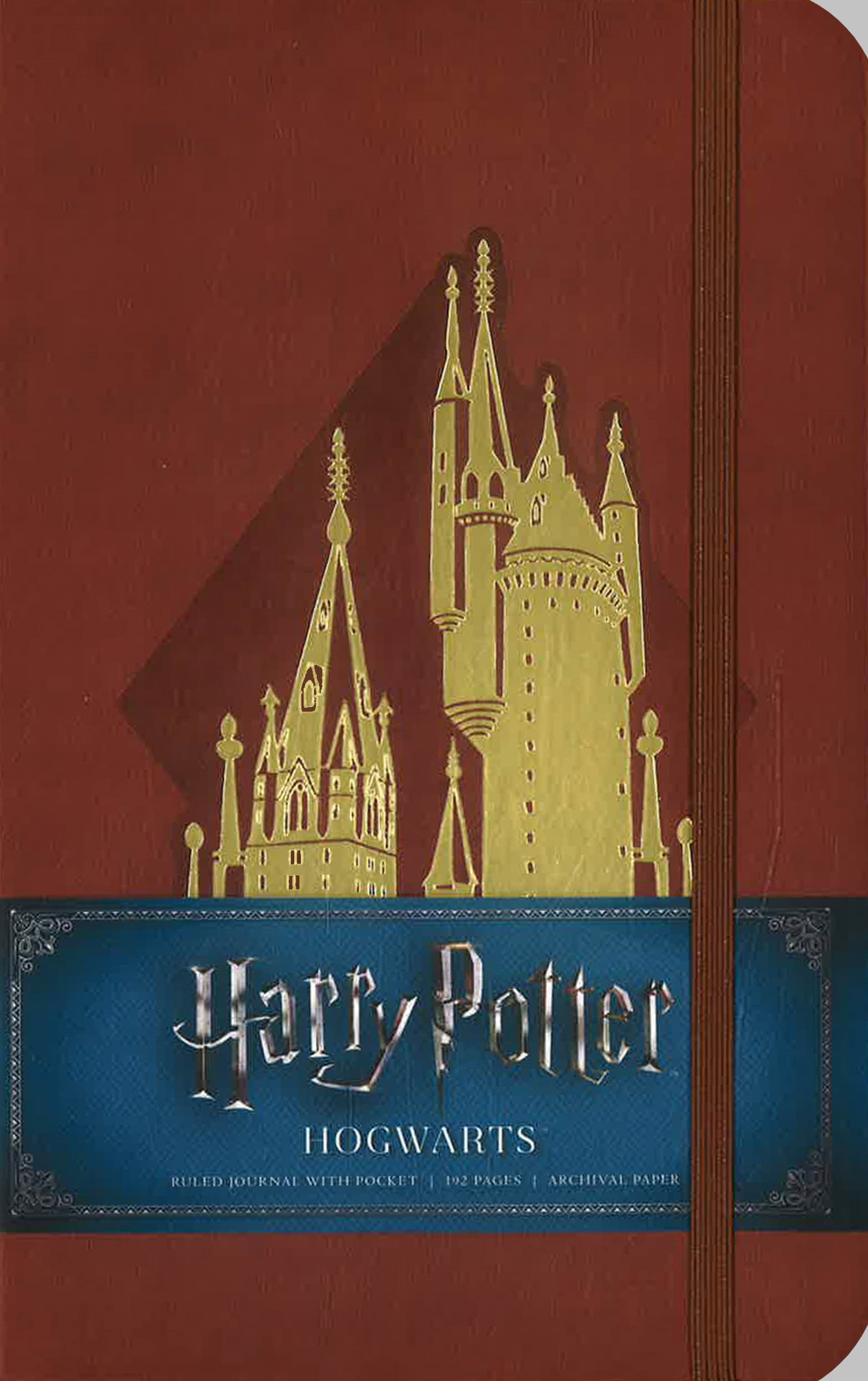 With sturdy construction and a sewn binding, this journal lies flat, and the 192 lined, acid-free pages of high-quality, heavy stock paper take both pen and pencil nicely to encourage inspiration. The journal also features a ribbon placeholder, elastic closure, and 7.5 x 4.5-inch back pocket, ideal for holding photographs and mementos. A new take on Insight's classic Harry Potter Hogwarts Hardcover Ruled Journal, this journal invites fans to chronicle their magical adventures.