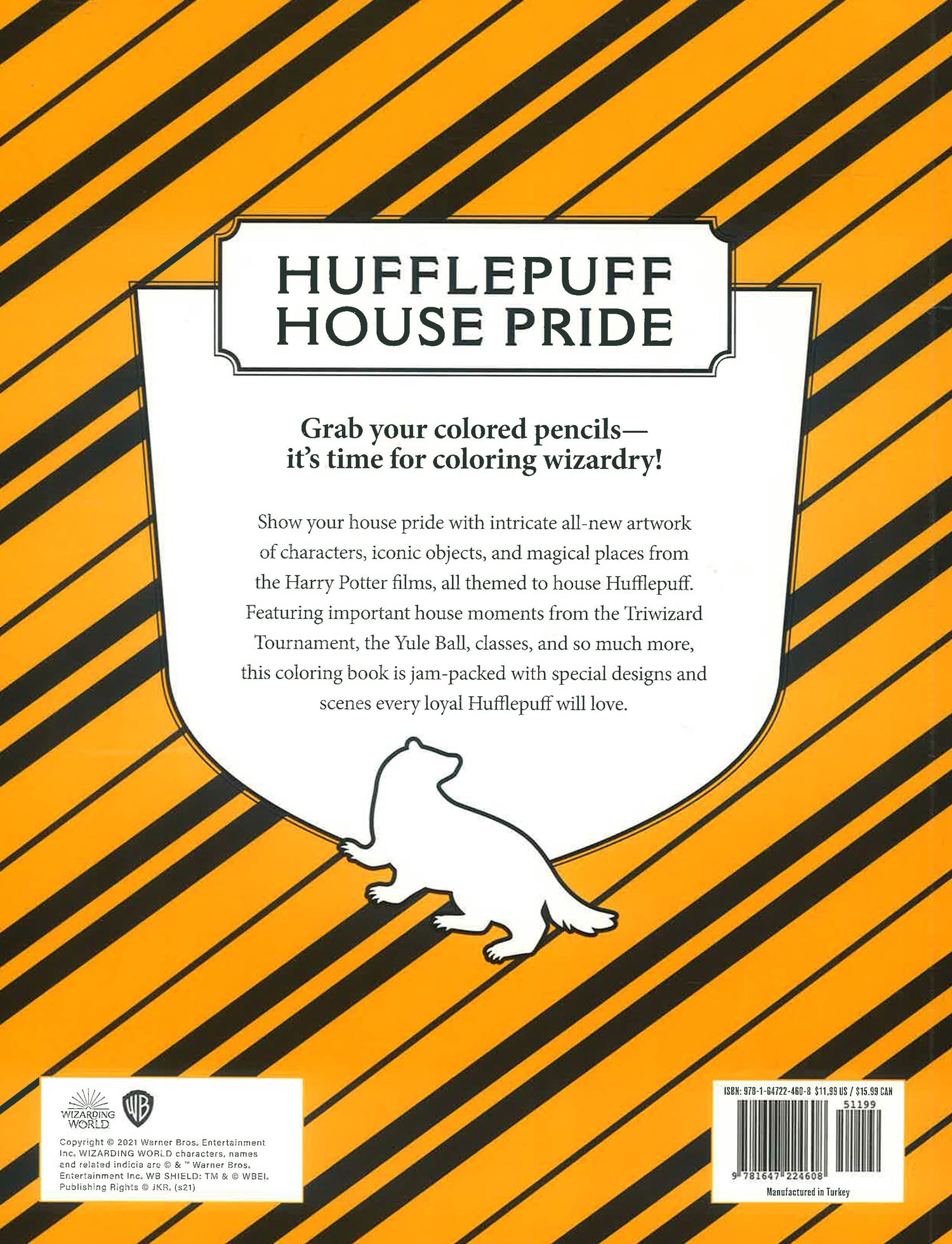Grab your colored pencils—it's time for coloring wizardry! Show your house pride with intricate all-new artwork of characters, iconic objects, and magical places from the Harry Potter films, all themed to house Hufflepuff. Featuring important house moments from the Triwizard Tournament, Yule Ball, feasts, and so much more, this coloring book is jam-packed with special designs and scenes every loyal Hufflepuff will love.