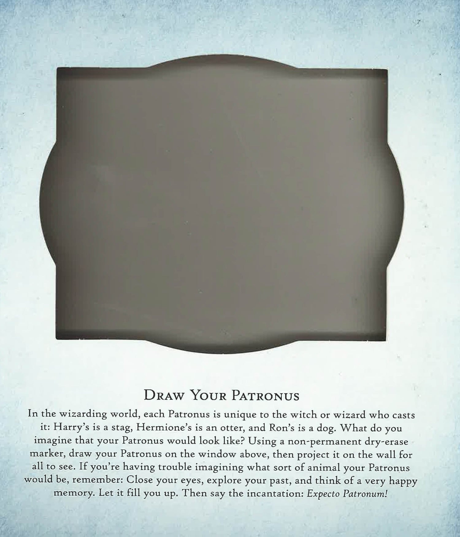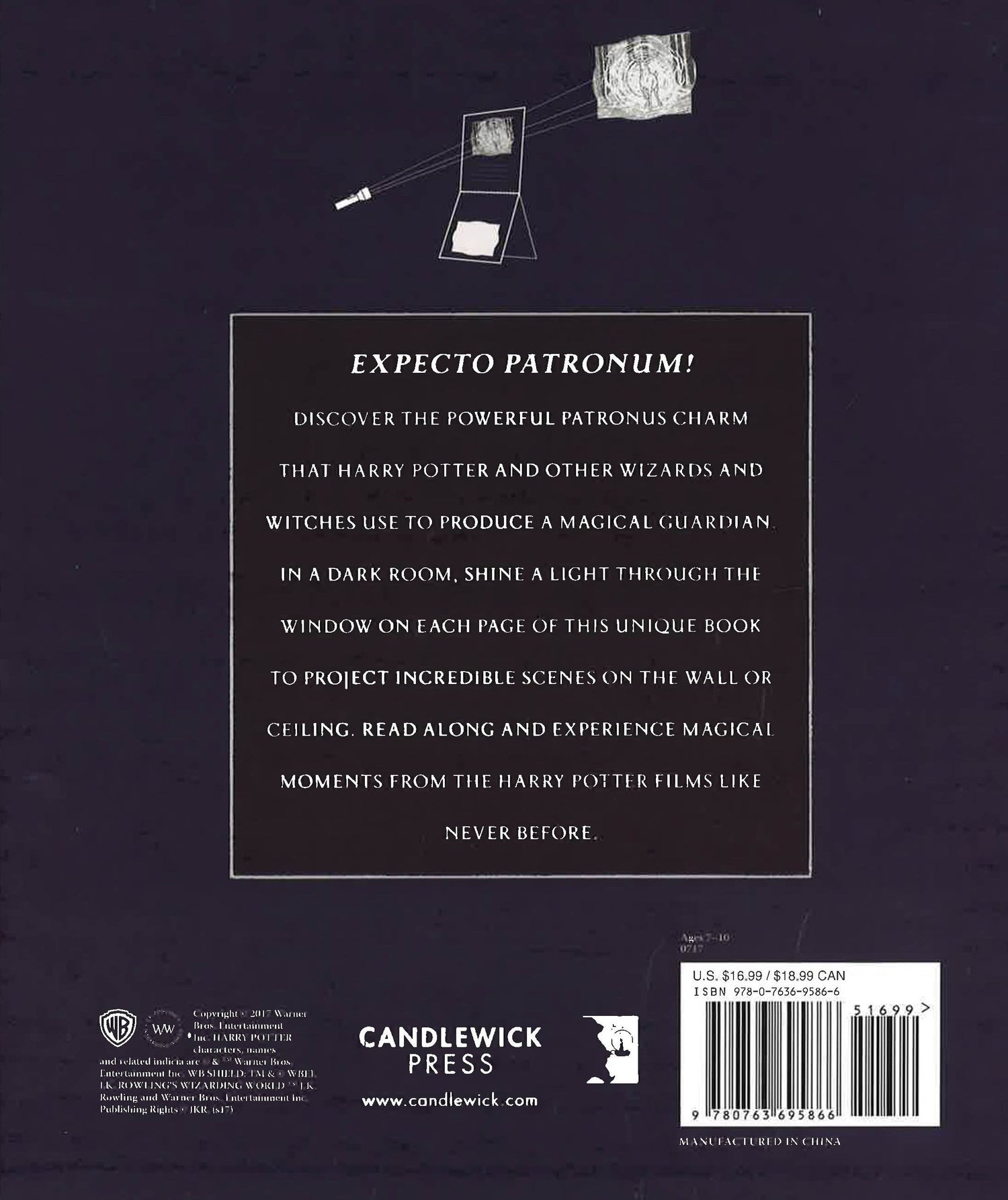 Using black line illustrations on framed acetate pages, this enchanting book allows fans to project their favorite scenes from the Harry Potter films at home with a flashlight. Expecto Patronum! Discover the powerful Patronus Charm that Harry Potter and other wizards and witches use to produce a magical guardian. In a dark room, shine a light through the window on each page of this unique book to project incredible scenes on the wall or ceiling. Read along and experience magical moments from the Harry potter films like never before.