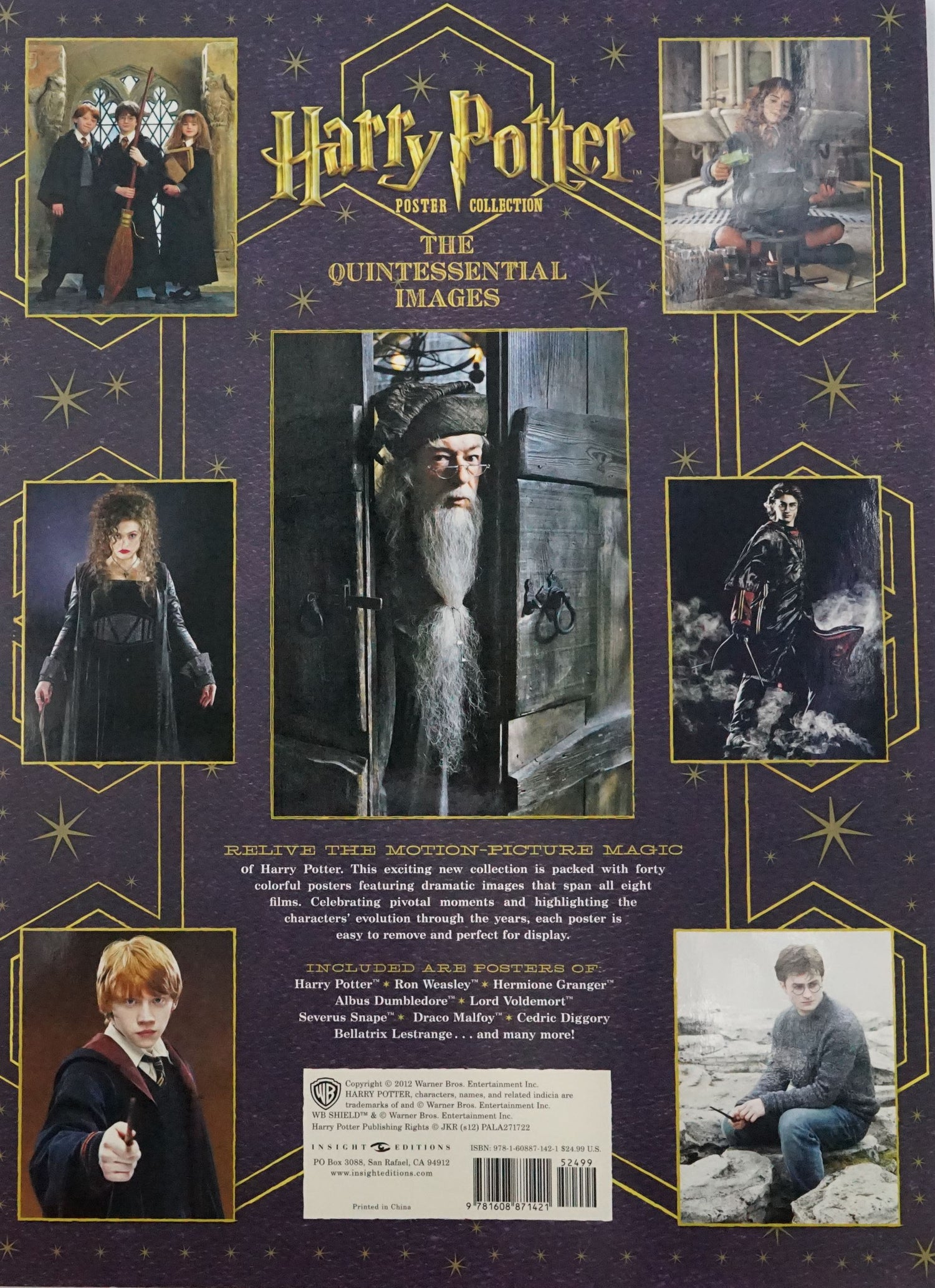 This beautiful poster book captures the magic of the Harry Potter films in an exciting new format. Harry Potter: The Quintessential Images comes with forty large-scale, display-worthy posters, featuring your favorite Harry Potter characters in striking poses — from Harry Potter, Hermione Granger, and Ron Weasley to Severus Snape, Albus Dumbledore, Bellatrix Lestrange, and even Dobby the house-elf. The posters span all eight feature films, celebrating pivotal moments and highlighting each character’s evolution through the years. The posters are printed on glossy cardstock and adhesive-bound inside a protective cover. Easily removable as full sheets, they’re crease-free and ideal for displaying. Whether your display of choice is Harry and Ron in full Quidditch gear; Hermione dressed for the Yule Ball; Cedric Diggory in his Hufflepuff robe; the ever-malicious Malfoys; or dozens of others — you’ll find a fun and colorful array in this keepsake collection.