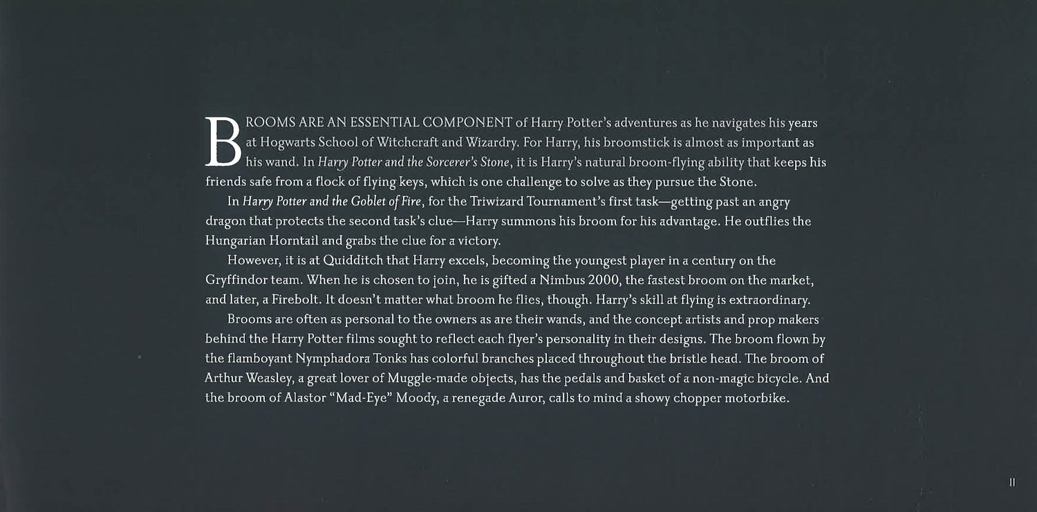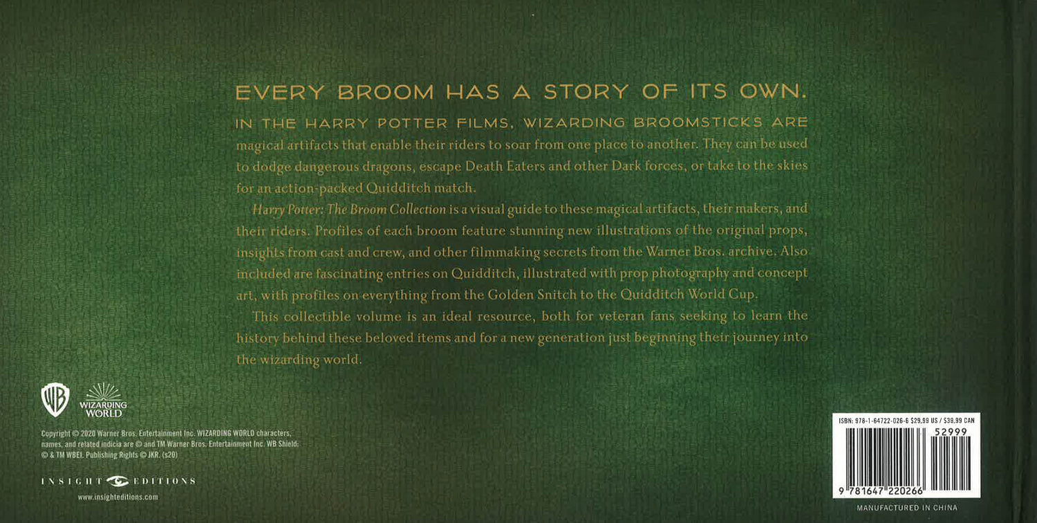 Harry Potter: The Broom Collection is a visual guide to these magical artifacts, their makers, and their riders. Profiles of each broom feature stunning new illustrations of the original props, insights from cast and crew, and other filmmaking secrets from the Warner Bros. archive. Also included are fascinating entries on Quidditch, illustrated with prop photography and concept art, with profiles on everything from the Golden Snitch to the Quidditch World Cup.