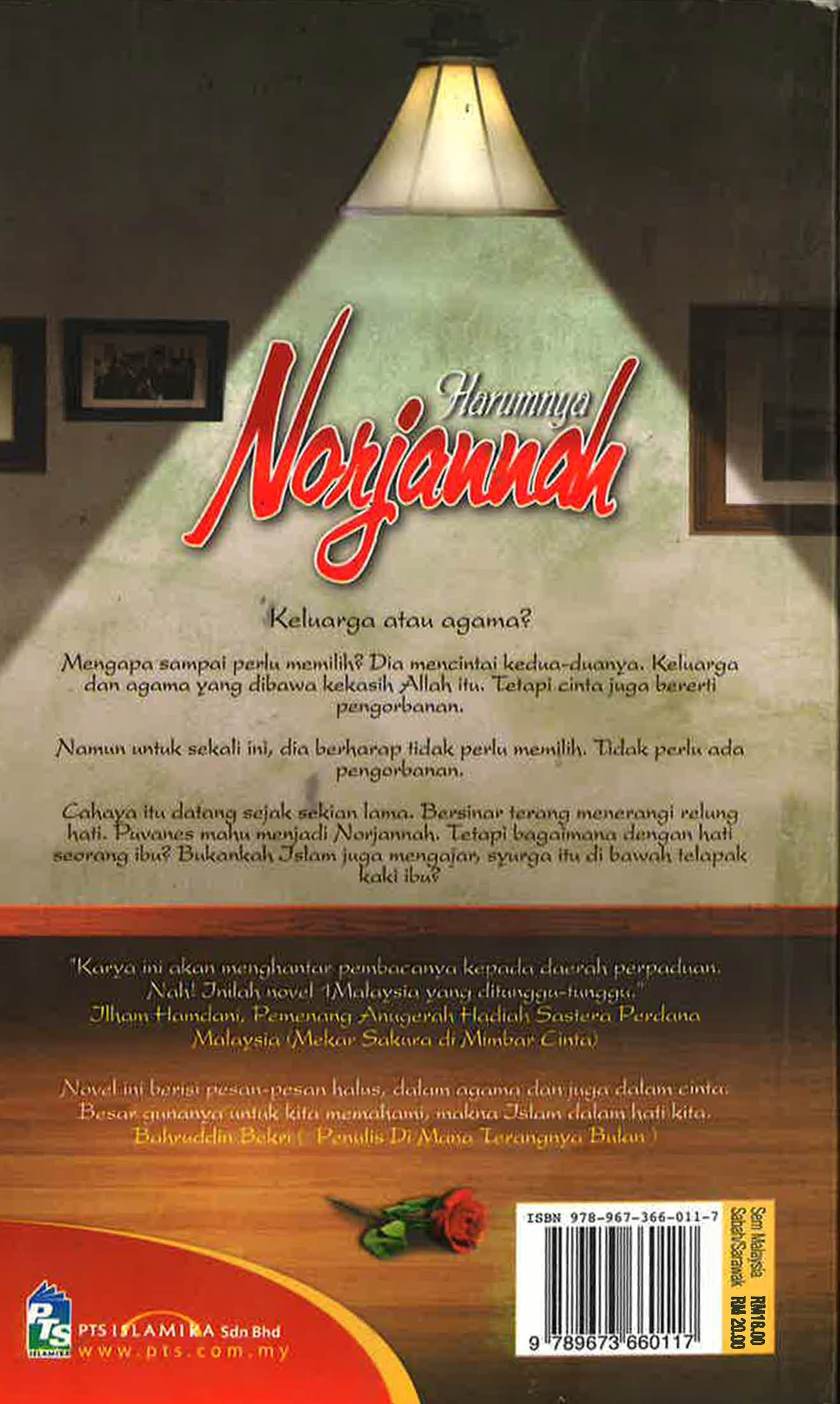Keluarga atau agama? Mengapa sampai perlu memilih? Dia mencintai kedua-duanya. Keluarga dan agama yang dibawa kekasih Allah itu. Tetapi cinta juga bererti pengorbanan. Namun untuk sekali ini, dia berharap tidak perlu memilih. Tidak perlu ada pengorbanan. Cahaya itu datang sejak sekian lama. Bersinar terang menerangi relung hati. Puvanes mahu menjadi Norjannah. Tetapi bagaimana dengan hati seorang ibu? Bukankah Islam juga mengajar syurga itu di bawah telapak kaki ibu. "Karya ini akan menghantar pembacanya kepada daerah perpaduan. Nah! Inilah novel 1Malaysia yang ditunggu-tunggu." Jihan Hamdani, Pemenang Anugerah Hadiah Sastera Perdana Malaysia (Mekar Sakura di Mimbar Cinta) Novel ini berisi pesan-pesan halus, dalam agama dan juga dalam cinta. Besar gunanya untuk kita memahami, makna Islam dalam hati kita. Bahruddin Bekri ( Penulis Di Mana Terangnya Bulan)
