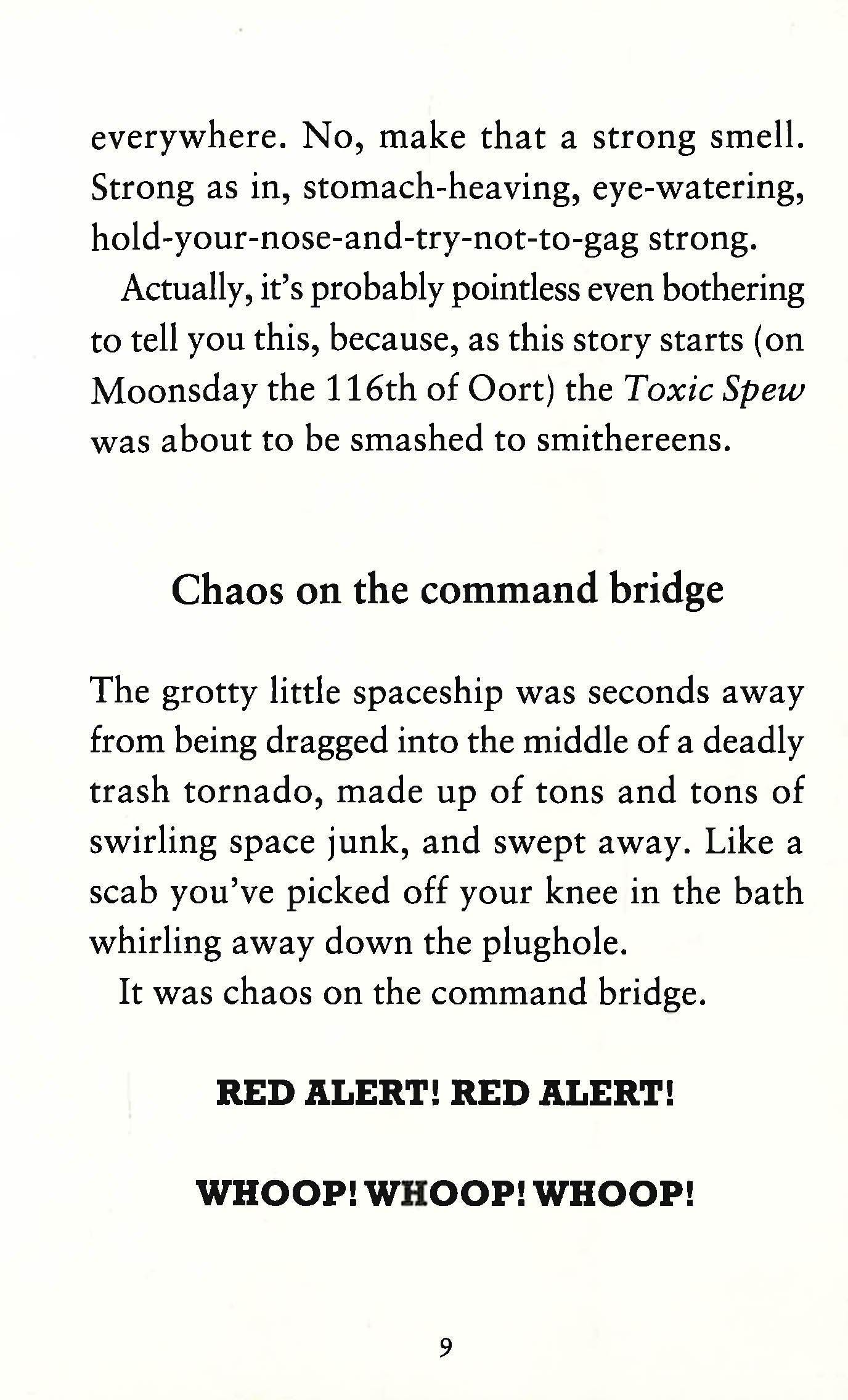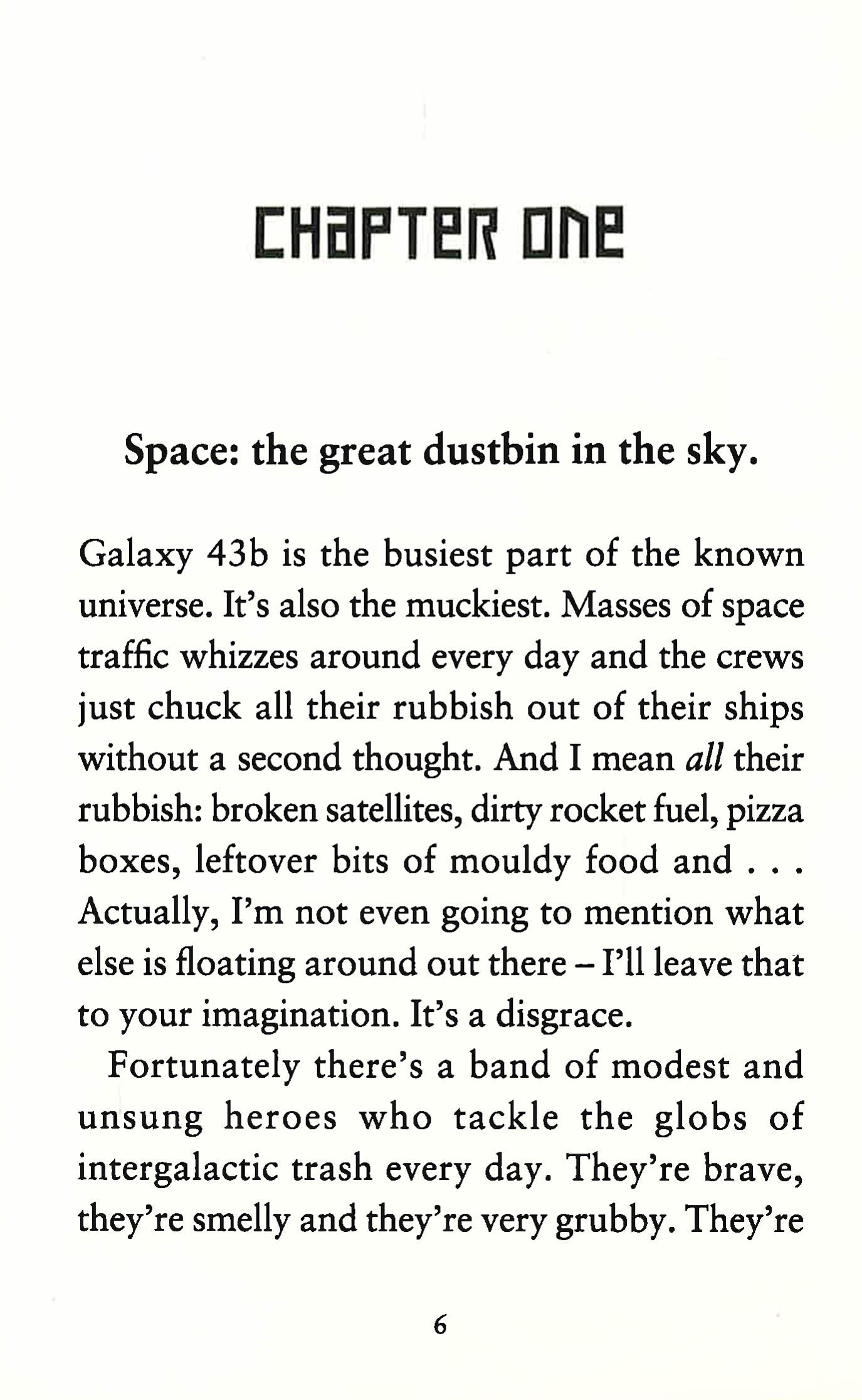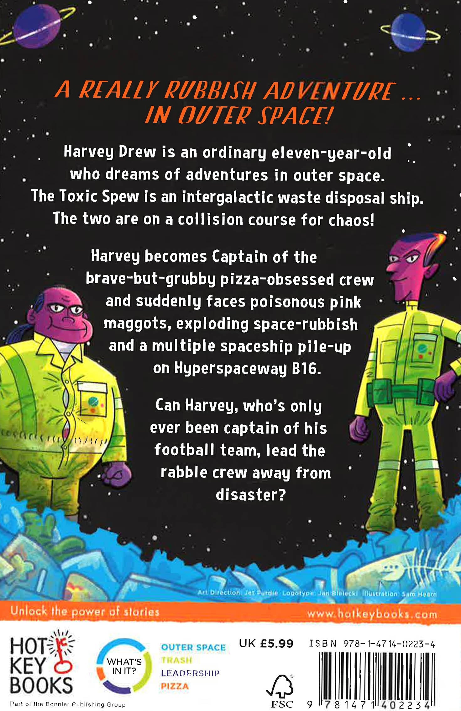 After Harvey unwittingly responds to an alien signal, he is transported to the flight deck of The Toxic Spew by the ship's bad-tempered computer, who promptly loses his return address. Even though none of the crew have even heard of Earth, let alone met an Earthling, Harvey becomes Captain of the stroppy, pizza-obsessed, brave (but grubby) crew, and almost immediately has to save them from poisonous pink maggots, dangerous exploding space-rubbish and a multiple spaceship pile-up on Hyperspaceway B16. Luckily, leading his rabble crew out of danger isn't so different from captaining his football team, and it turns out Harvey is just the boy to save the day!