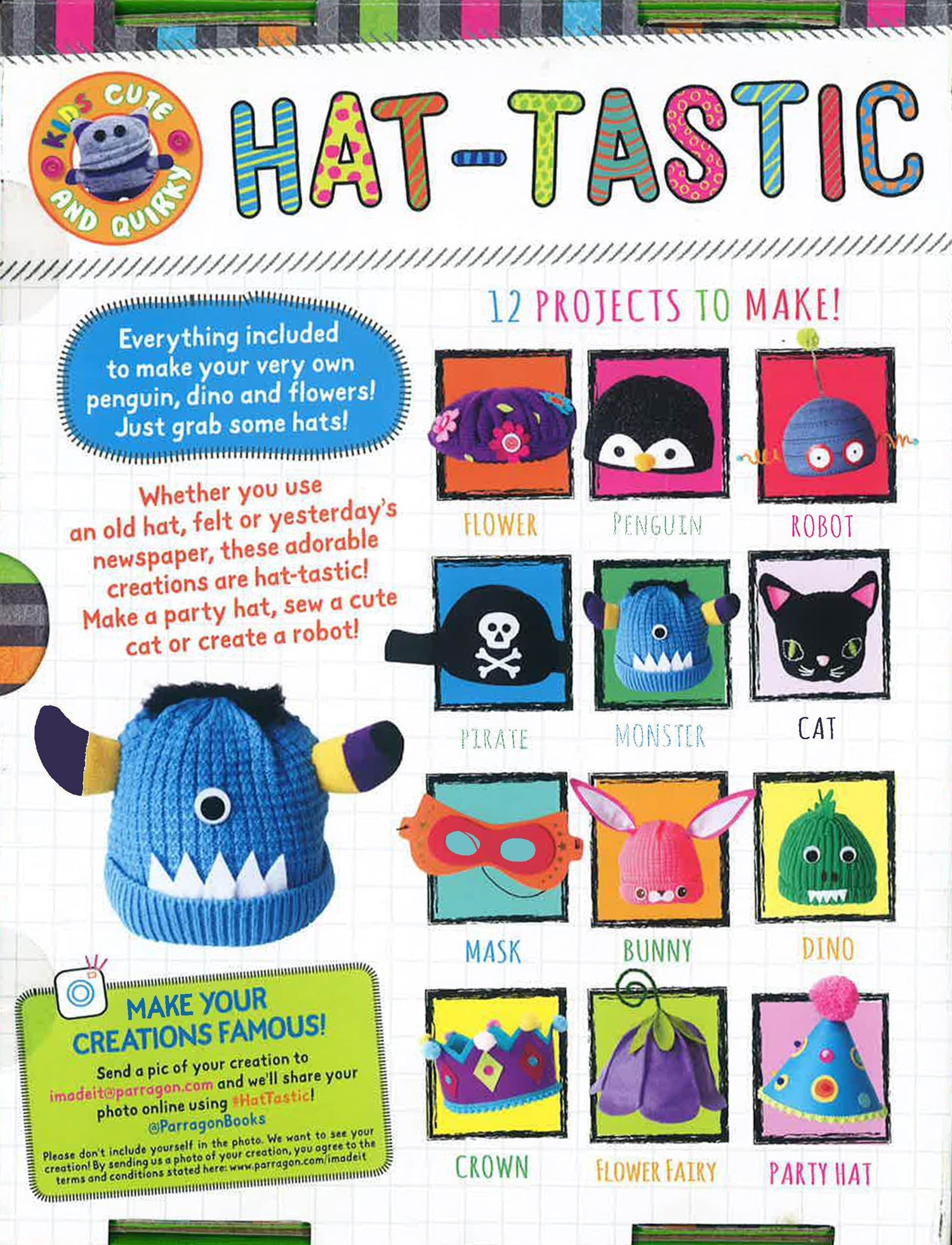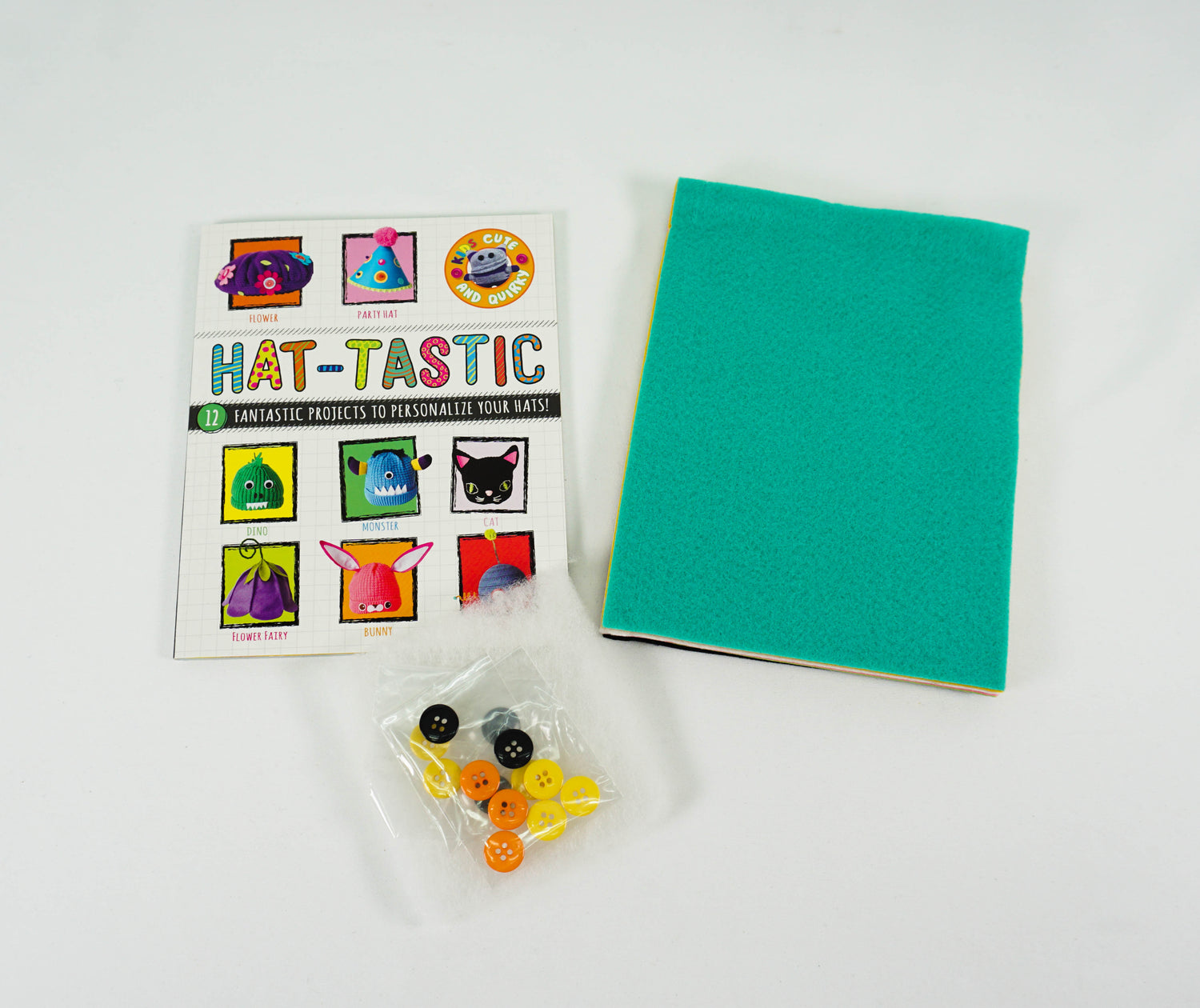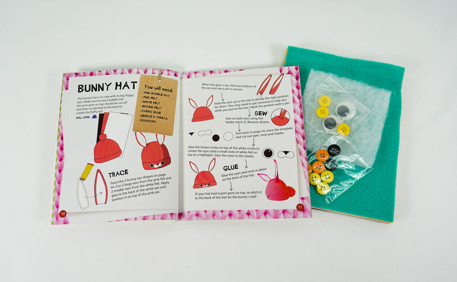 Start creating your own hat-tastic creations using an old hat, felt or even yesterday's newspaper. This kit comes with 12 adorable project ideas, a handy how-to book, and enough materials to make 3 different hats including 6 colourful felt pieces, 2 googly eyes, 11 buttons and 1 wad of stuffing! You can make a hat for a swashbuckling pirate, an adorable bunny or a crown to rule over your kingdom.