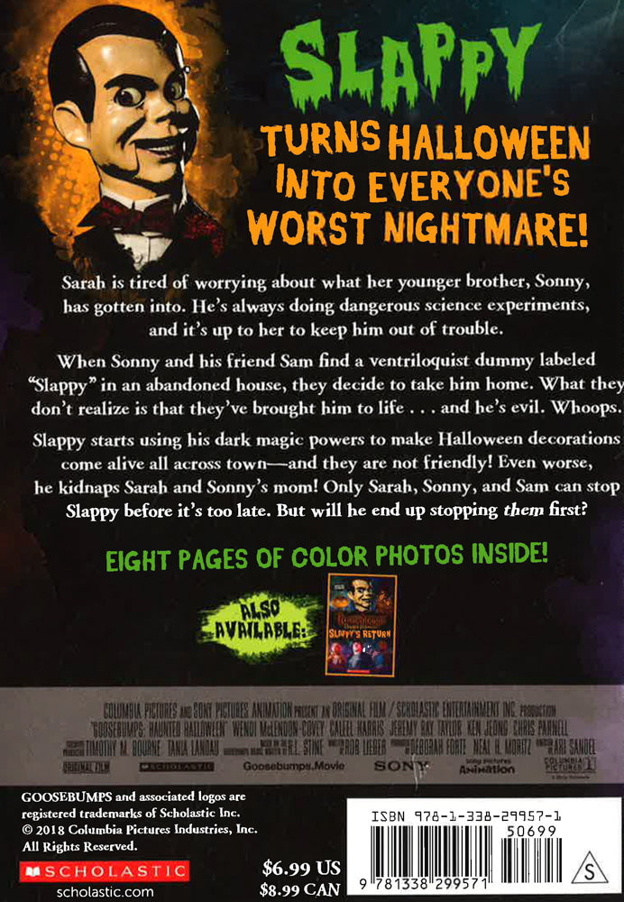 Slappy's back! The demented dummy and all his creepy pals are back for this sequel to the hit 2015 Goosebumps movie. Scholastic's junior novelization has all the chills, thrills, and laugh-out-loud horror of Goosebumps 2: Haunted Halloween (2018). Includes eight pages of colour photos from the movie. Slappy's back in this second Goosebumps movie tie-in novel! The demented dummy and all his creepy pals are back for this sequel to the hit 2015 Goosebumps movie which starred Jack Black (School of Rock) as the author, R L Stine. Scholastic's junior novelization has all the chills, thrills, and laugh-out-loud horror of Goosebumps 2: Haunted Halloween (2018). Includes eight pages of colour photos from the movie.