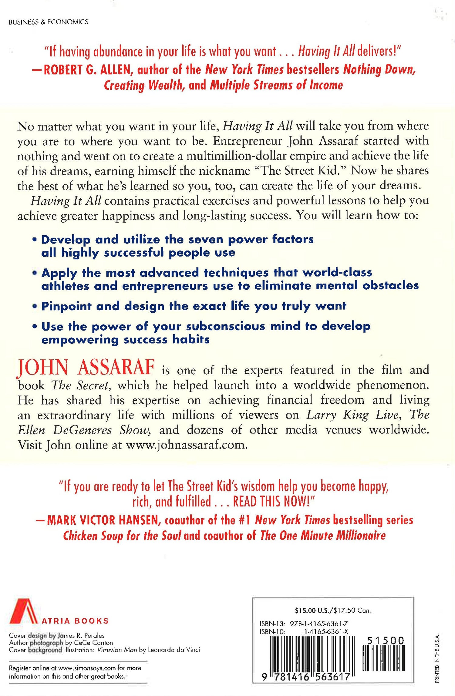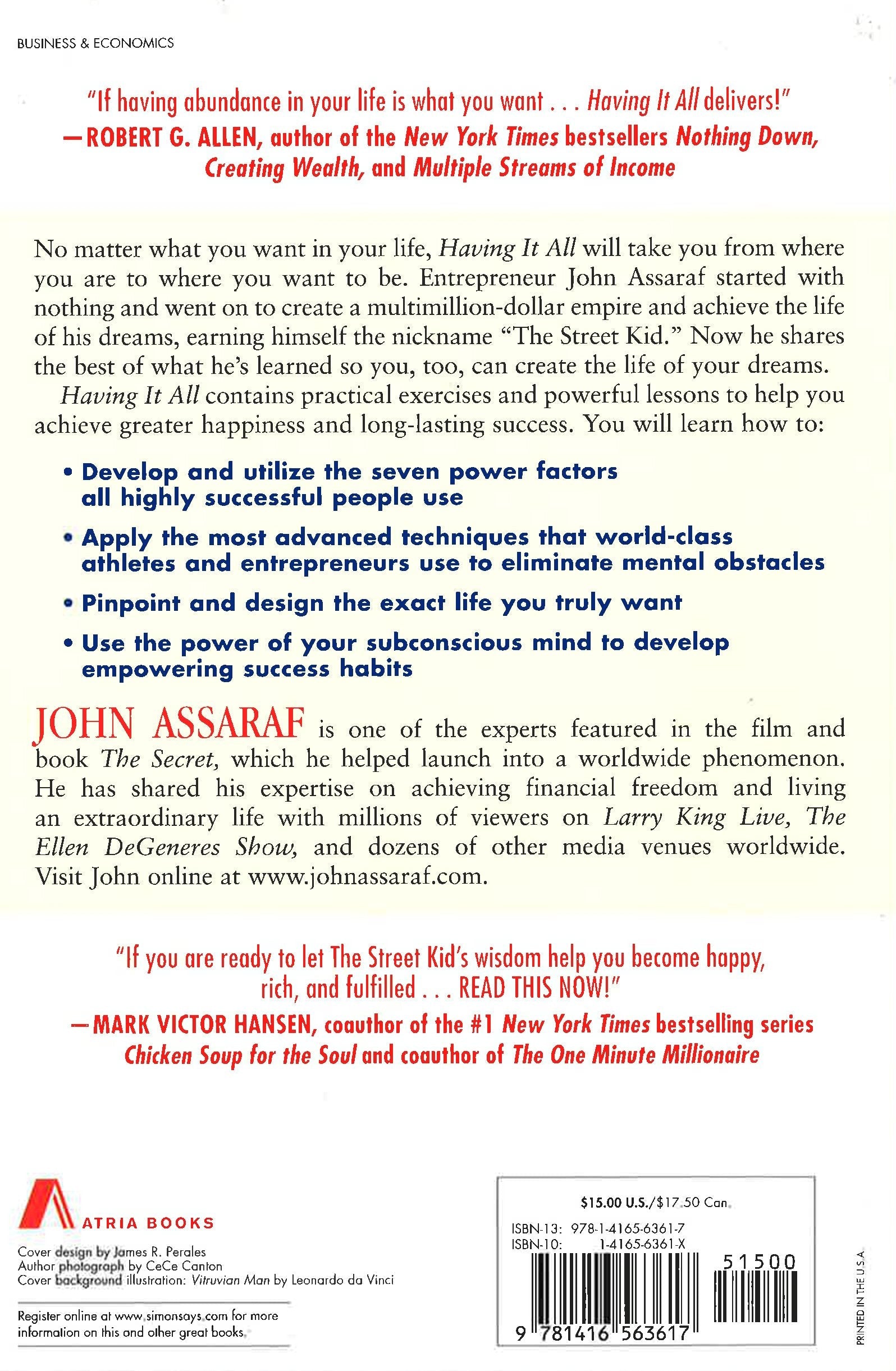 No matter what you want in your life, Having It All will take you from where you are to where you want to be. Entrepreneur John Assaraf started with nothing and went on to create a multimillion-dollar empire and achieve the life of his dreams, earning himself the nickname "The Street Kid." Now he shares the best of what he's learned so you, too, can create the life of your dreams. Having It All contains practical exercises and powerful lessons to help you achieve greater happiness and long-lasting success.