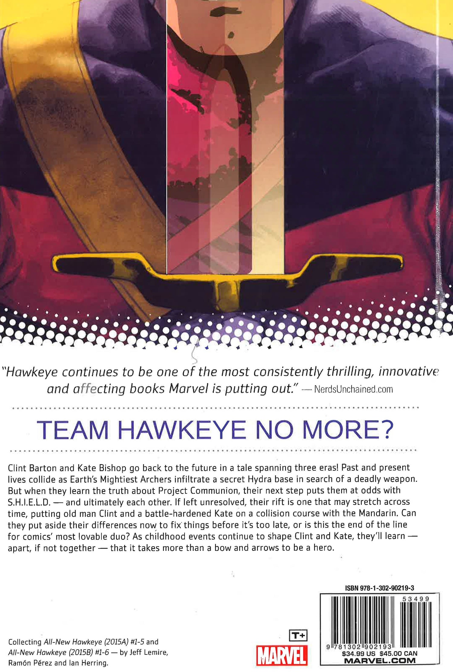 Team Hawkeye head back to the future! Kate Bishop and Clint Barton are thrown together in a new adventure spanning three eras! First, past and present lives collide as Kate and Clint face a threat that will challenge everything they know about what it means to be Hawkeye. Barton and Bishop race against time to save a group of innocent kids with devastating powers. But will their actions cause a deep-seated rift that stretches across time? Find out as we head to the future to join old man Clint and a wiser Kate as they are reluctantly reunited. As tomorrow's Hawkeyes confront the Mandarin, today's must discover what makes a hero and what breaks a hero. It's more than just a bow and arrows