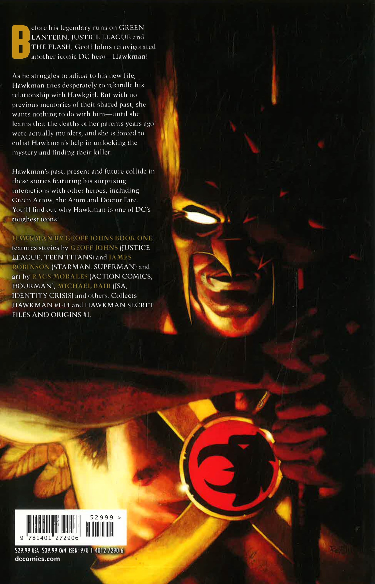 HAWKMAN BY GEOFF JOHNS BOOK ONE features stories by Geoff Johns (JUSTICE LEAGUE, TEEN TITANS) and James Robinson (STARMAN, SUPERMAN) and art by Rags Morales (ACTION COMICS, HOURMAN), Michael Bair (JSA, IDENTITY CRISIS) and others. Collects HAWKMAN #1-14 and HAWKMAN: SECRET FILES AND ORIGINS #1.