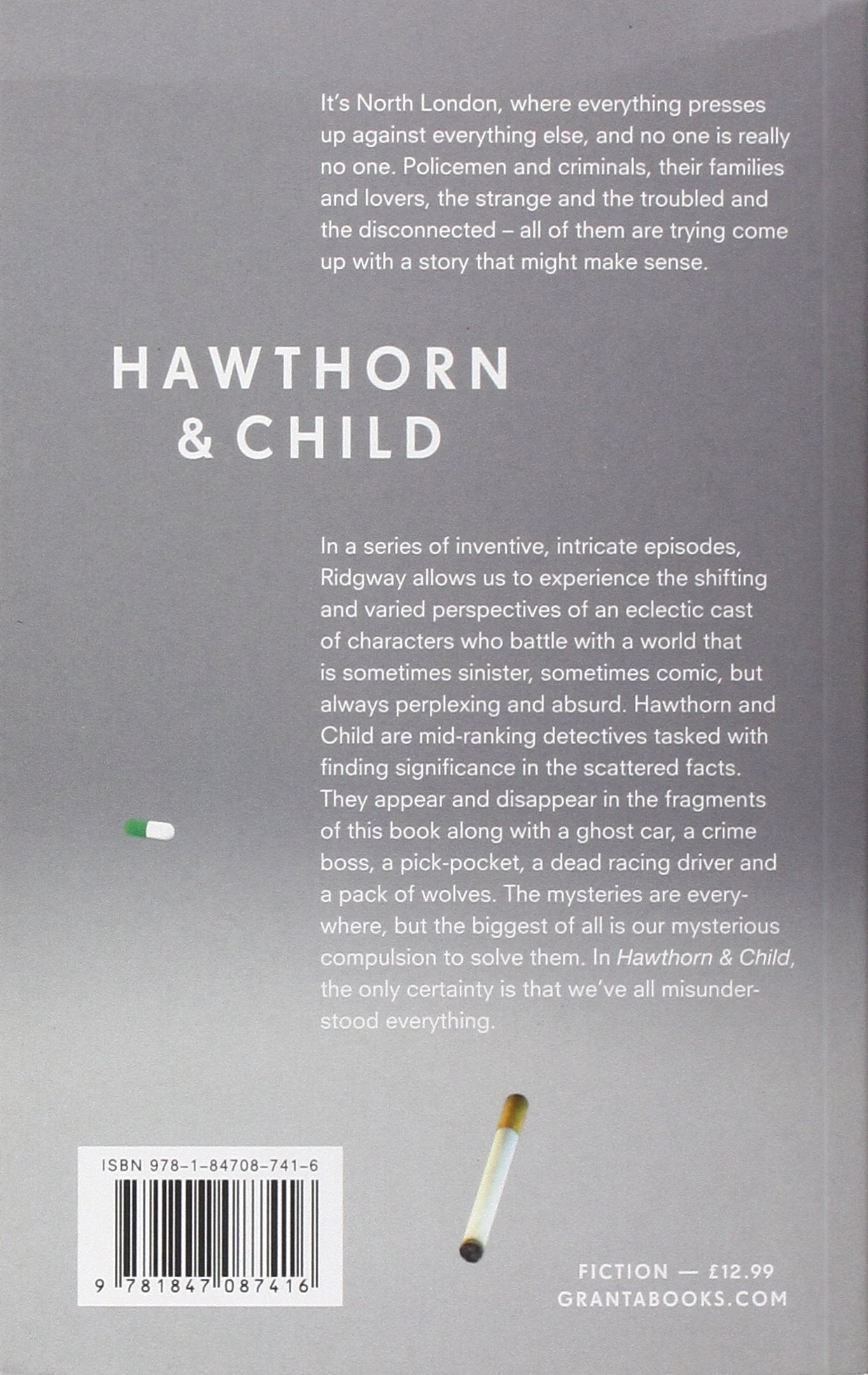 The two protagonists of the title are mid-ranking policemen operating amongst London's criminal classes, but each is plagued by dreams of elsewhere and, in the case of Hawthorn, a nightlife of visceral intensity that sits at odds with his carefully-composed placid family mask but has the habit of spilling over into his working life as a policeman. Ridgway has much to say, through showing not telling, about male violence, crowd psychology, the borders between play and abuse, and the motivations of policemen and criminals. But this is no humdrum crime novel. Ridgway is writing about people whose understanding of their own situations is only partial and fuzzy, who are consumed by emotions and motivations and narratives, or the lack thereof, that they cannot master. He focuses on peripheral figures to whom things happen, and happen confusingly, and his fictional strategies reflect this focus, so that his fictions themselves have an air of incompleteness and frustration about them. It's a high-wire act for a novelist but one that commands attention and provokes the dropping of jaws.