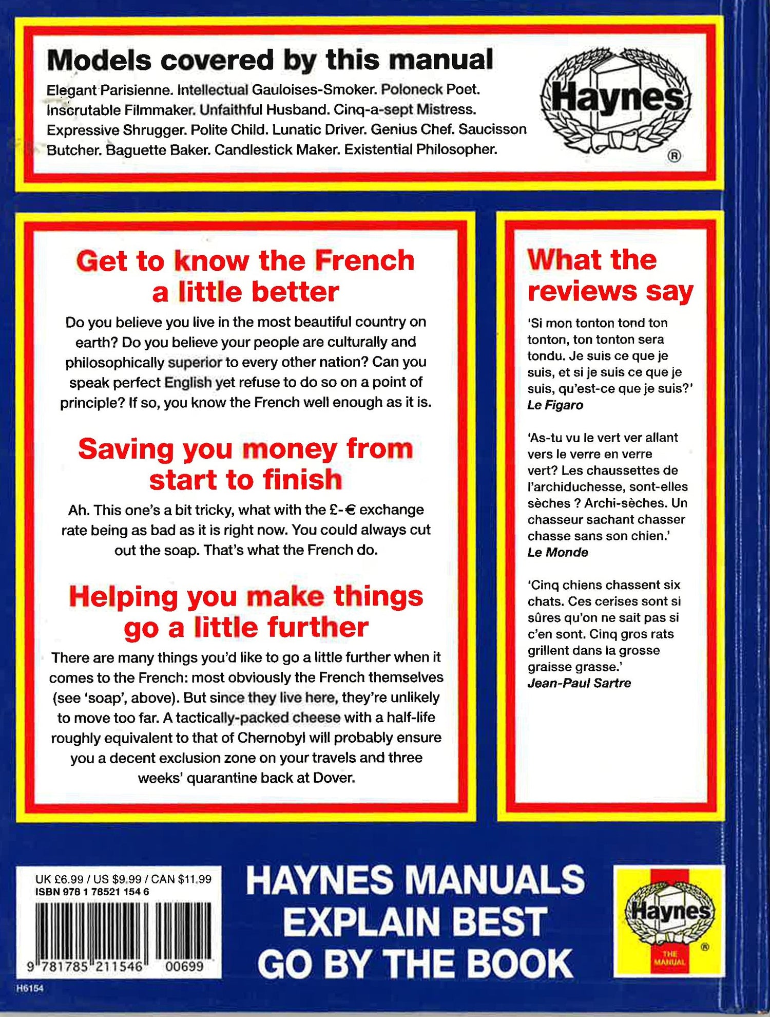 Written by bestselling author Boris Starling, The French is one of the new titles for 2017 in the Haynes Explains series. A light-hearted and entertaining take on the classic workshop manual, it contains everything you?d expect to see, including exploded views, flow charts, fault diagnosis and the odd wiring diagram. It takes the reader through all areas of French life, giving all the hints and tips needed to make cross-channel relationships run smoothly.