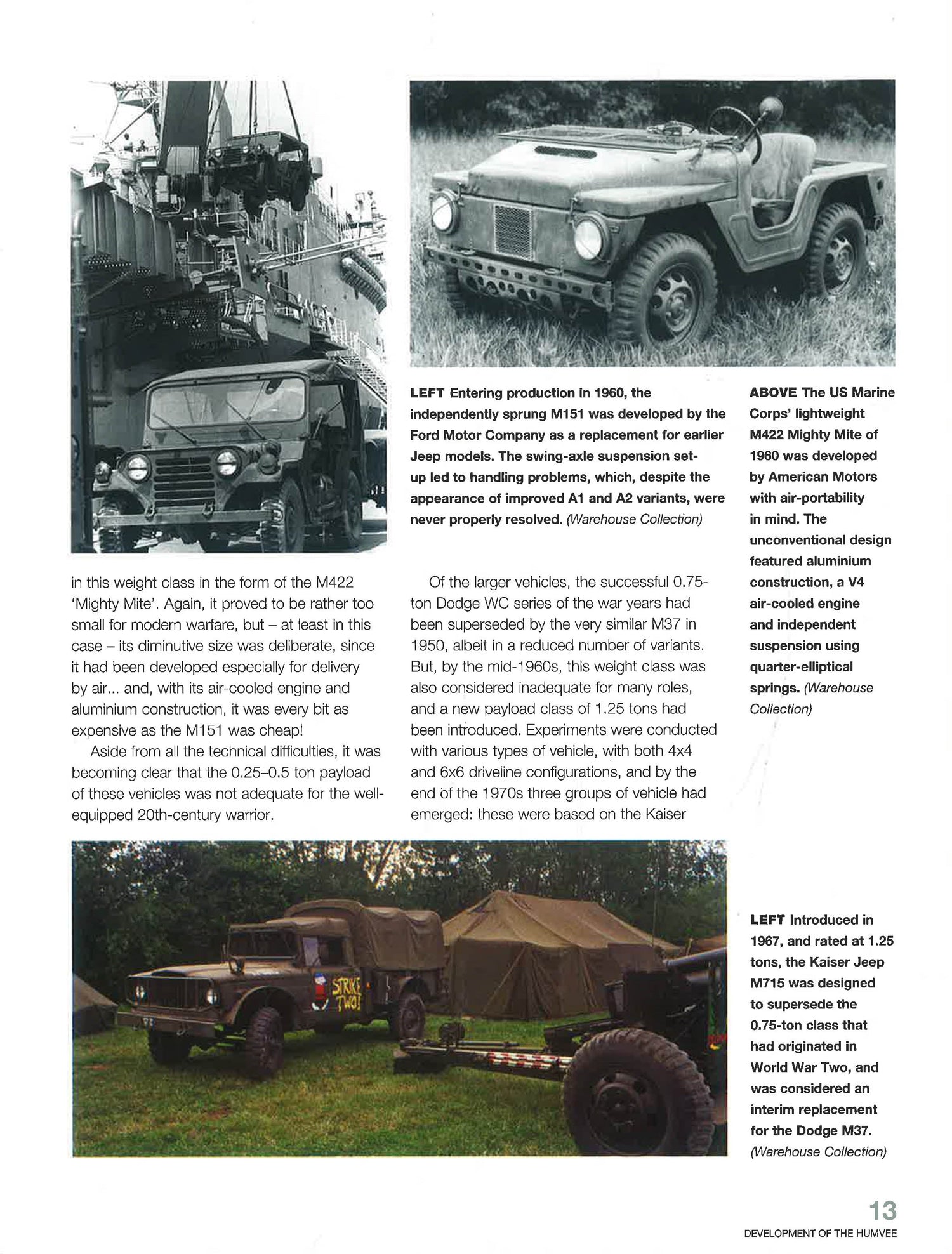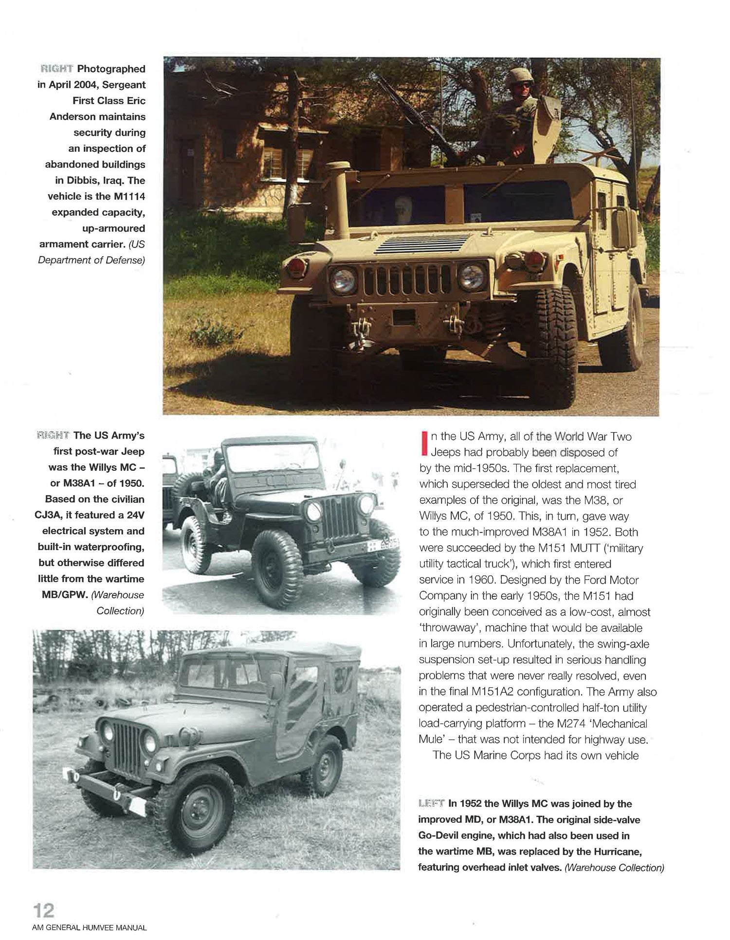 The Humvee, the modern-day US military four-wheel-drive successor to the Willys Jeep, is used by numerous armed forces around the world and in some civilian adaptations. Over 10,000 Humvees were deployed in numerous roles by coalition forces during the Iraq war. At least 25 variants of this highly versatile vehicle have been produced, from unarmoured light transport to surface-to-air missile platform, including ambulances, tracked versions, troop carriers and special ops variants. This manual provides a unique insight into the world of military Humvees, with an emphasis on military operation and equipment.