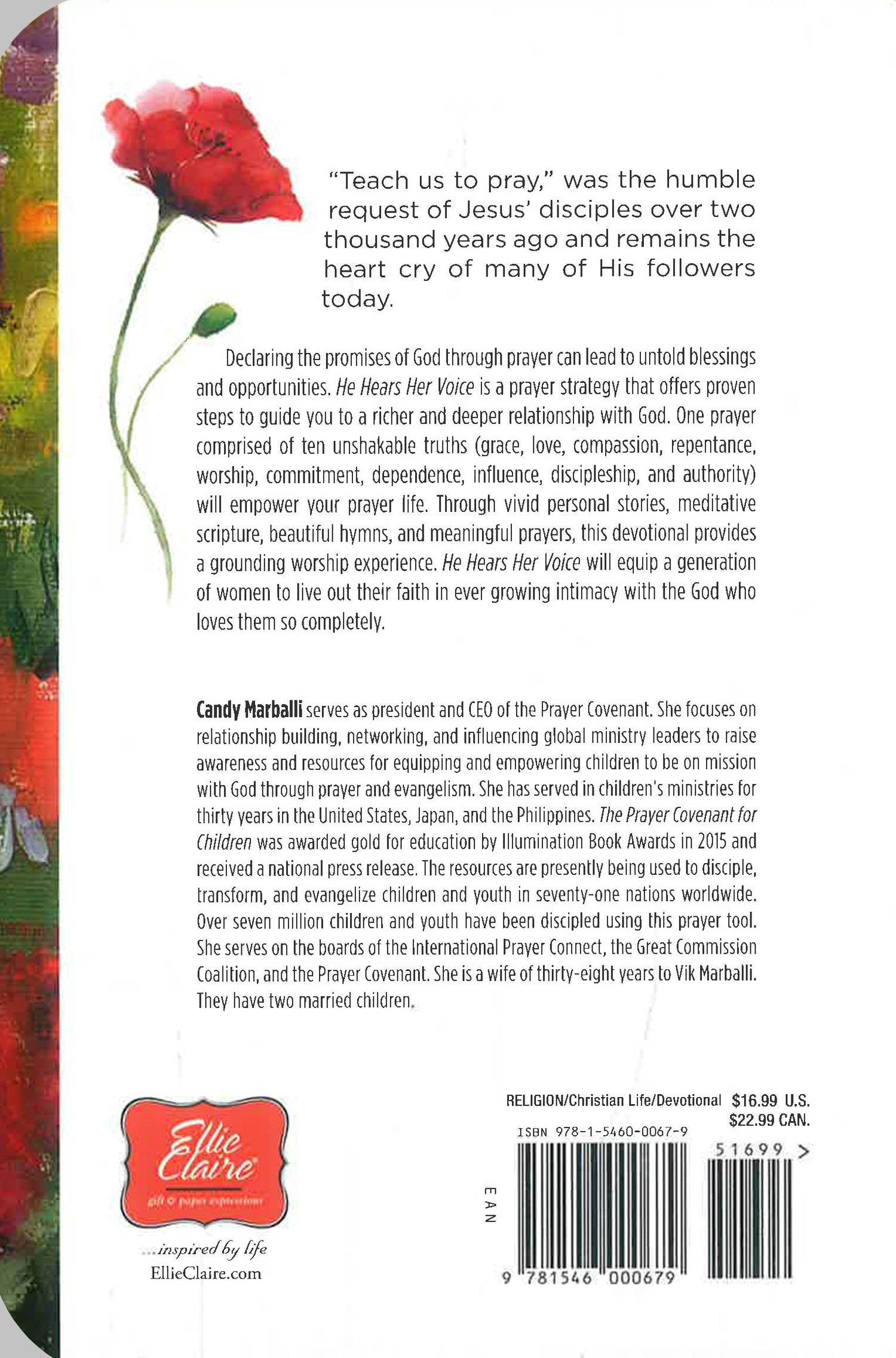 Candy Marballi discovered that declaring the promises of God through prayer led to untold blessings and opportunities. One prayer comprised of ten themes (grace, love, compassion, repentance, worship, commitment, dependence, influence, discipleship, and authority) will refresh your prayer-life. He Hears Her Voice is a prayer strategy that offers proven steps to guide you to a richer relationship with God. Filled with vivid personal stories, meditative scripture, beautiful hymns, and meaningful prayers, this devotional provides a grounding worship experience. He Hears Her Voice will change the way we pray-and equip a generation of women to live boldly in their faith.