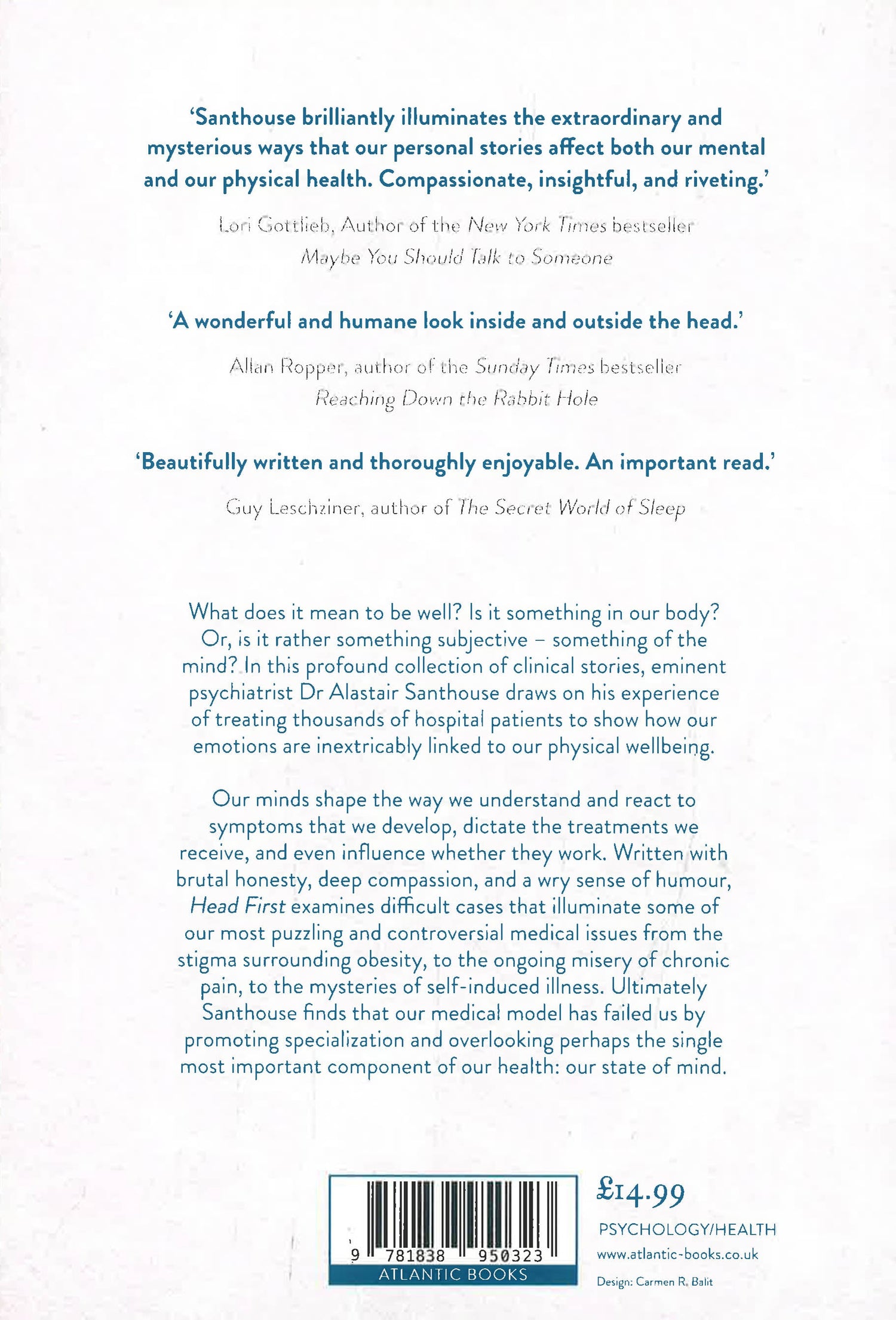 Wise, timely and eloquent... A joy to read.' GuardianWhat does it mean to be well? Is it something in our body? Or, is it rather something subjective - something of the mind? In this profound collection of clinical stories, eminent psychiatrist Dr Alastair Santhouse draws on his experience of treating thousands of hospital patients to show how our emotions are inextricably linked to our physical wellbeing. Our minds shape the way we understand and react to symptoms that we develop, dictate the treatments we receive, and influence whether they work. They even influence whether we develop symptoms at all. Written with brutal honesty, deep compassion, and a wry sense of humour, Head First examines difficult cases that illuminate some of our most puzzling and controversial medical issues-from the tragedy of suicide, to the stigma surrounding obesity, to the ongoing misery of chronic fatigue. Ultimately he finds that our medical model has failed us by promoting specialization and overlooking perhaps the single most important component of our health: our state of mind.